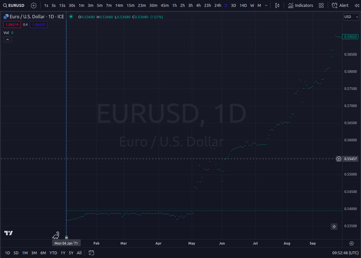 为什么FX_IDC:EURUSD图表上的历史数据会转到1971年?