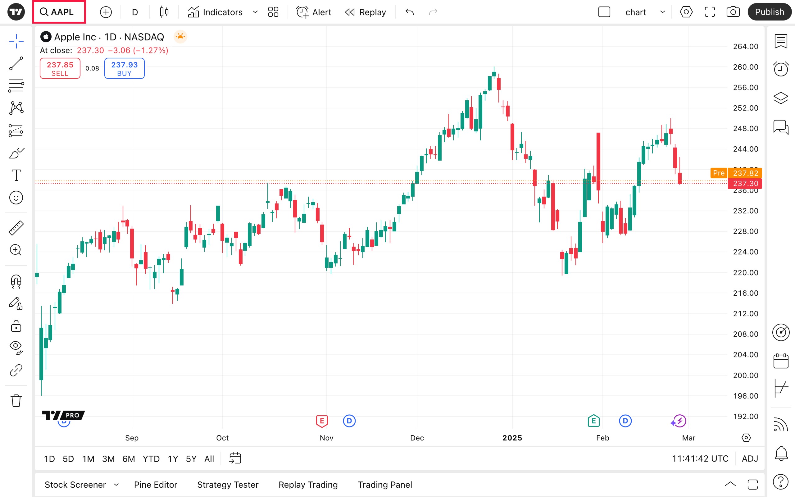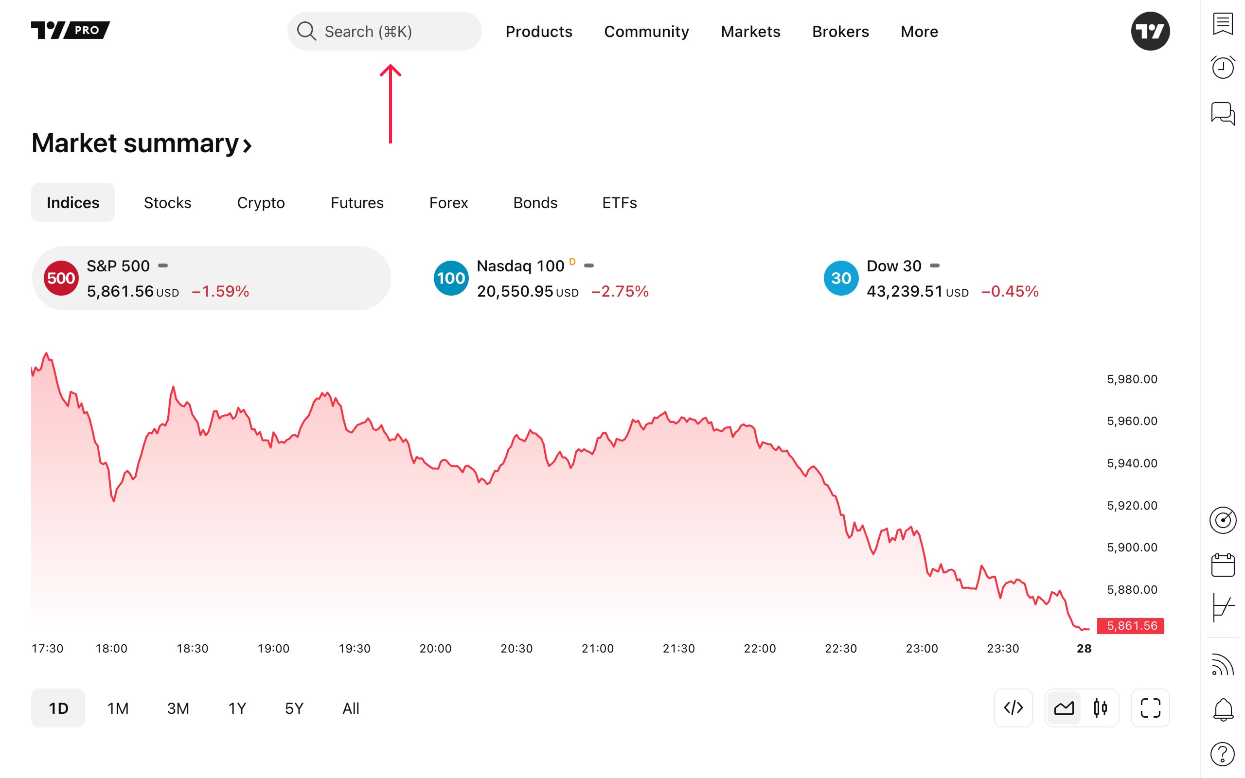 在超级图表上,商品代码搜索按钮位于上方工具栏的左侧,但您也可以通过简单地开始输入来打开搜索窗口。