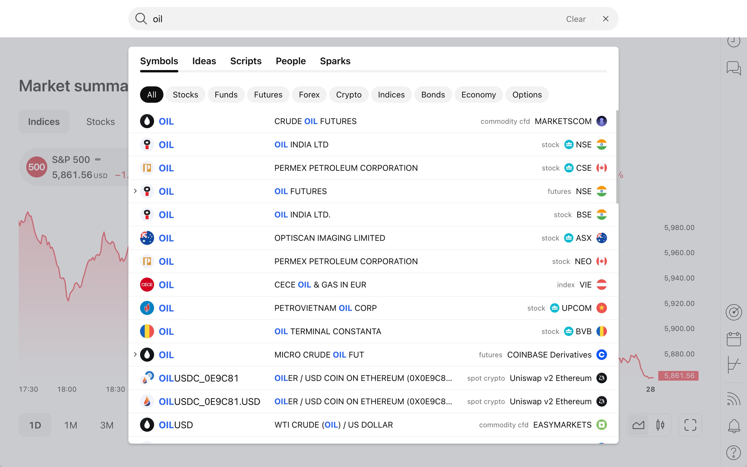 如果您按“OIL”等商品字符进行搜索,请确保通过检查其描述来选择正确的代码,因为不同商品的股票代码/名称可能包含相同的字符,甚至完全相同。