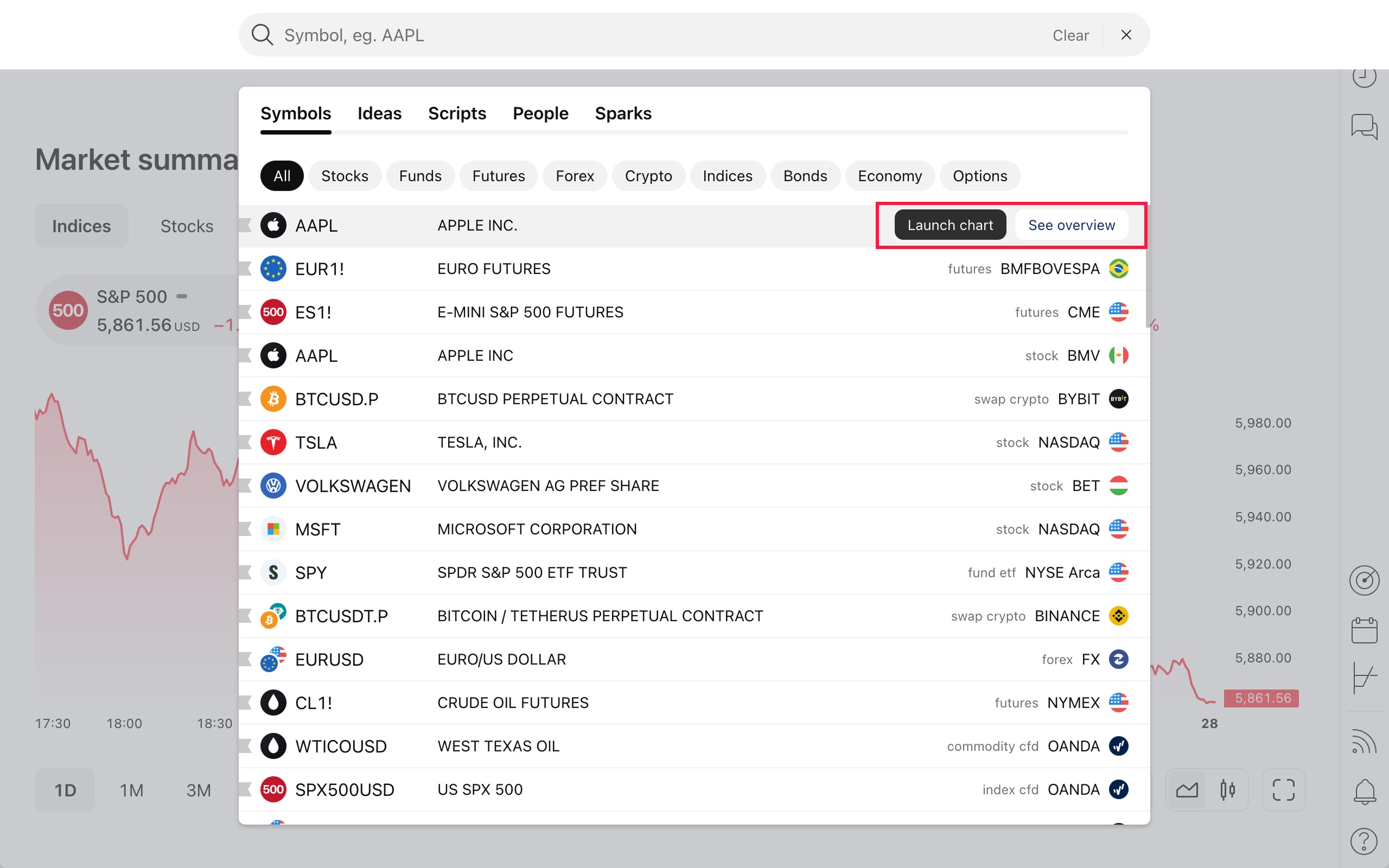 - Launch chart. It’ll open our Superchart where you can analyze the selected symbol.