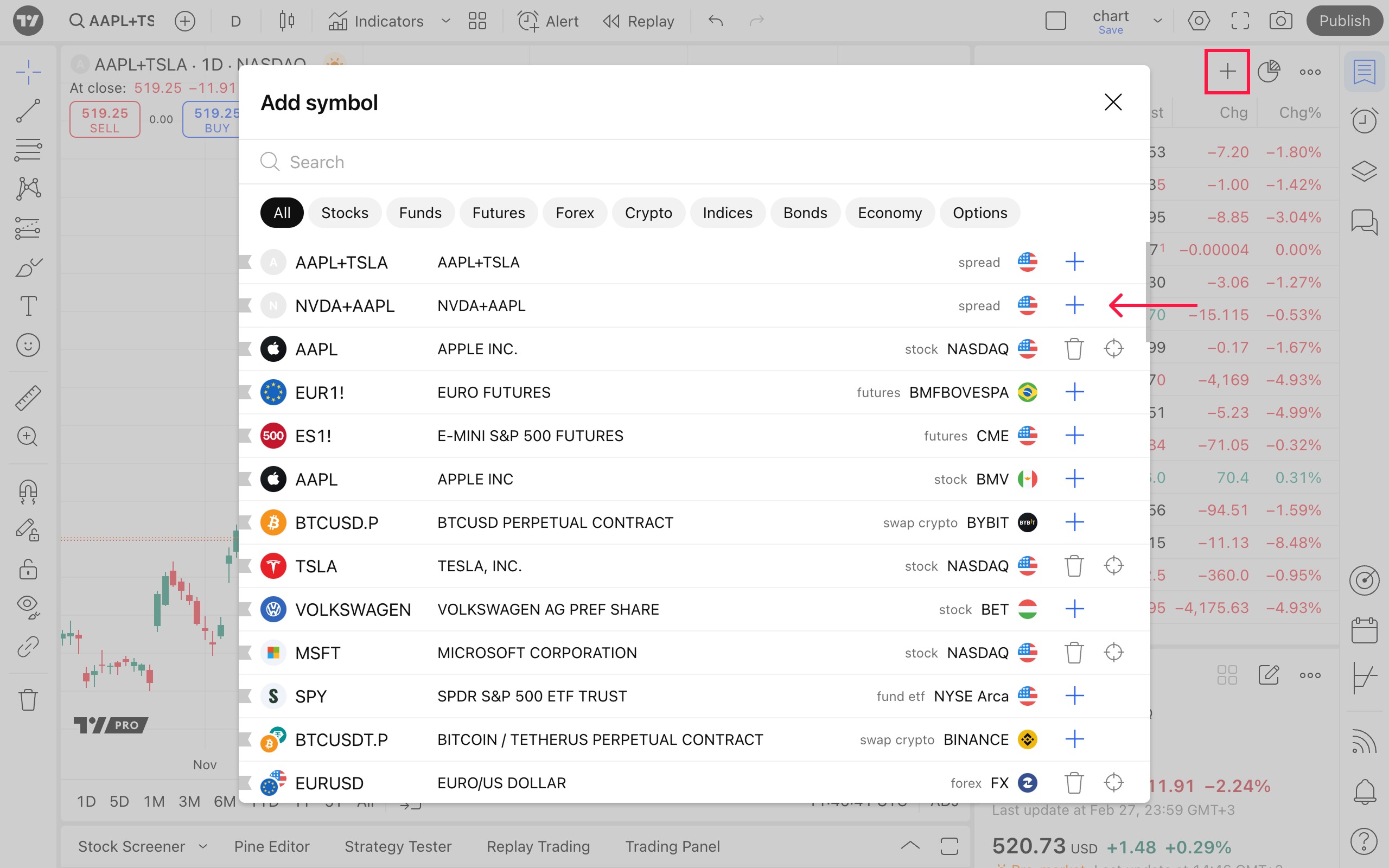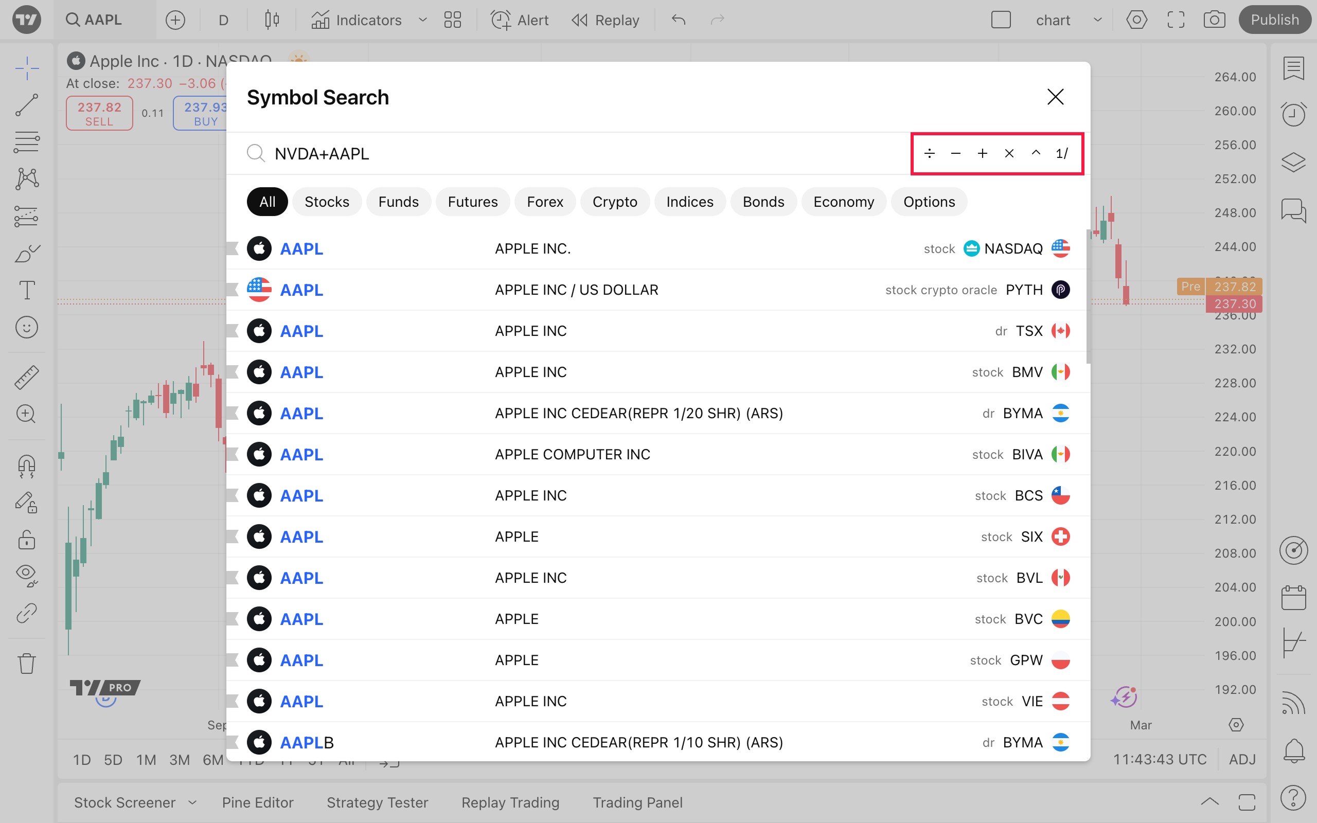 另一个不同之处在于,您可以构建由不同符号组成的各种类型的方程式。比如,您想知道 Nvidia 和 Apple 股票的复合价格是多少。为此,只需输入 NVDA+AAPL 并按 Enter 键即可。