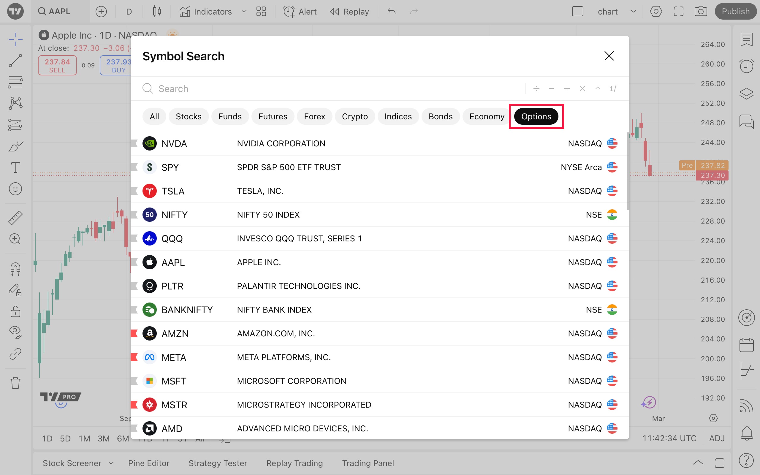 从图表中查找商品代码时,一个主要区别是“期权”标签。在这里,它不是打开特定合约的列表,而是打开标的资产,当您单击其中一个时,您会看到期权链,其中包含有关看涨和看跌以及ask和bid价格、隐含波动率等的信息。