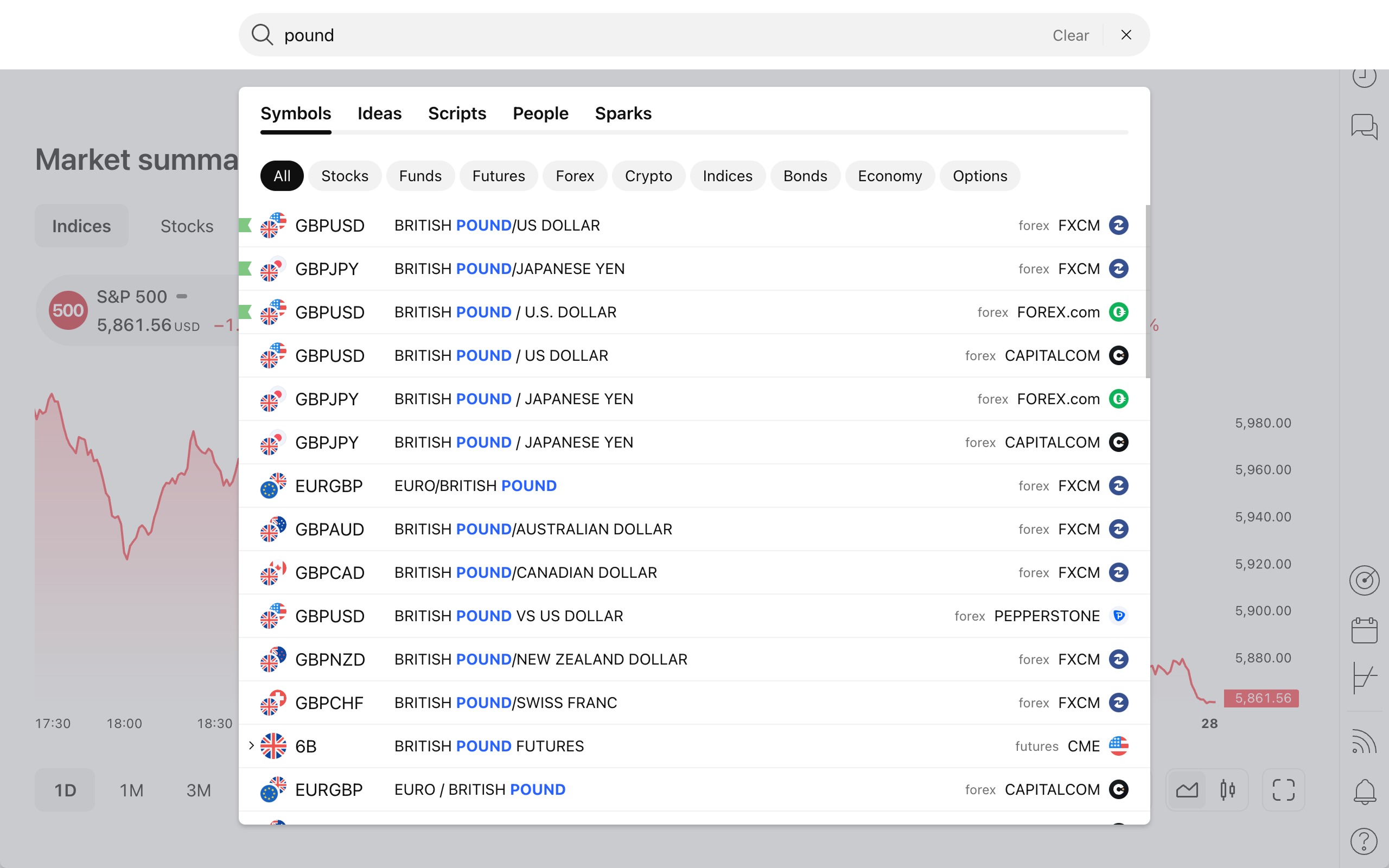 在搜索框中,输入确切的商品代码或与您要查找的代码相关的术语。例如,英镑的代码是 GBP,但您只需输入“pound”,所有与英镑相关的商品就会出现。