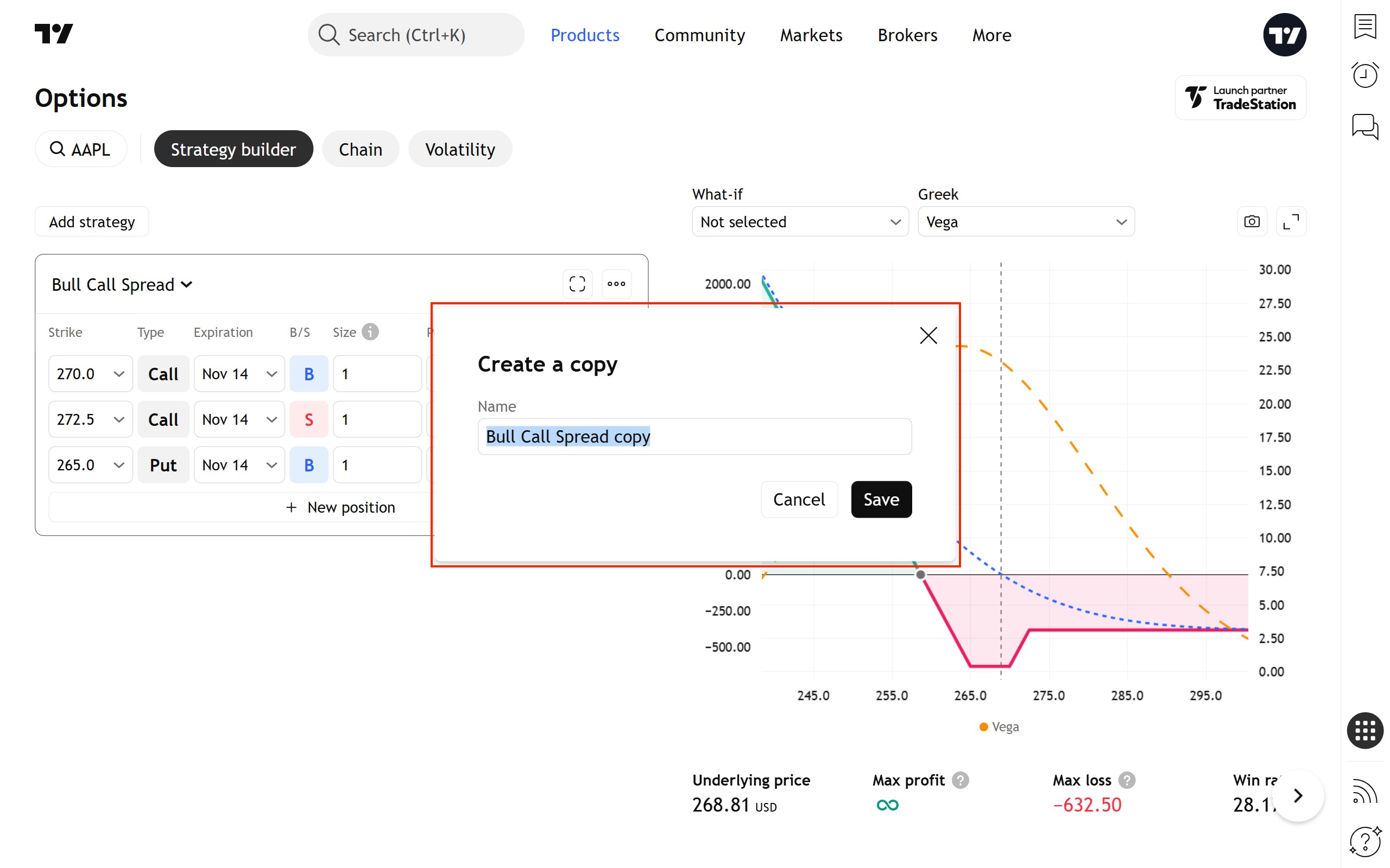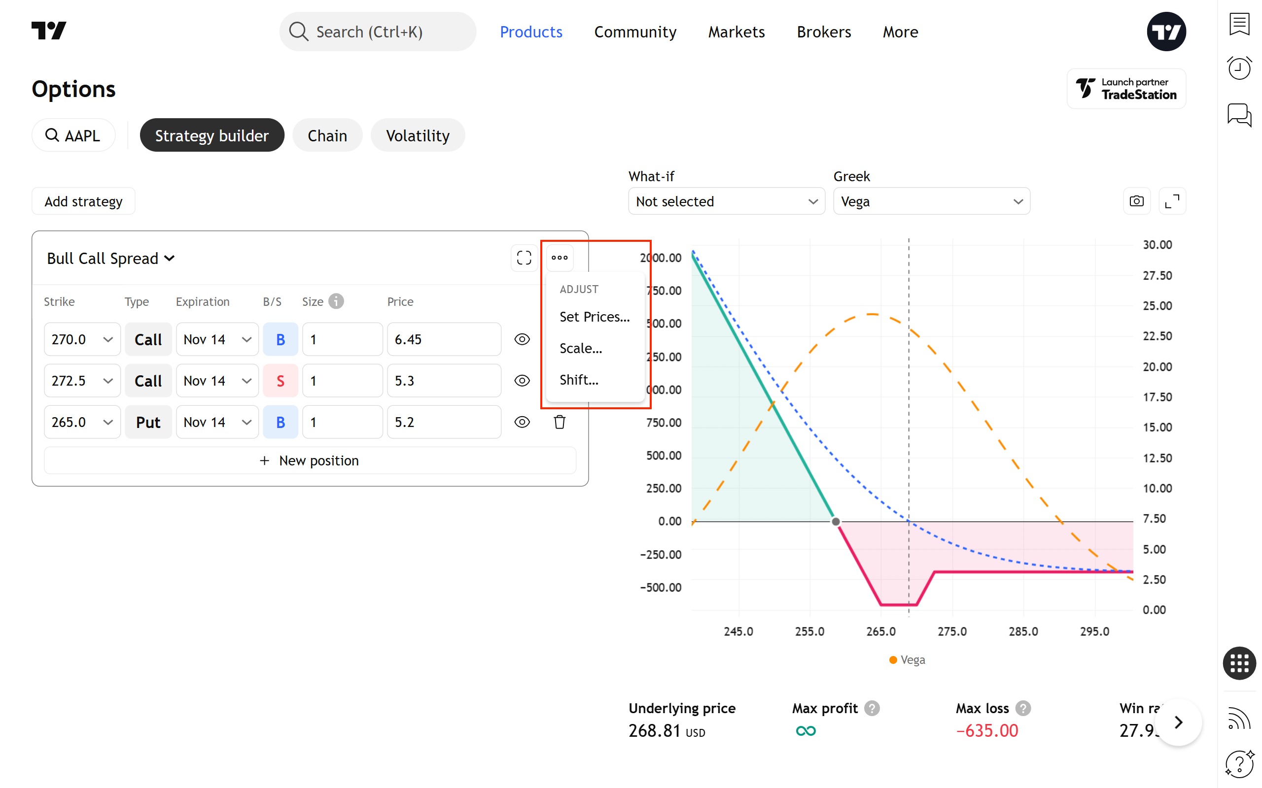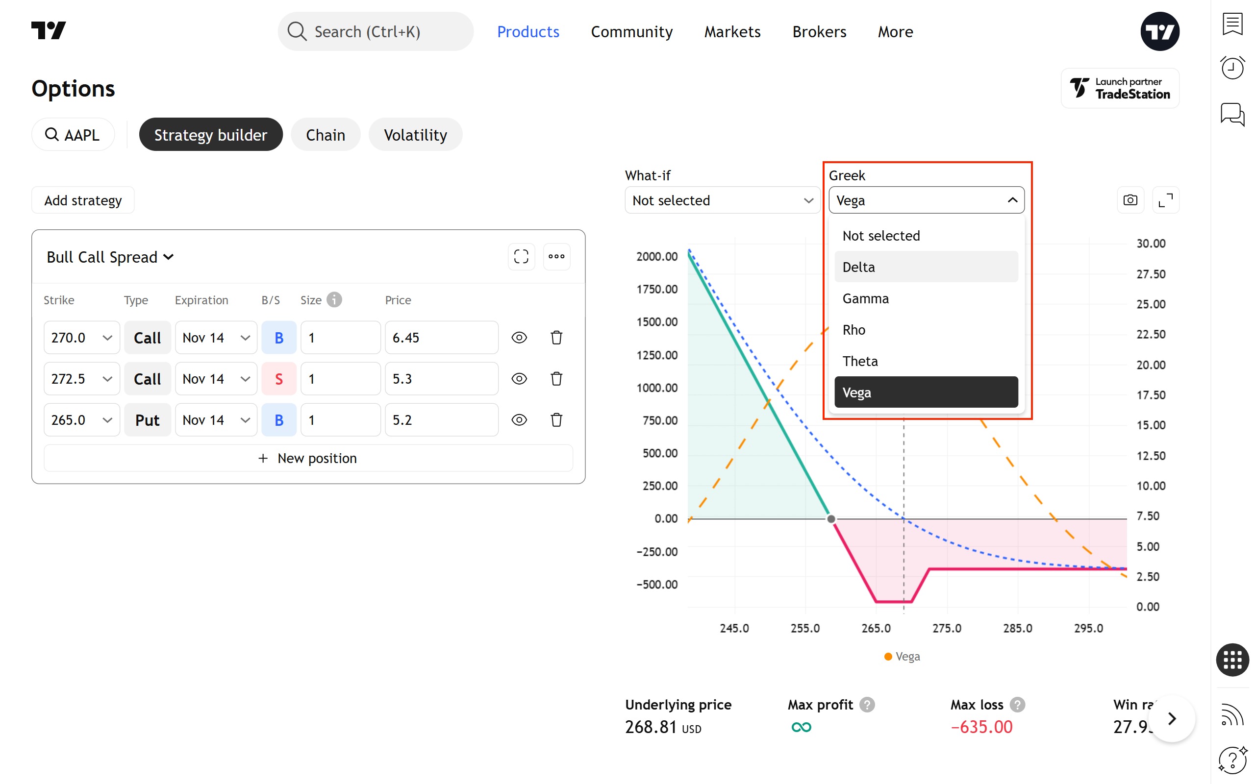 您可以使用图表上方的控件修改此虚拟策略——更改到期日、行权价、规模和其他参数。