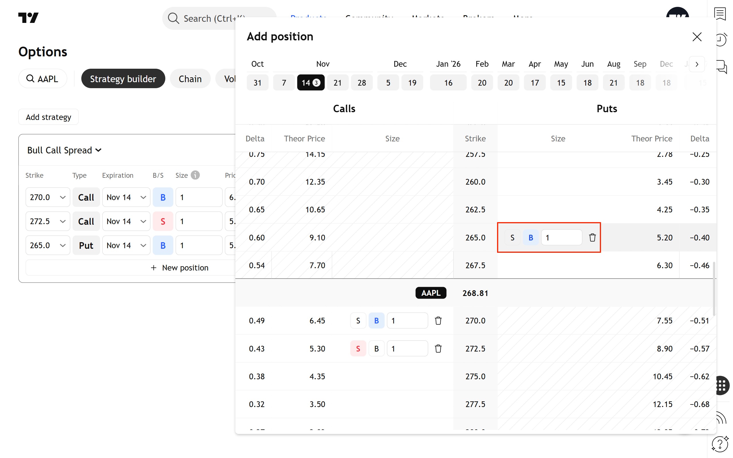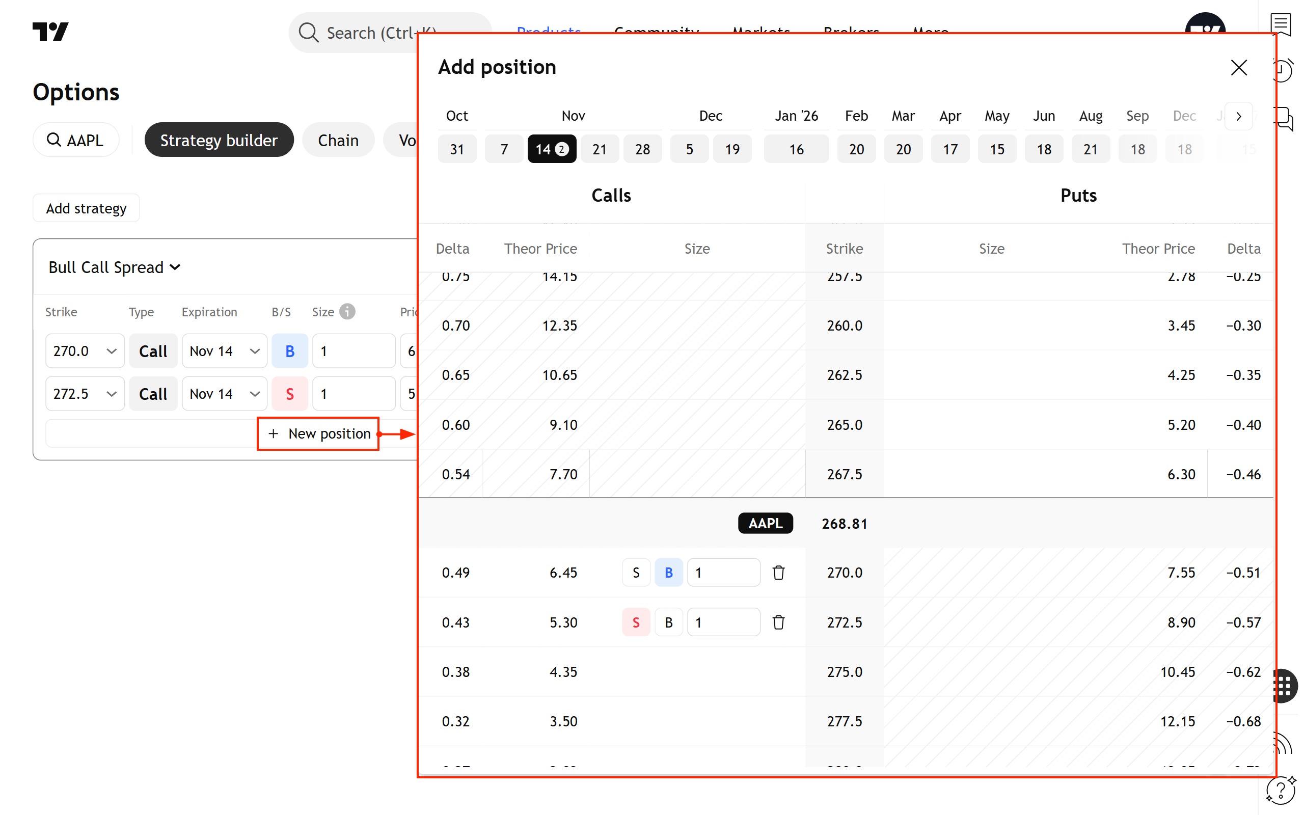 首先,您应该尝试在策略中添加新的仓位。点击仓位表下方的“+ 新建仓位”按钮。此时会弹出一个对话框,其中包含一个特殊版本的期权链。该期权链不包含常规期权链中的大部分数据。取而代之的是,它有一个“规模”列,用于显示现有仓位,并允许您添加或删除仓位。