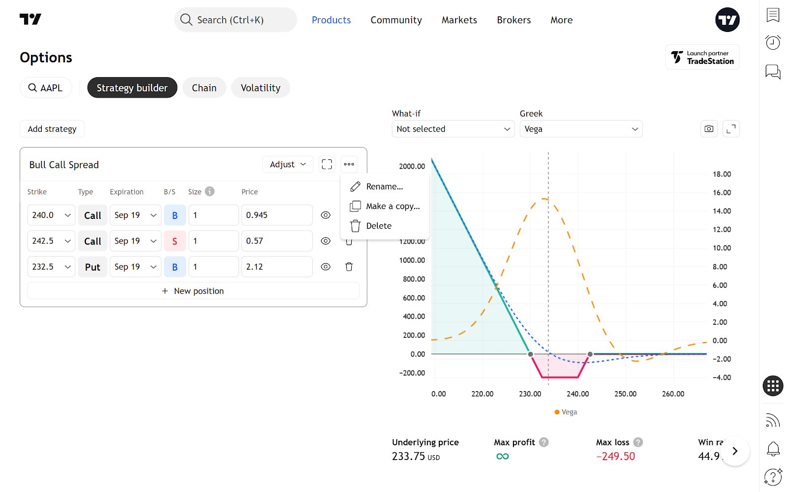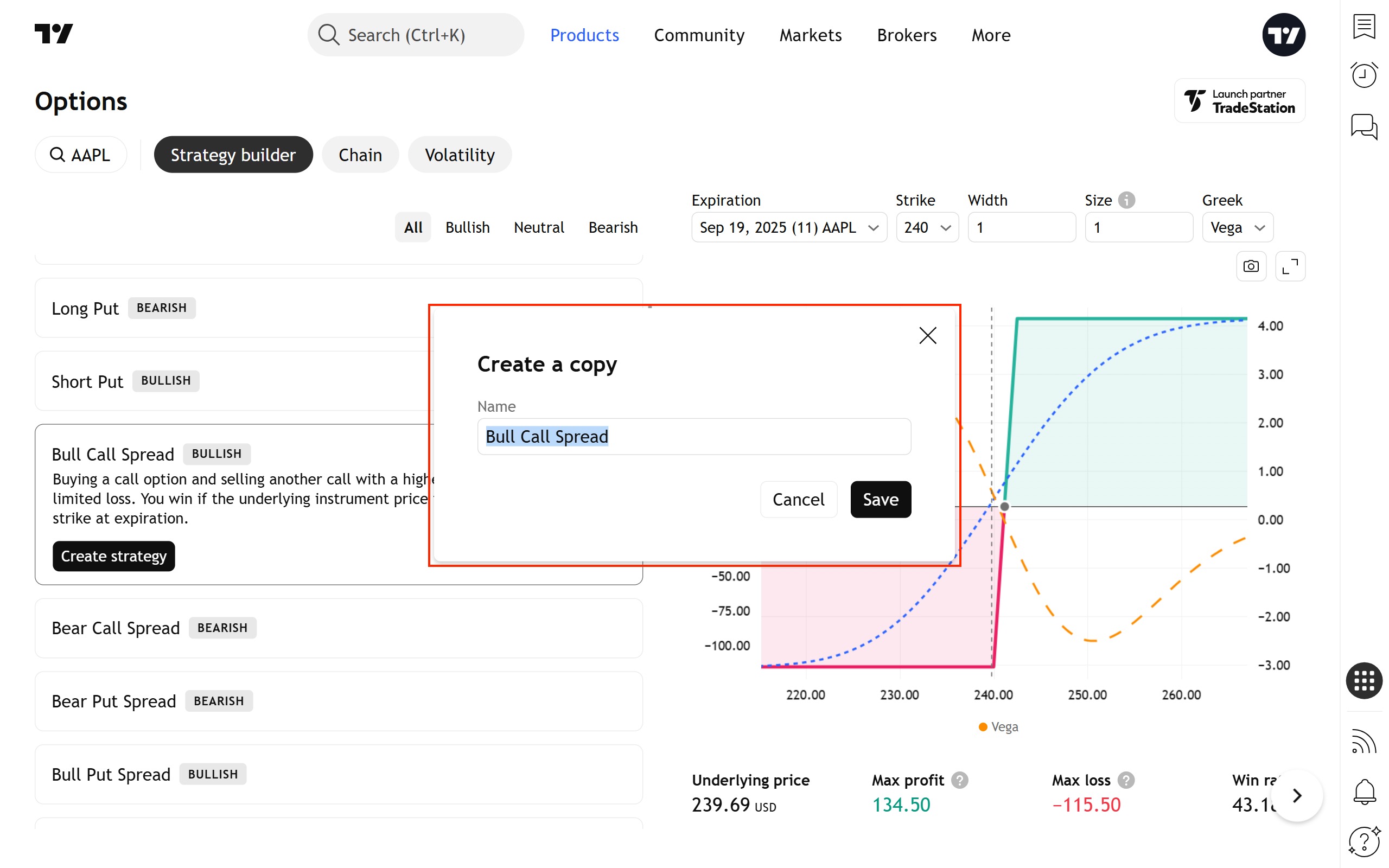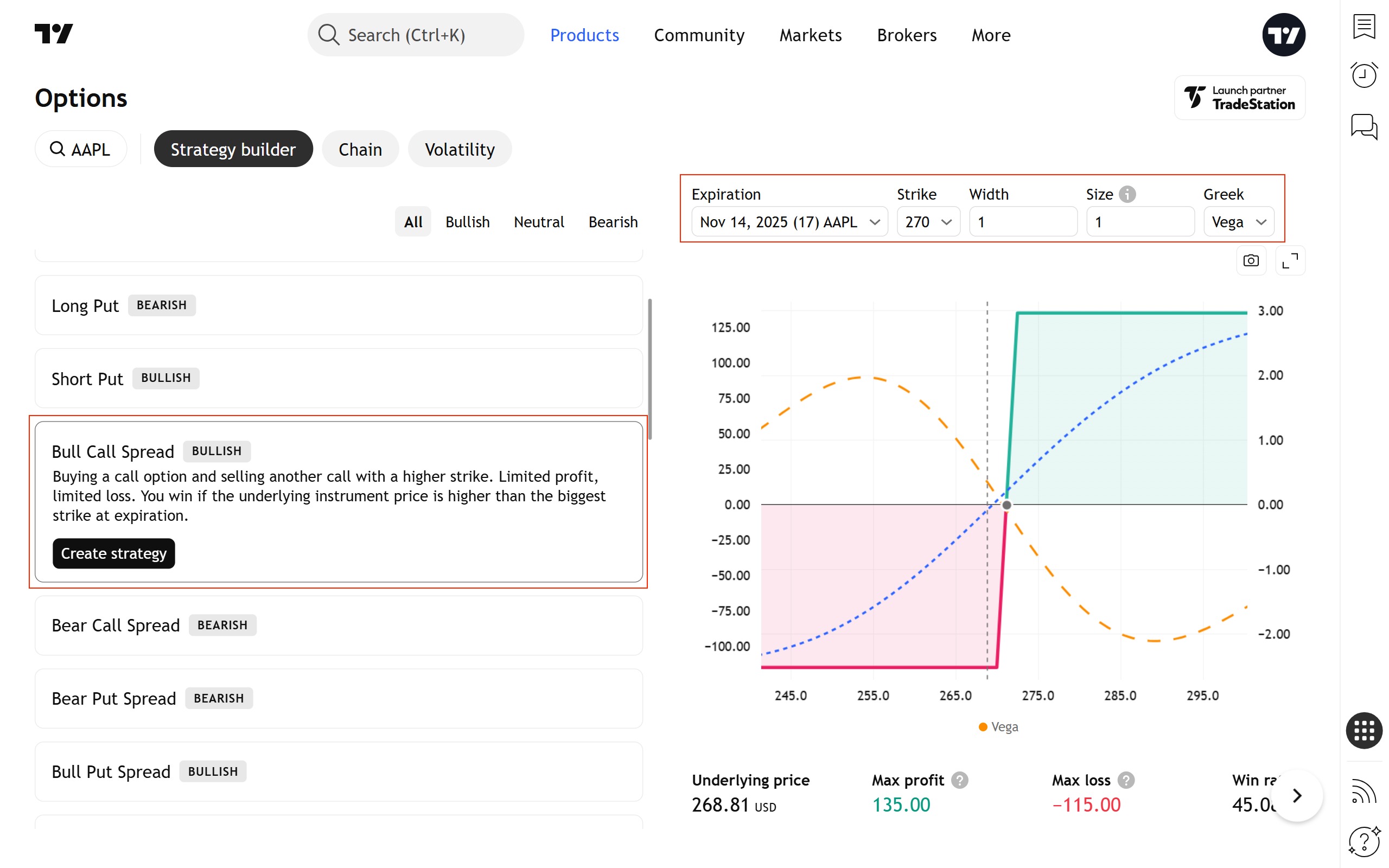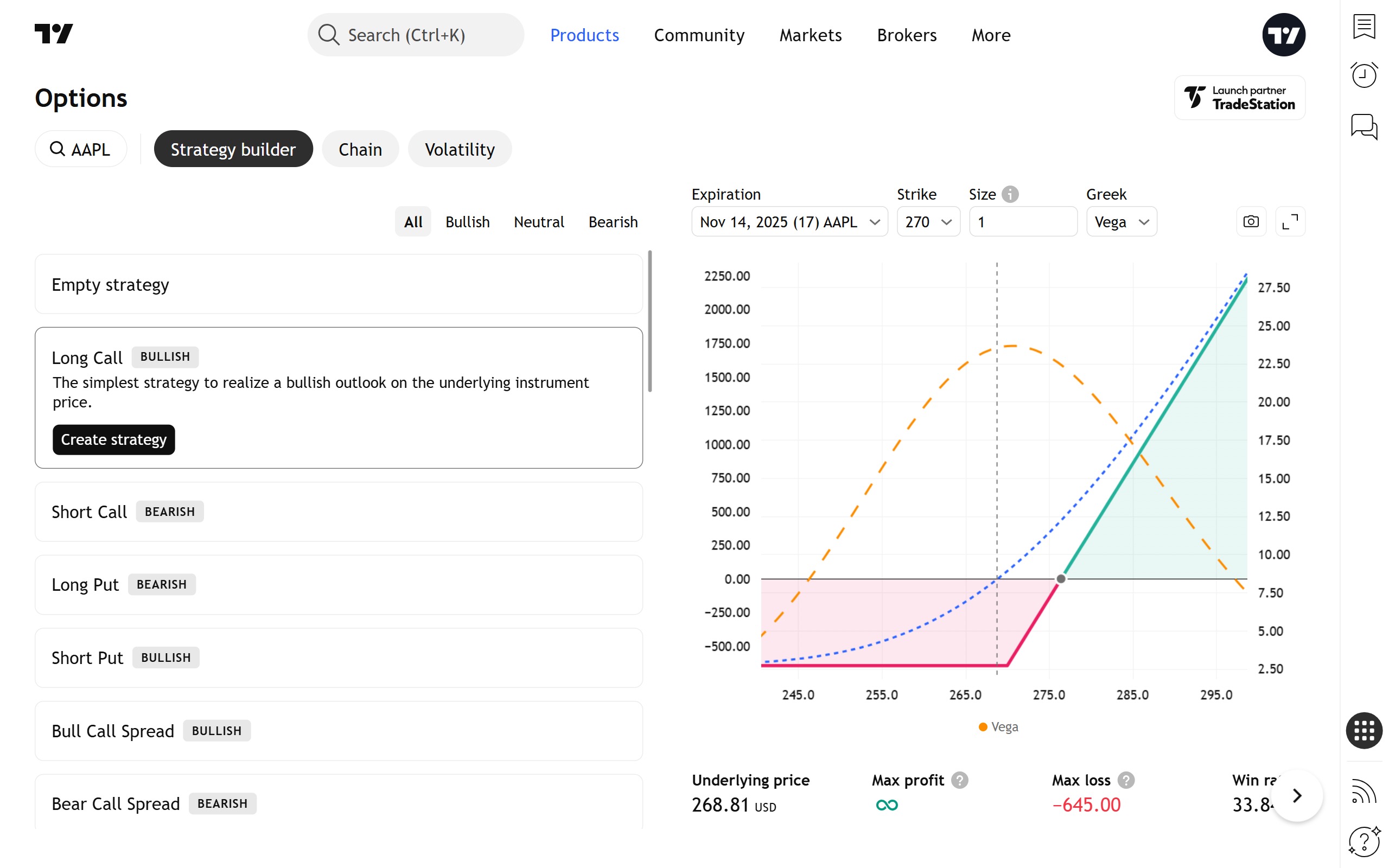 当您浏览标准策略列表时,构建器会创建一个所选策略的虚拟实例(使用最接近的到期日和接近平值期权的行权价),并在图表上呈现其风险曲线。