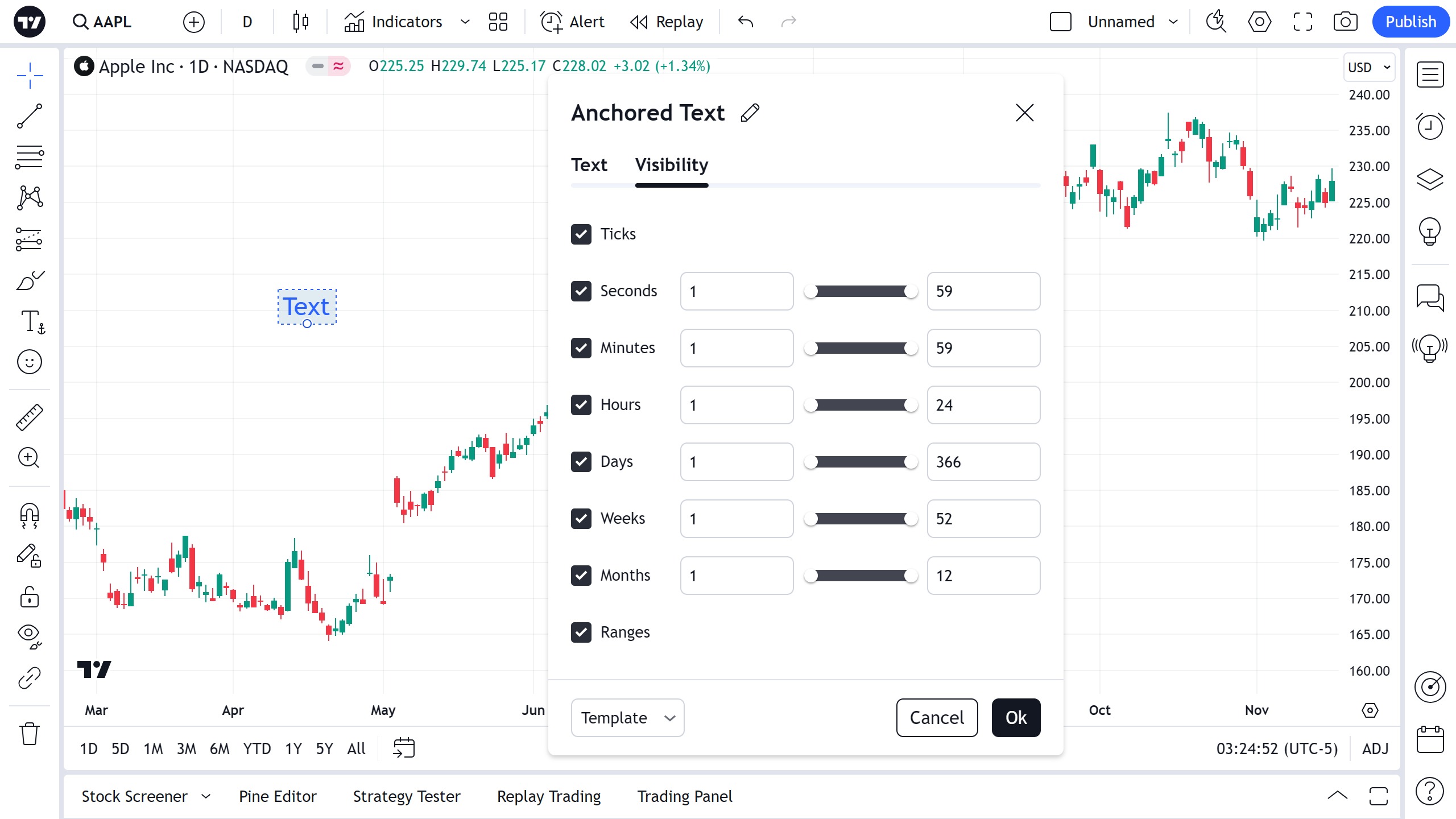 在可见性属性对话框中,您可以为不同时间周期的图表切换锚文本的显示。