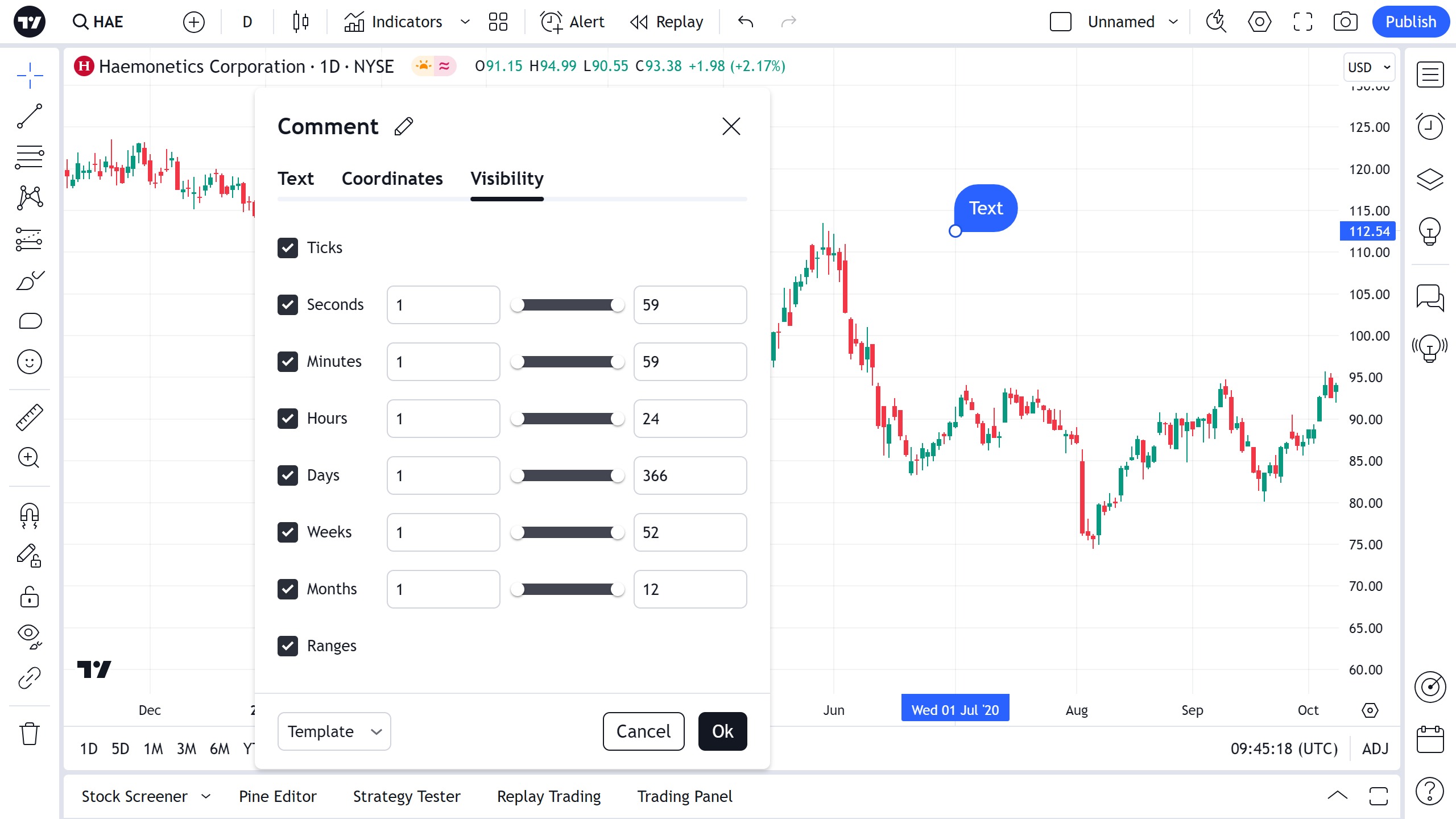 在可见性属性对话框中,您可以切换注释工具在不同时间周期的图表上的显示: