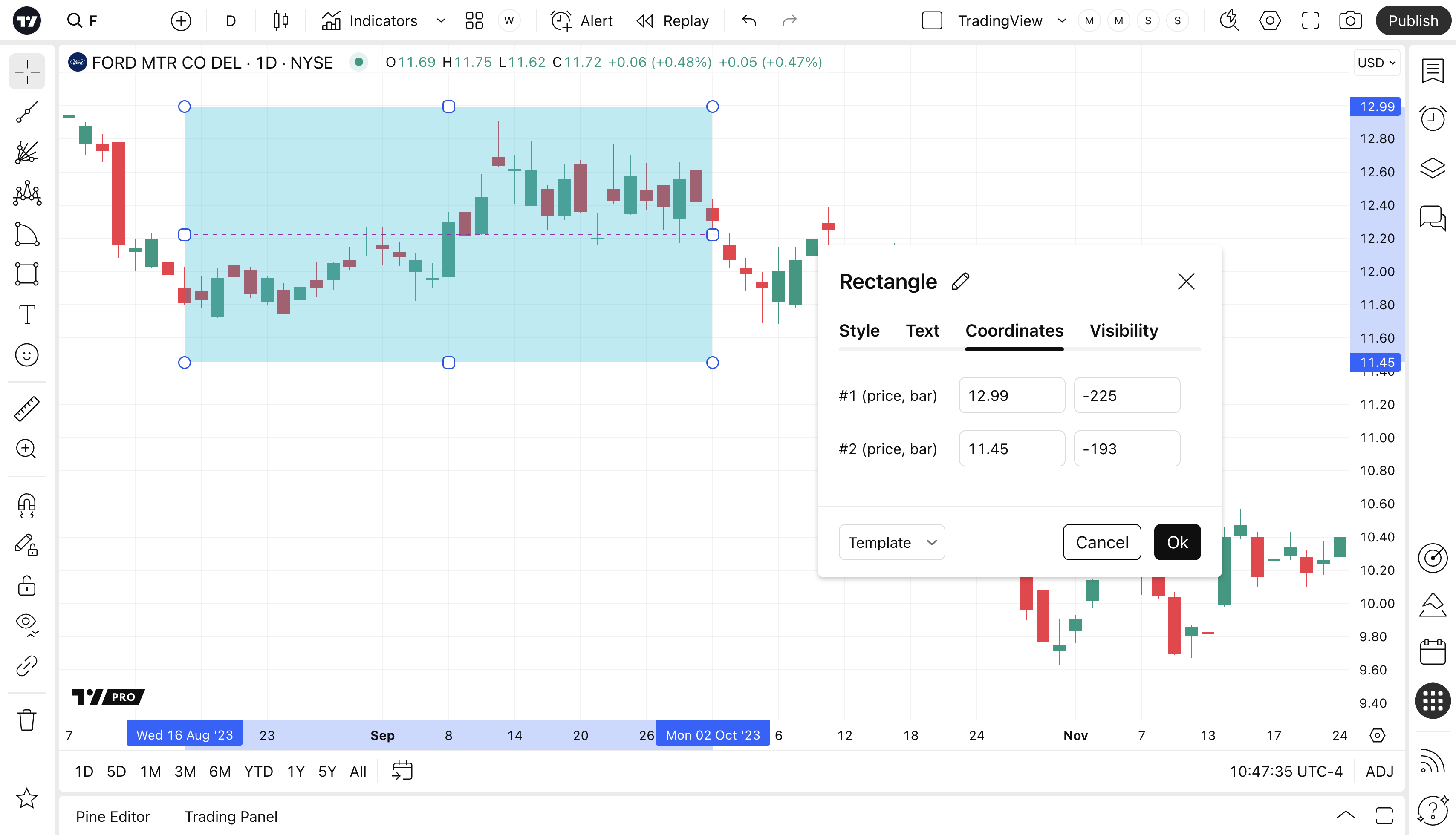 在坐标标签页的设置窗口中,您可以设置矩形点在价格坐标(通过设置价格)和时间轴(通过设置K线数)上的位置。