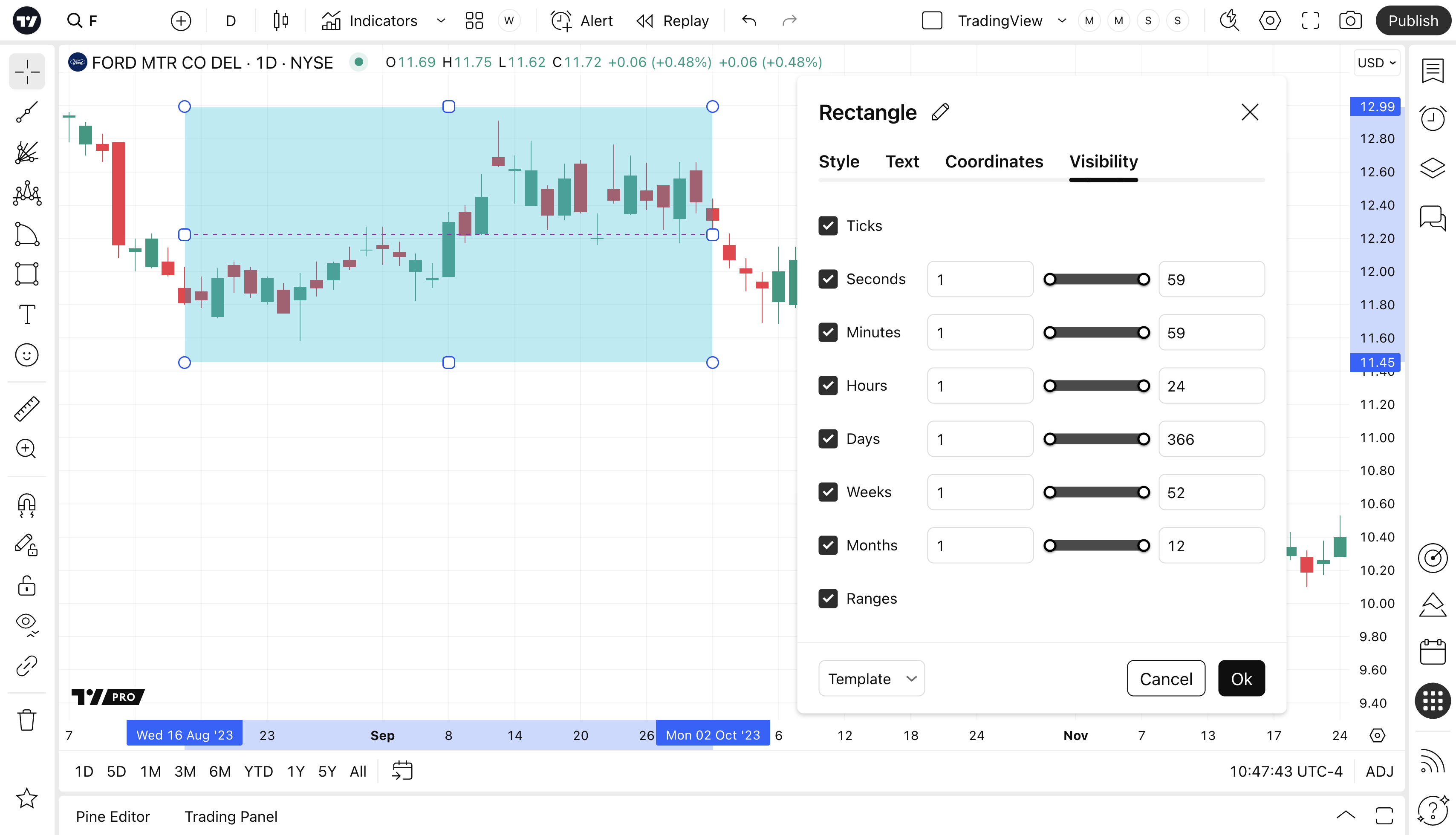 在设置窗口的可见性标签页上,您可以配置矩形在图表上显示的时间周期。