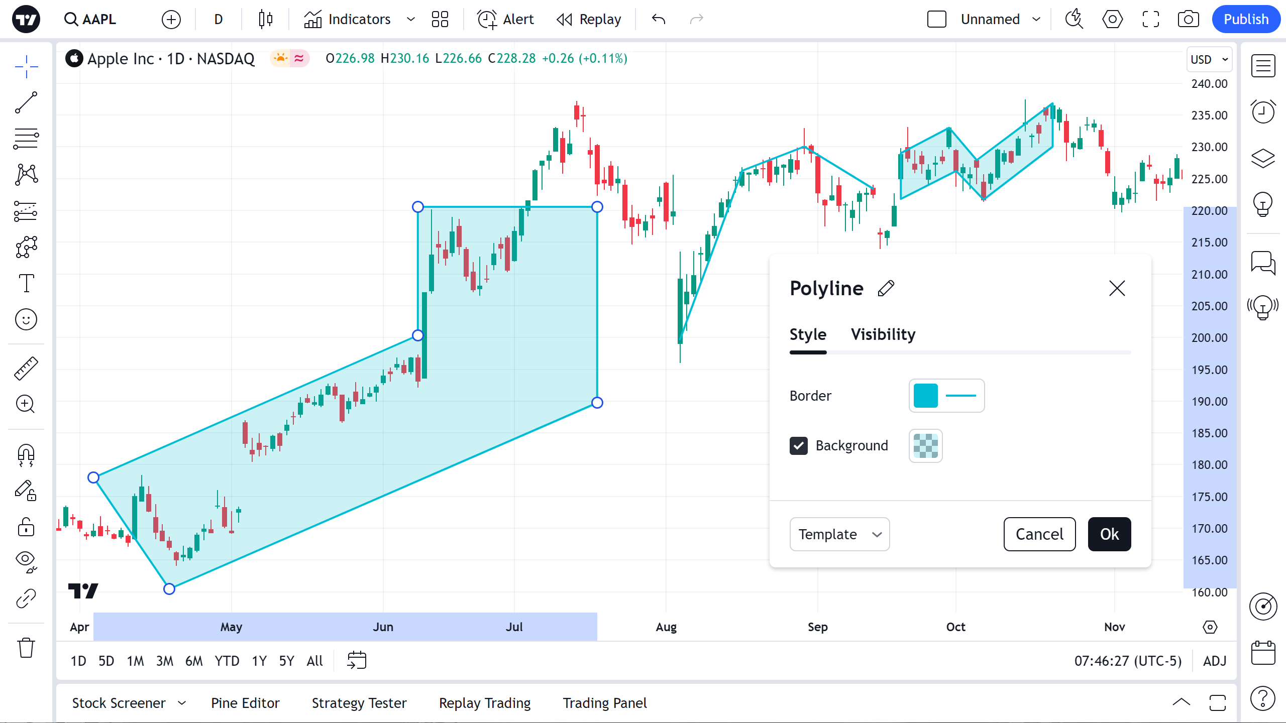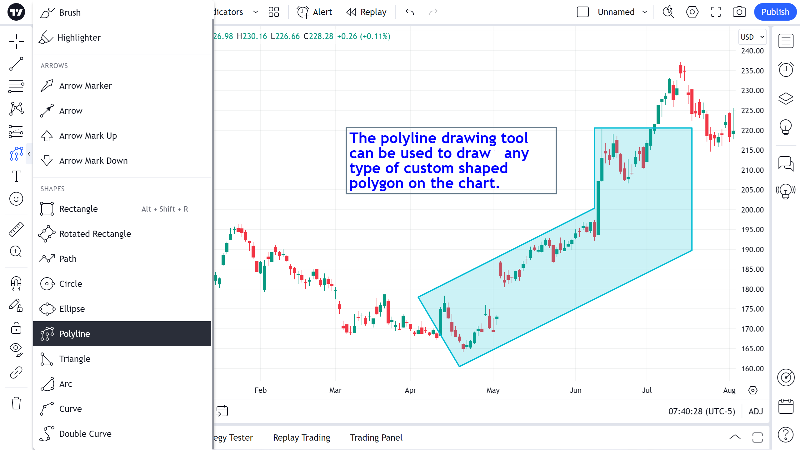 折线绘图工具是一种在使用直线的同时绘制自定义形状的方法。可以绘制任何由直线组成的形状,一旦最后一点与图形的第一点相连,形状就完成了。您也可以通过双击、右键单击或按Esc键来完成绘制折线 — 在这种情况下,形状将保持打开。