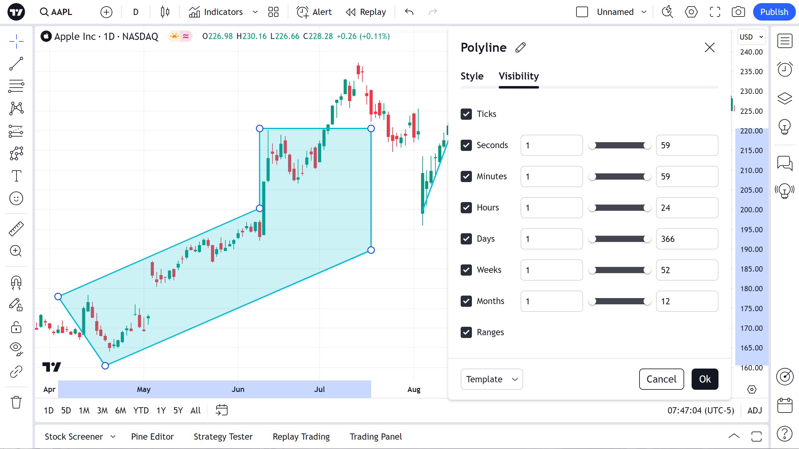 在可见性属性对话框中,您可以切换在不同时间周期的图表上显示的折线工具: