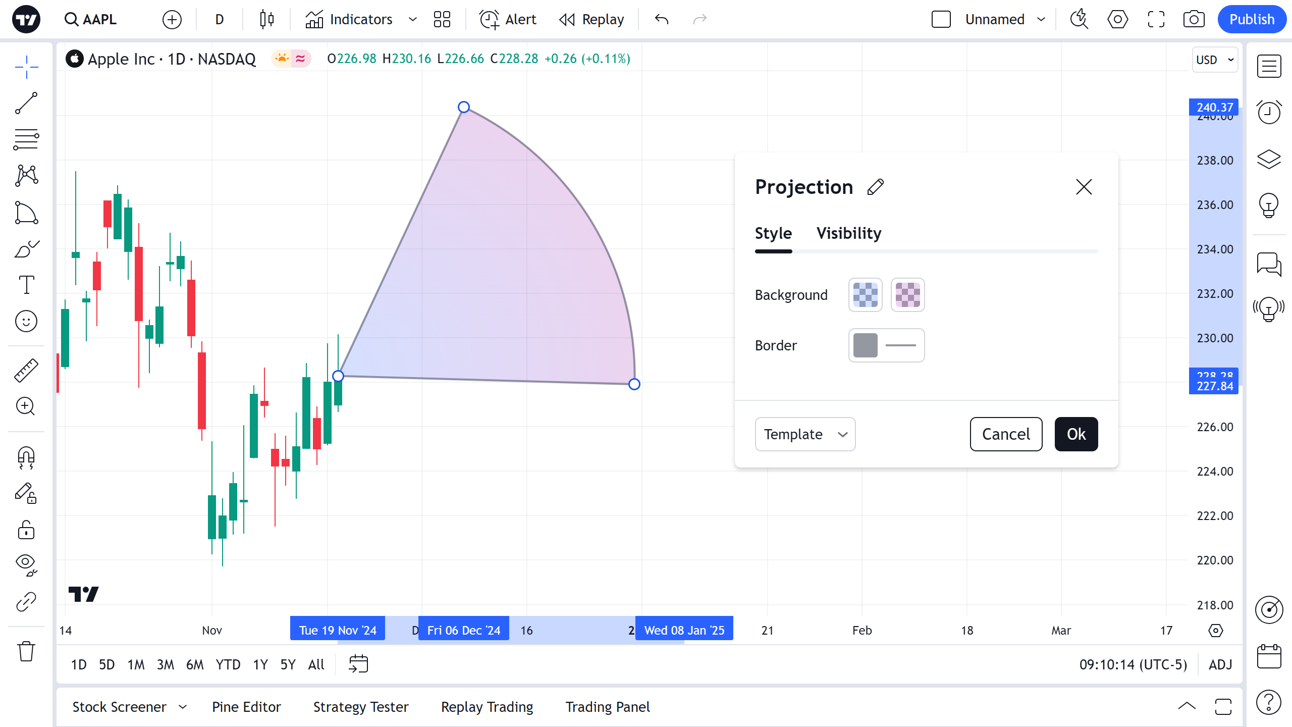 投影工具允许用户对未来的价格进行投影。用户在图表上放置一个原点。 第二个点必须放置(水平向右移动)在未来的某个地方。 最后,第三点应该放在预估价位。这样就完成了投影绘图。