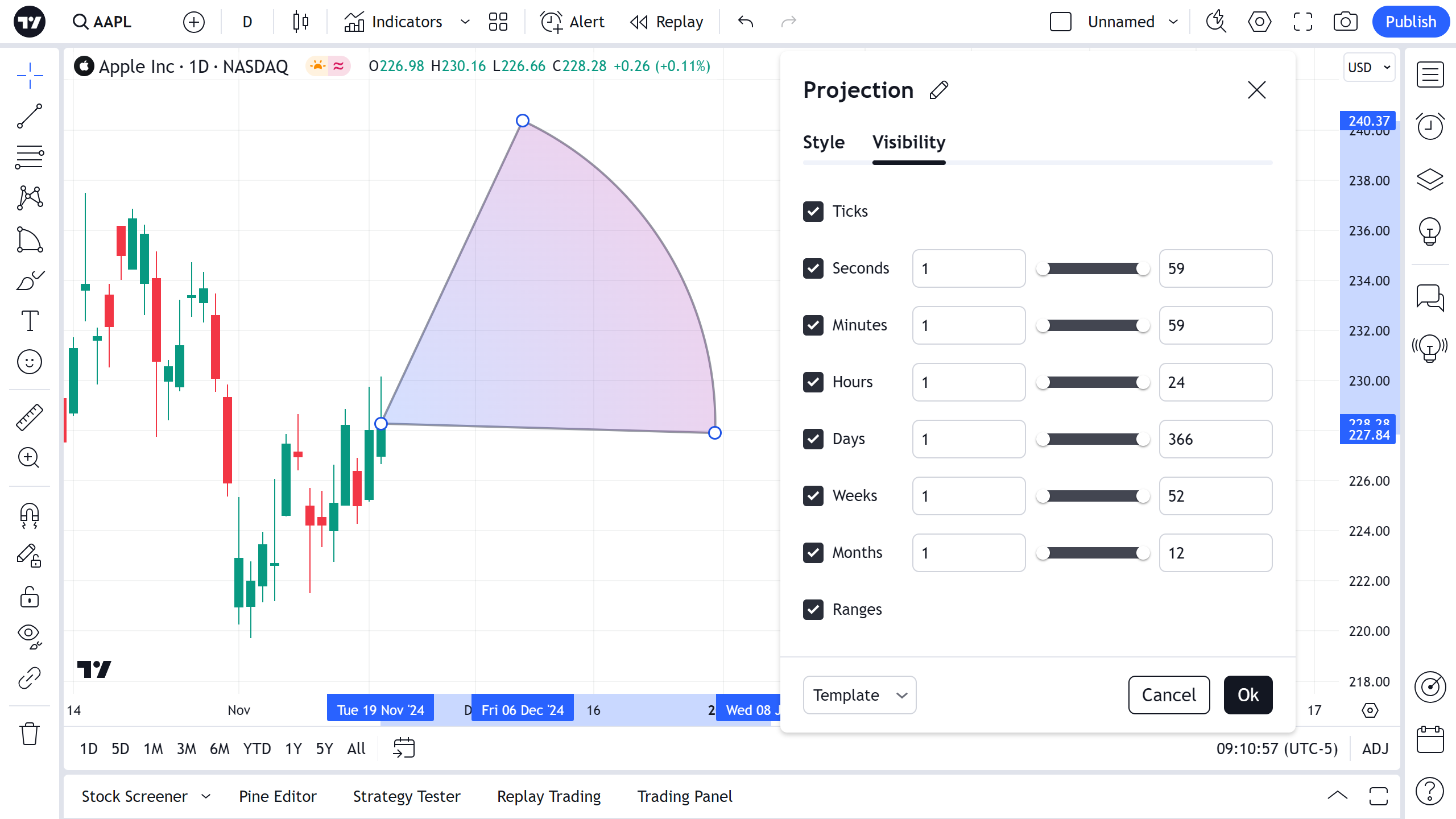 在可见性属性对话框中,您可以切换在不同时间周期的图表上显示的投影工具:
