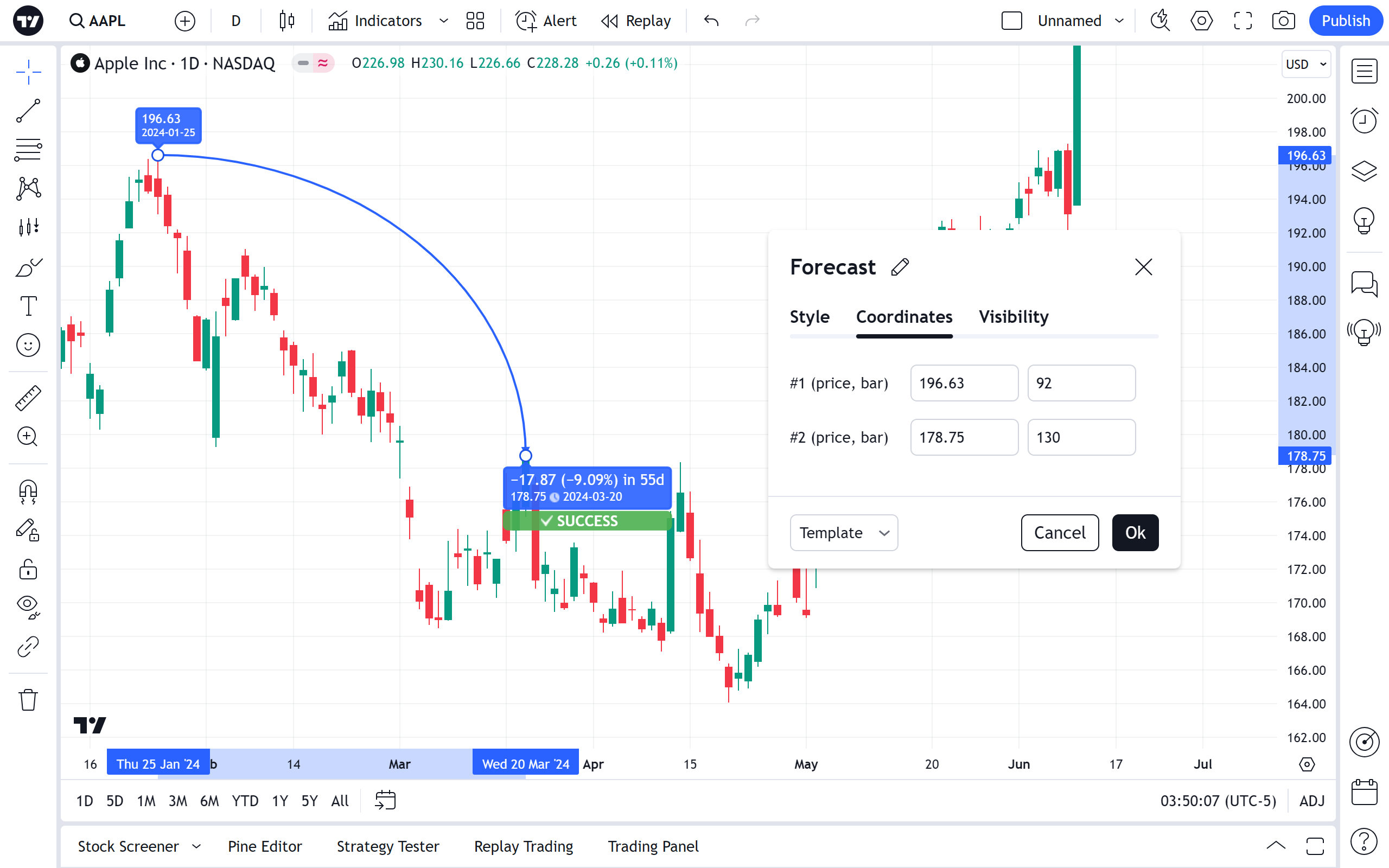预测是一种非常有用的绘图工具,尤其是在与 Nuvexlens 社区的其他人分享交易观点的情况下。预测允许用户为交易设置入场和出场价格。 但是,它还允许用户通过扩展预测线来定义交易的持续时间。随着时间的推移(和价格的变化),预测将自动被视为“成功”或“失败”。