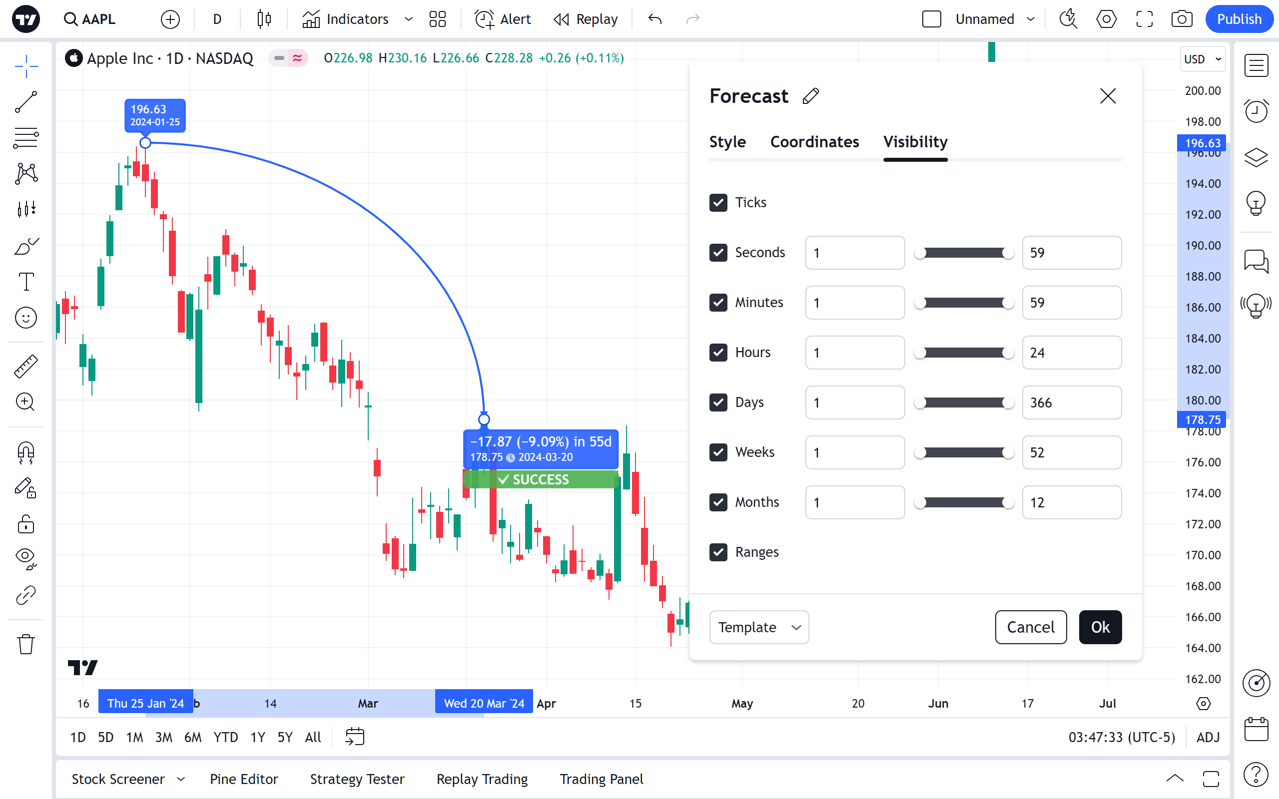 在可见性属性对话框中,您可以切换在不同时间范围的图表上显示的三角形工具: