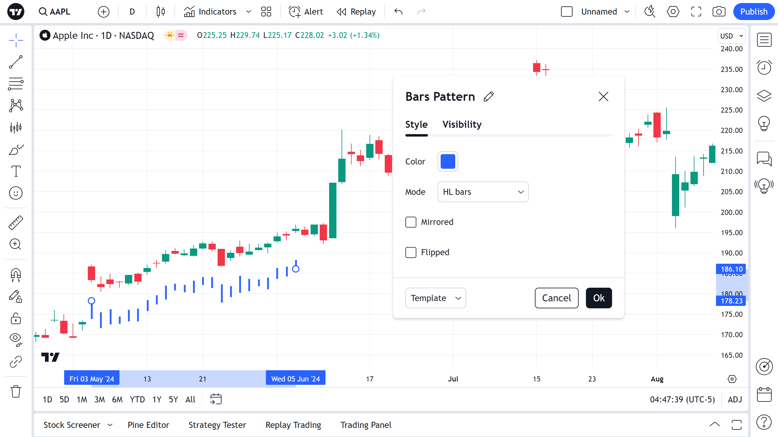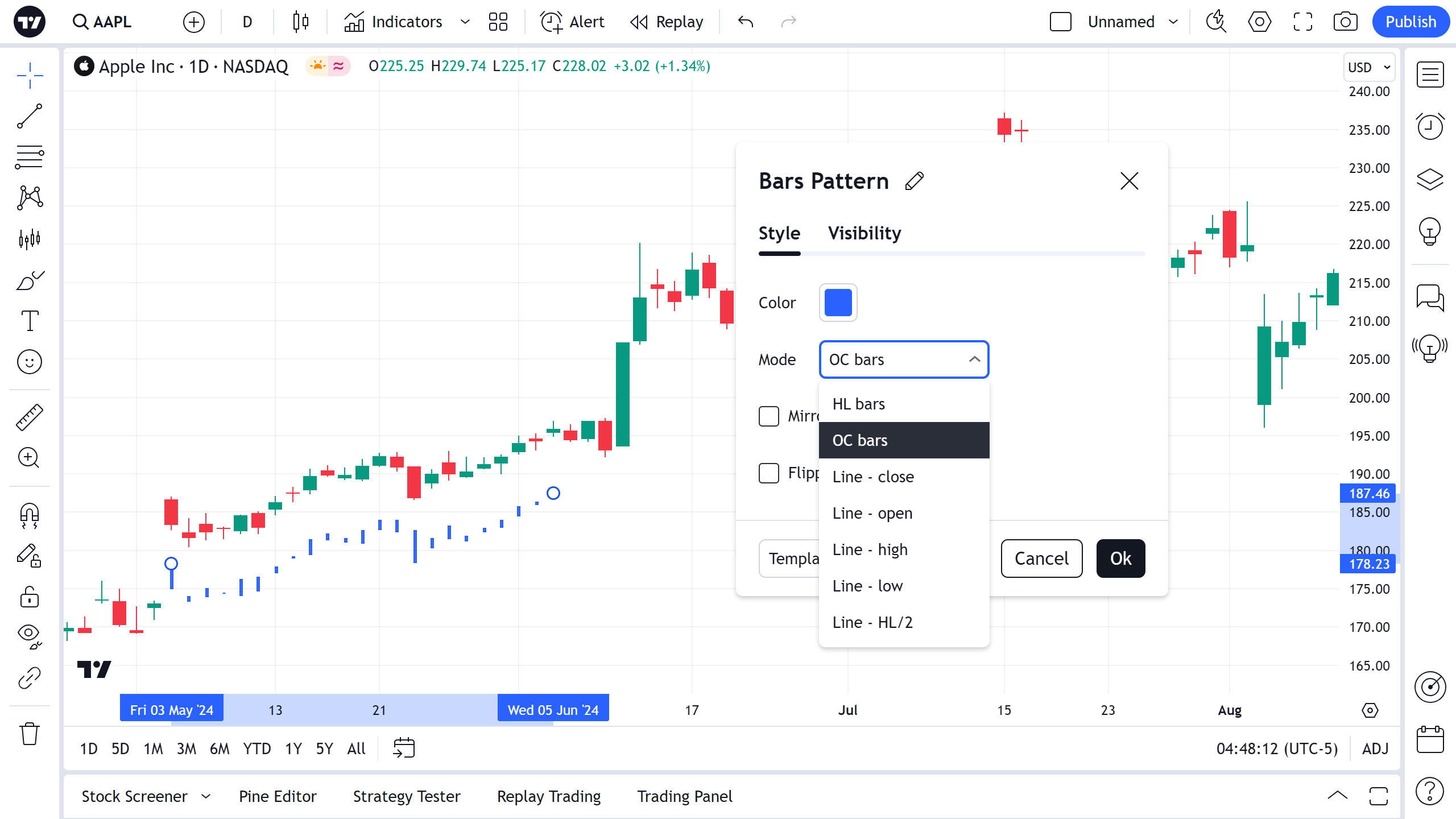 为绘制的形态设置形状和价格来源。 该形态可能以K线的形式显示,也可能以其点的不同价格来源的线形形式显示: