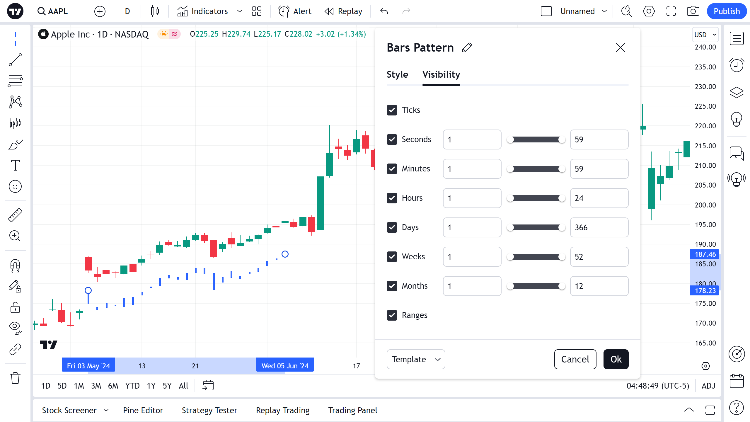 在可见性属性对话框中,您可以切换在不同时间周期的图表上显示的K线形态: