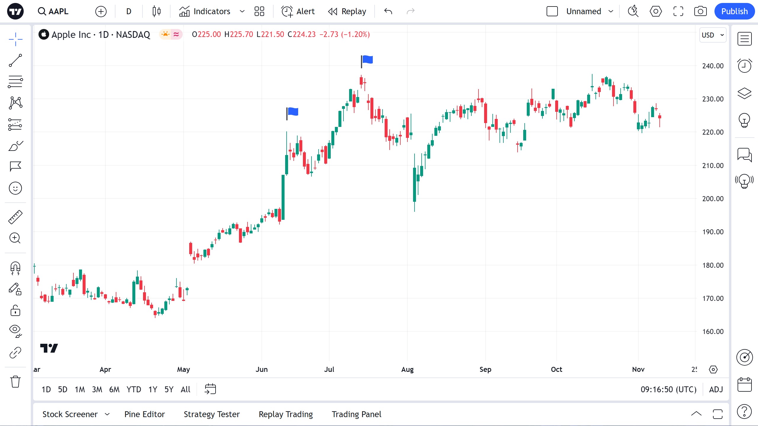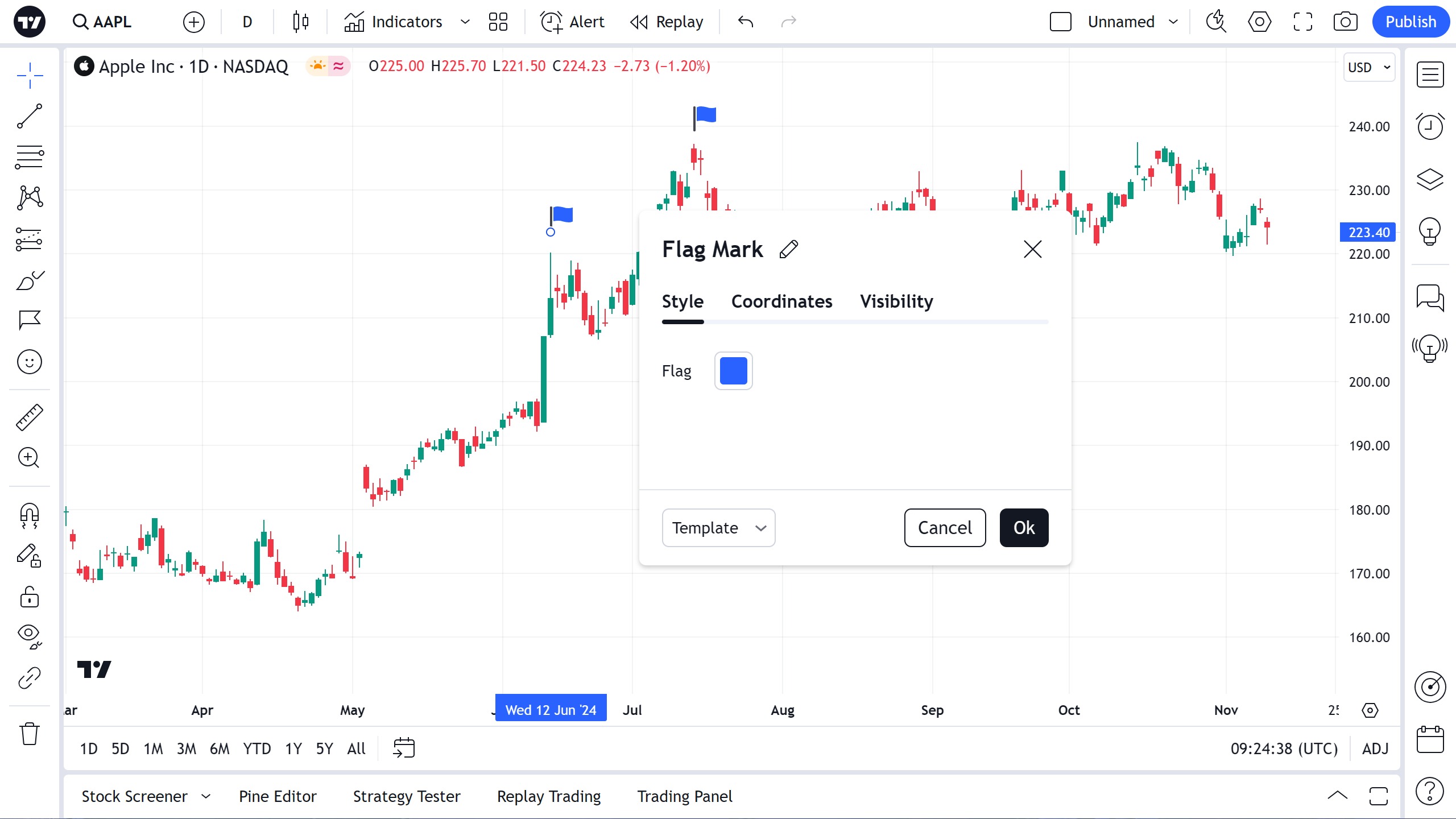 旗标是一种用于在图表上标记重要点的简单工具。例如,用户可以在趋势的高/低价点放置标志标记: