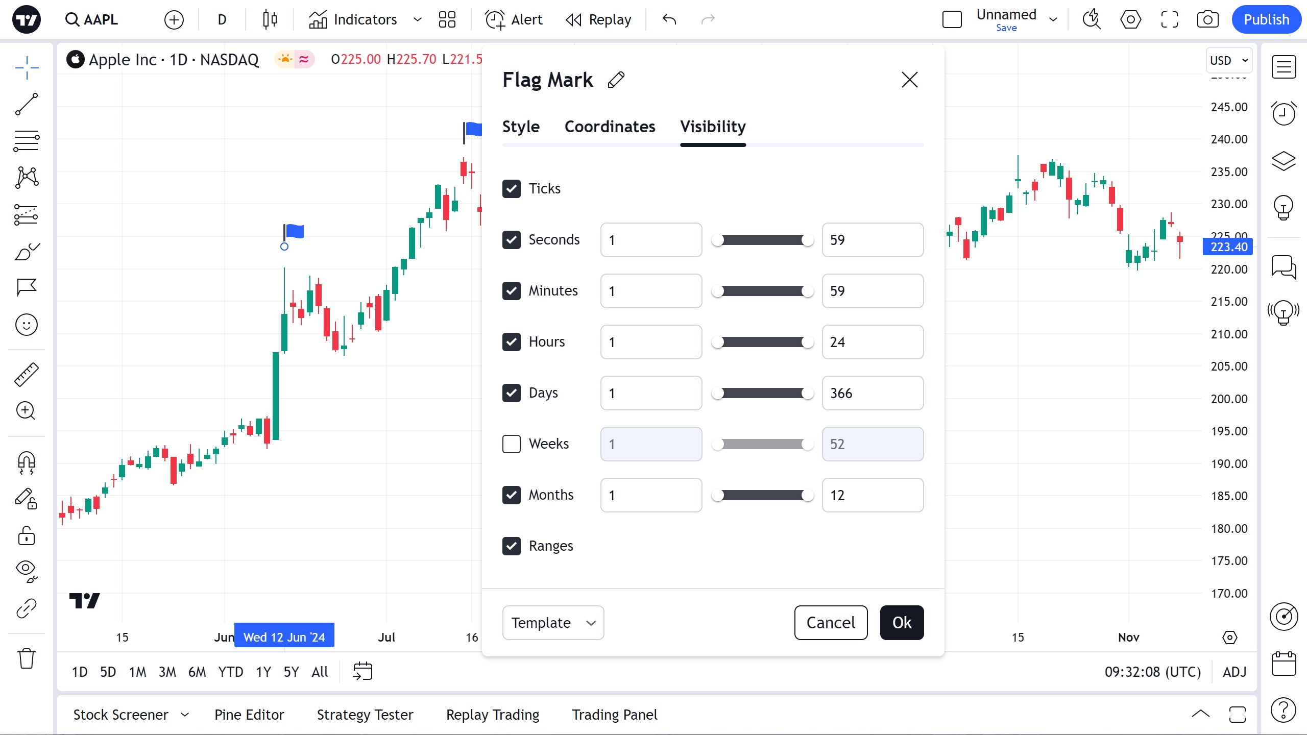 在可见性属性对话框中,您可以切换在不同时间周期的图表上显示旗标绘图: