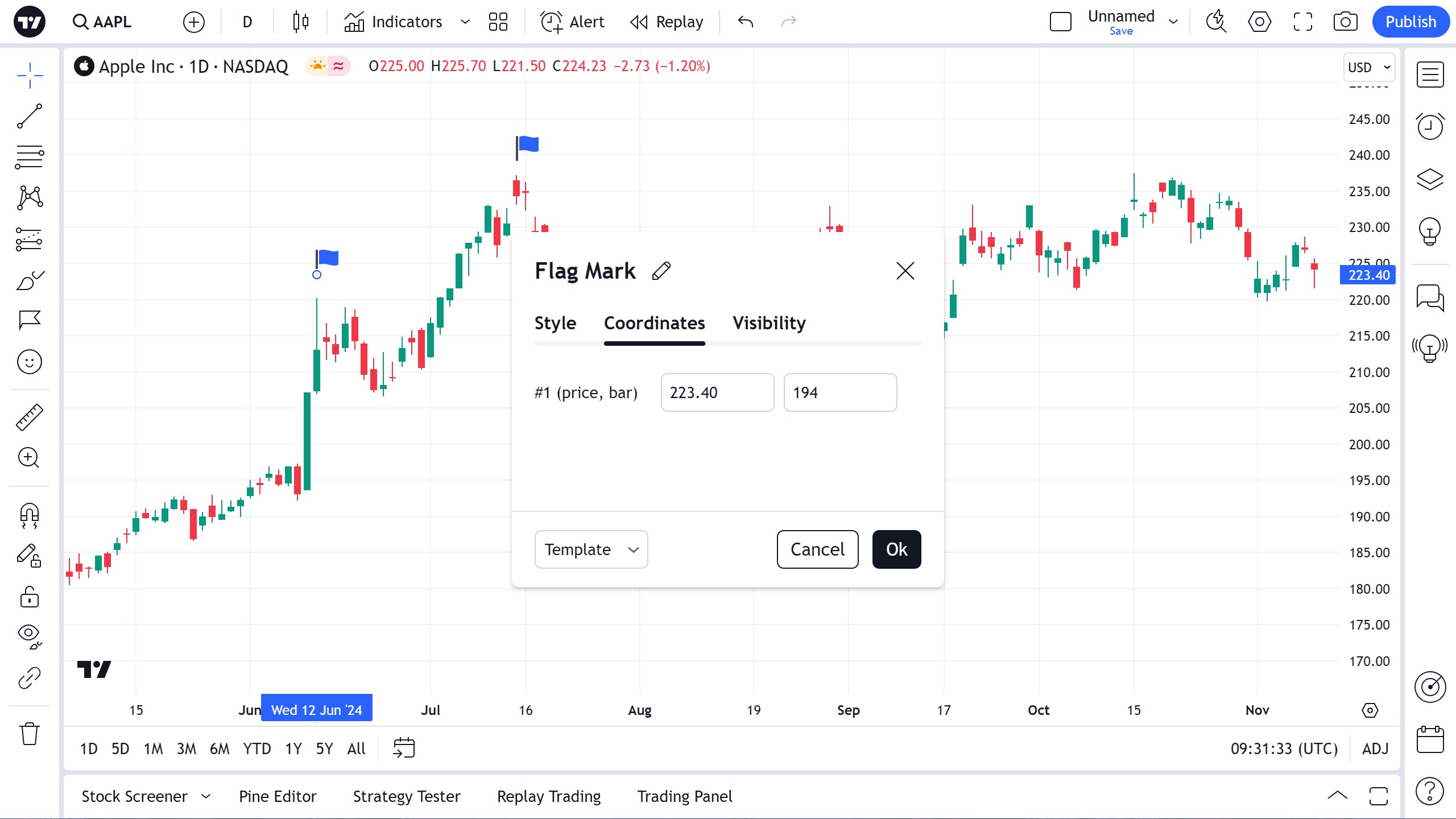 在坐标属性对话框中,您可以精确设置旗标在价格坐标(通过设置价格)和时间轴(通过设置K线号)上的位置: