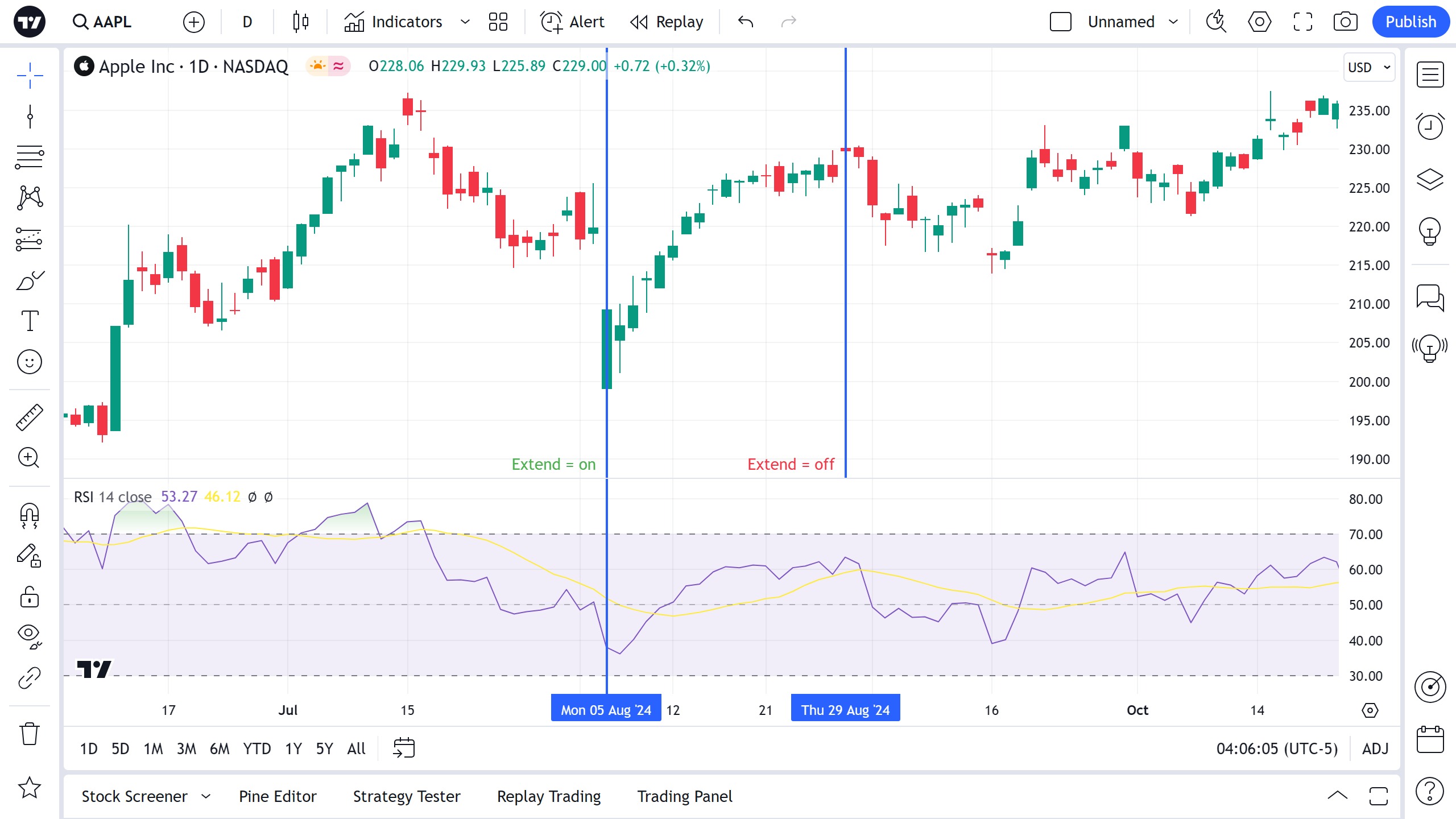 延伸将垂直线延伸至指标窗格。