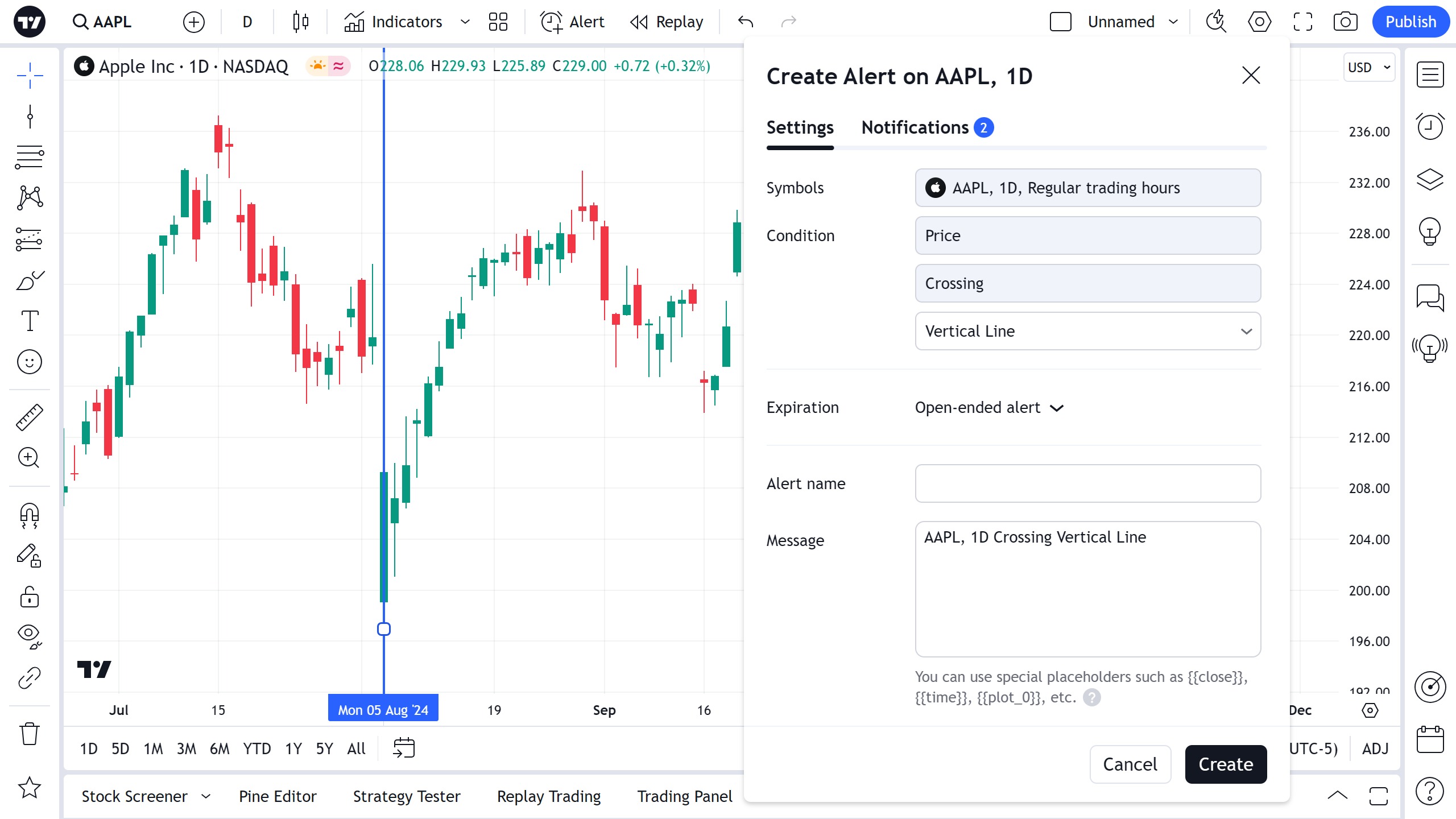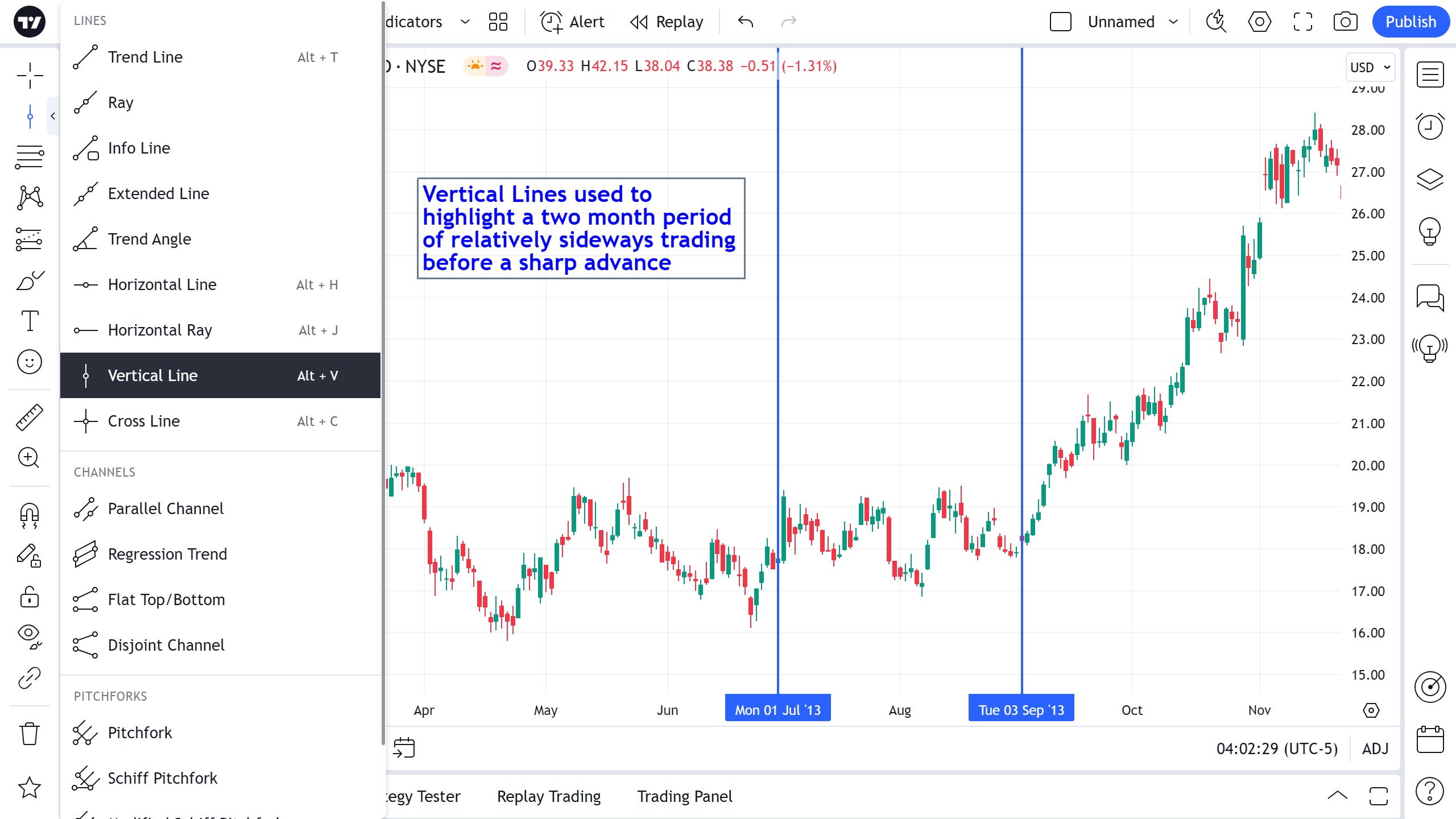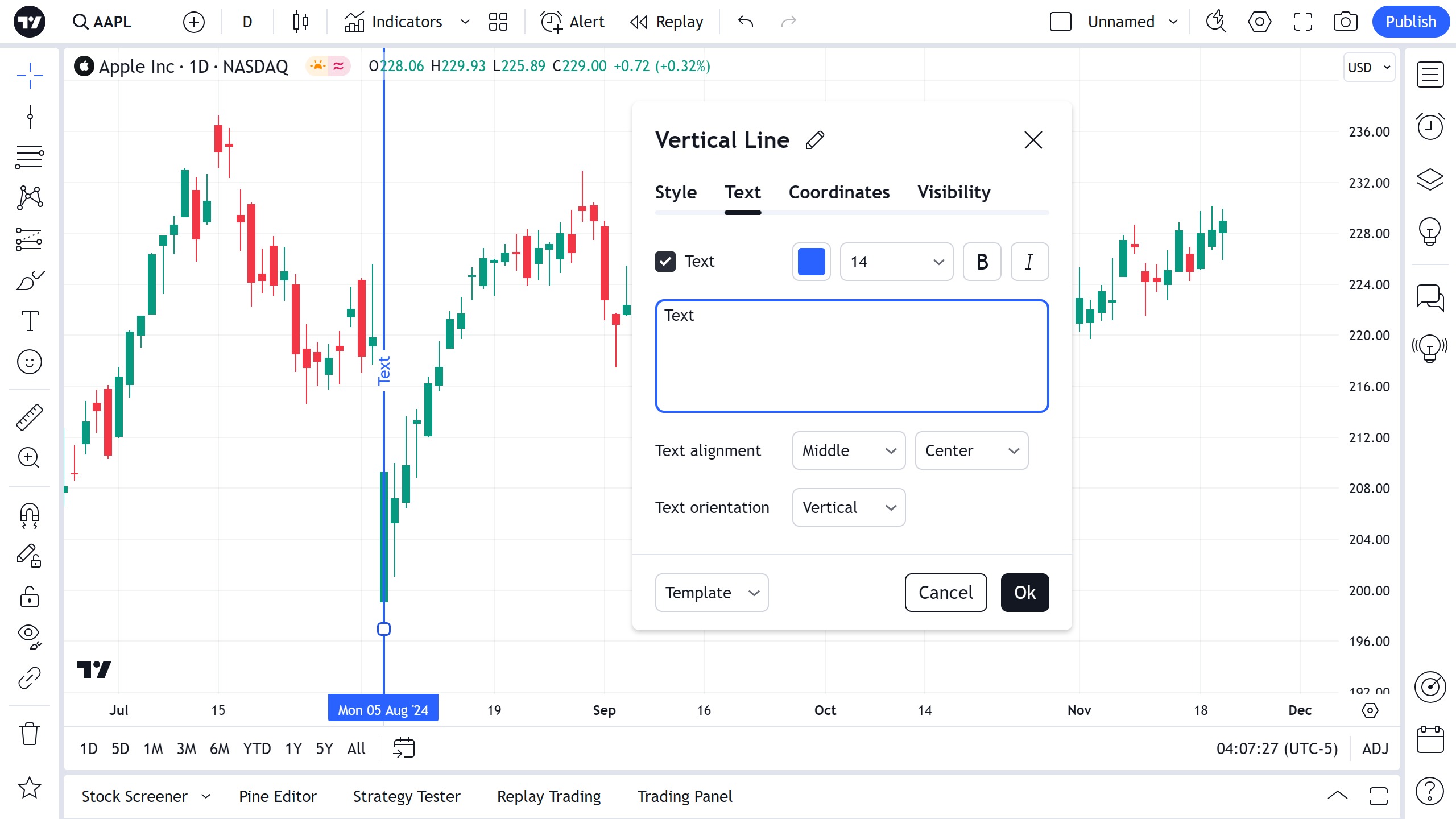 您可以直接在图表上编辑垂直线的文本 — 只需单击文本字段即可输入。