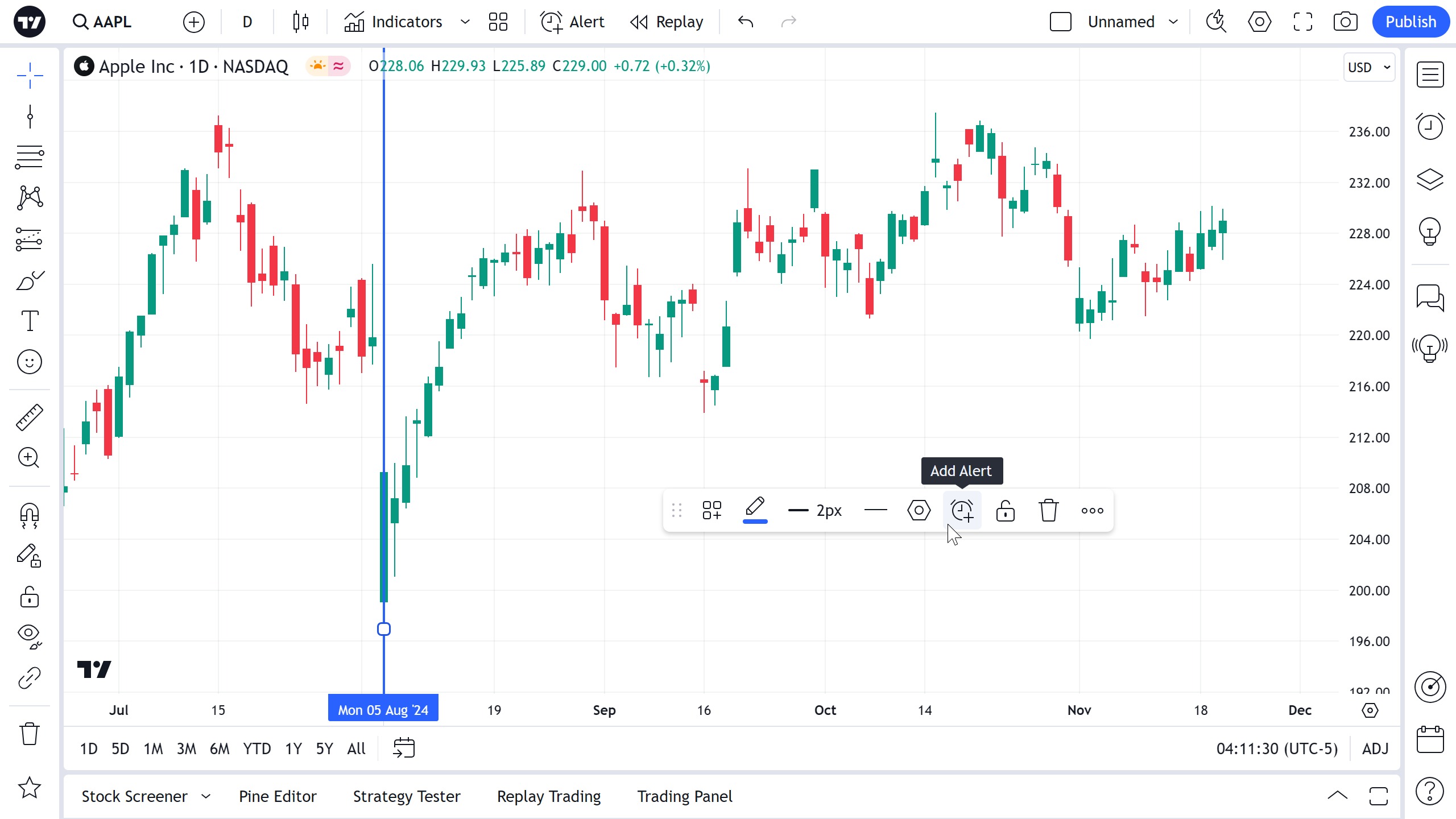 可以设置警报以获取有关图表上越过垂直线的系列的通知。在浮动绘图工具栏或绘图本身的右键菜单中使用时钟图标: