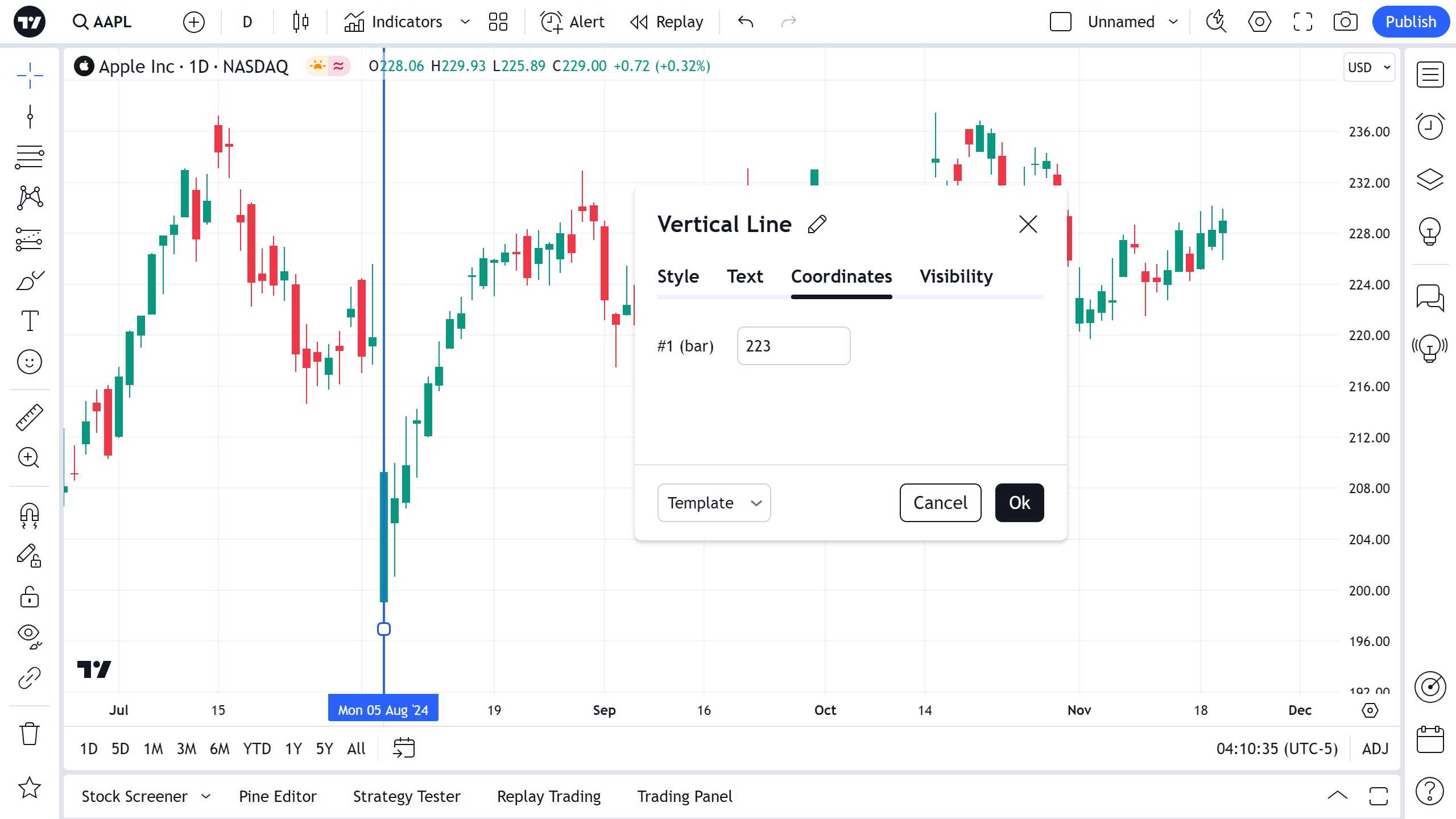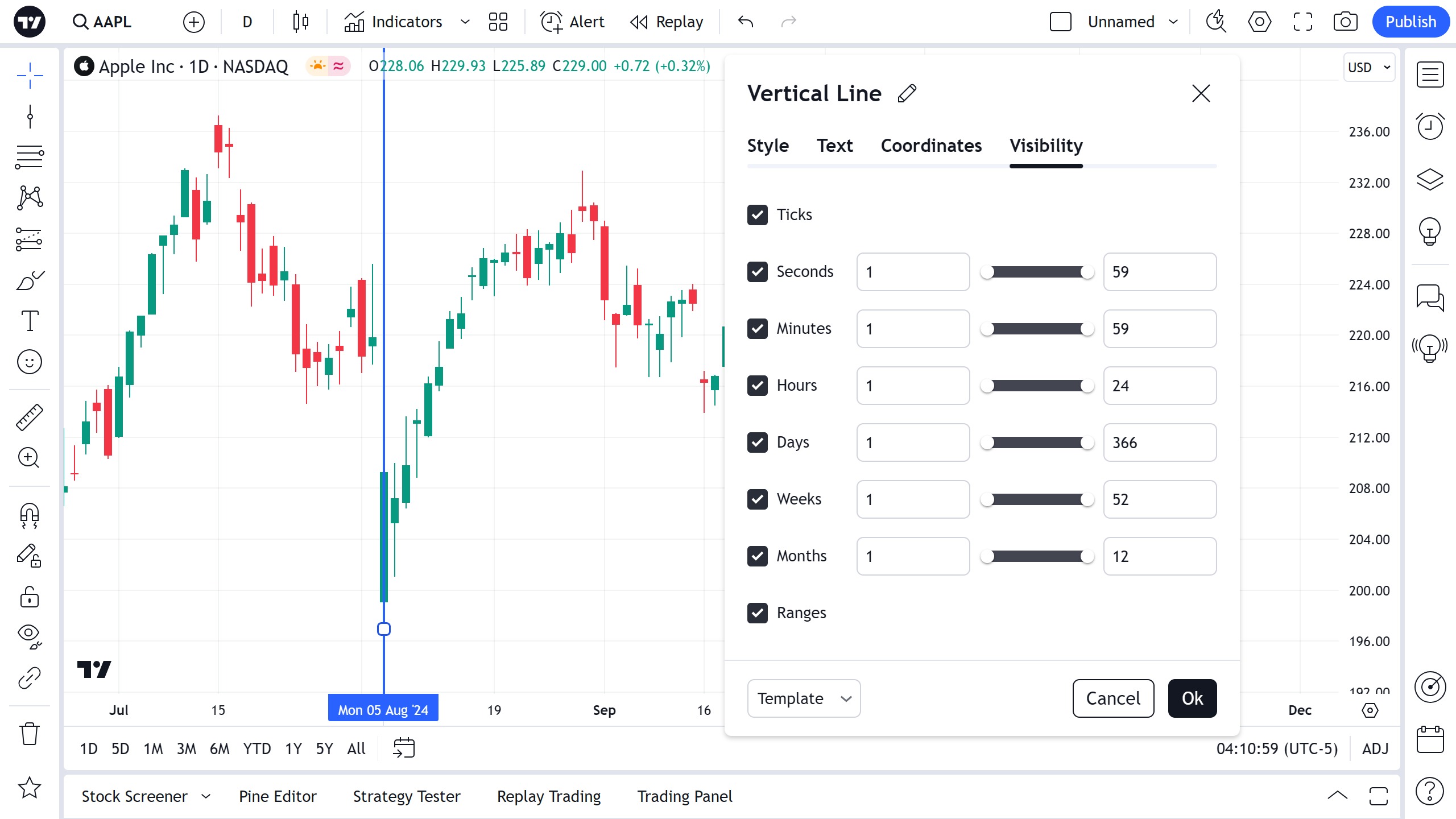 在可见性属性对话框中,您可以在不同时间周期的图表上切换垂直线图的显示:
