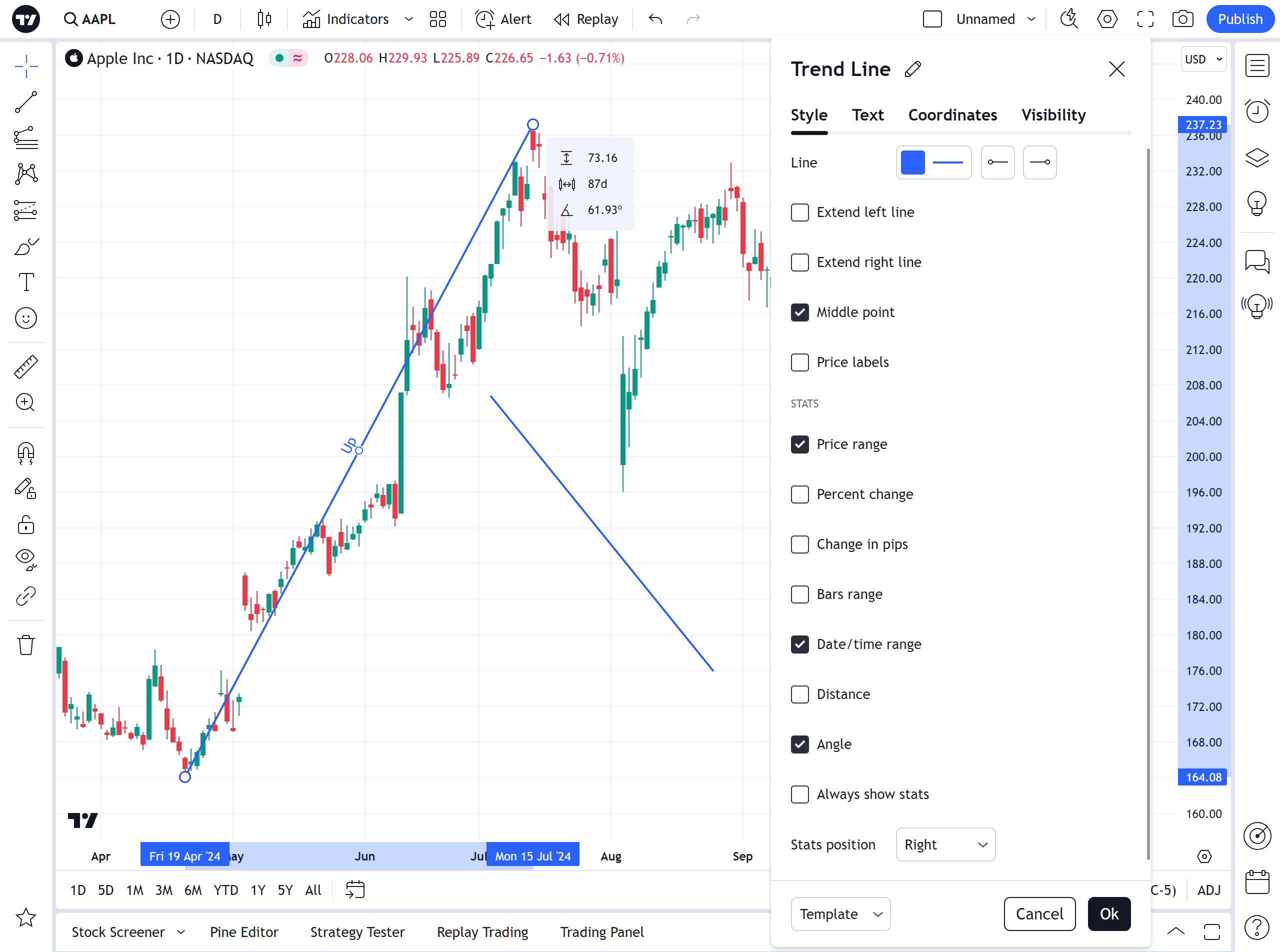 复选框价格范围、百分比变化、点数变化、K线范围、日期/时间范围、距离、角度允许在图表上的趋势线旁边显示带有相关信息的标签。