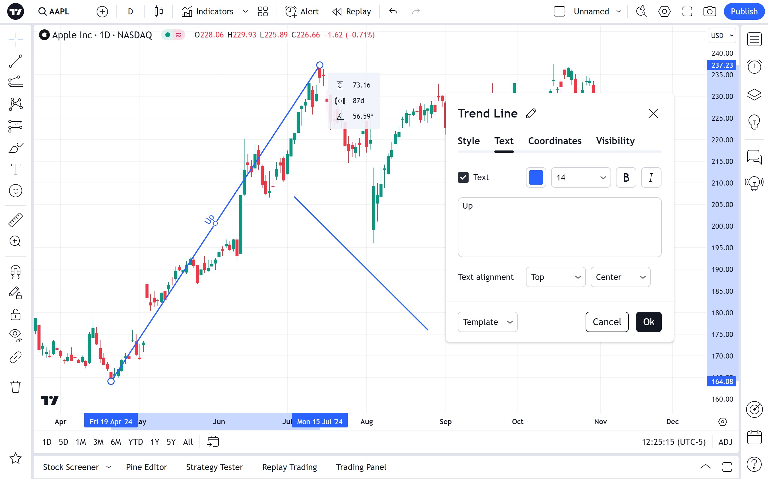 当“文本”复选框处于活动状态时,可以在文本框中输入文本,该文本将显示在趋势线旁边。您可以更改文本颜色和字体大小。您还可以选择将文本加粗和/或斜体化。文本对齐下拉菜单允许设置文本沿趋势线的位置。