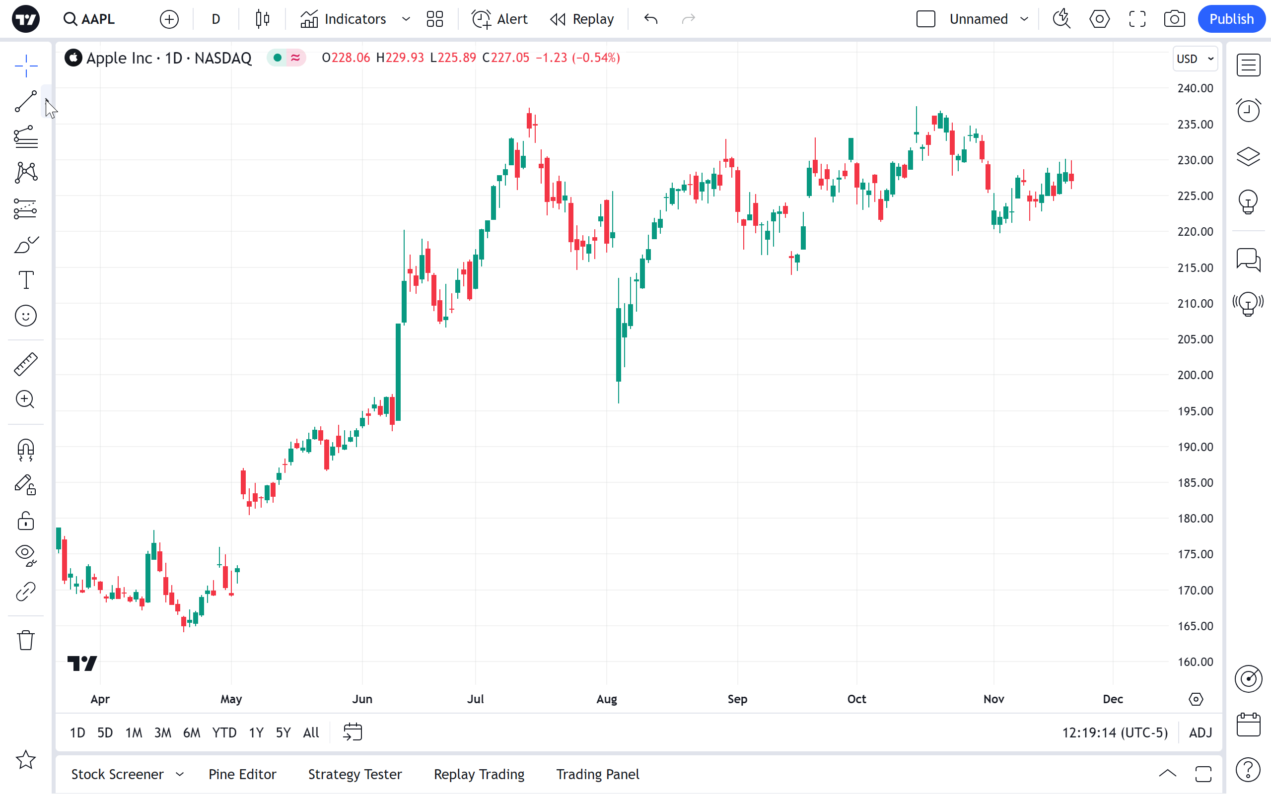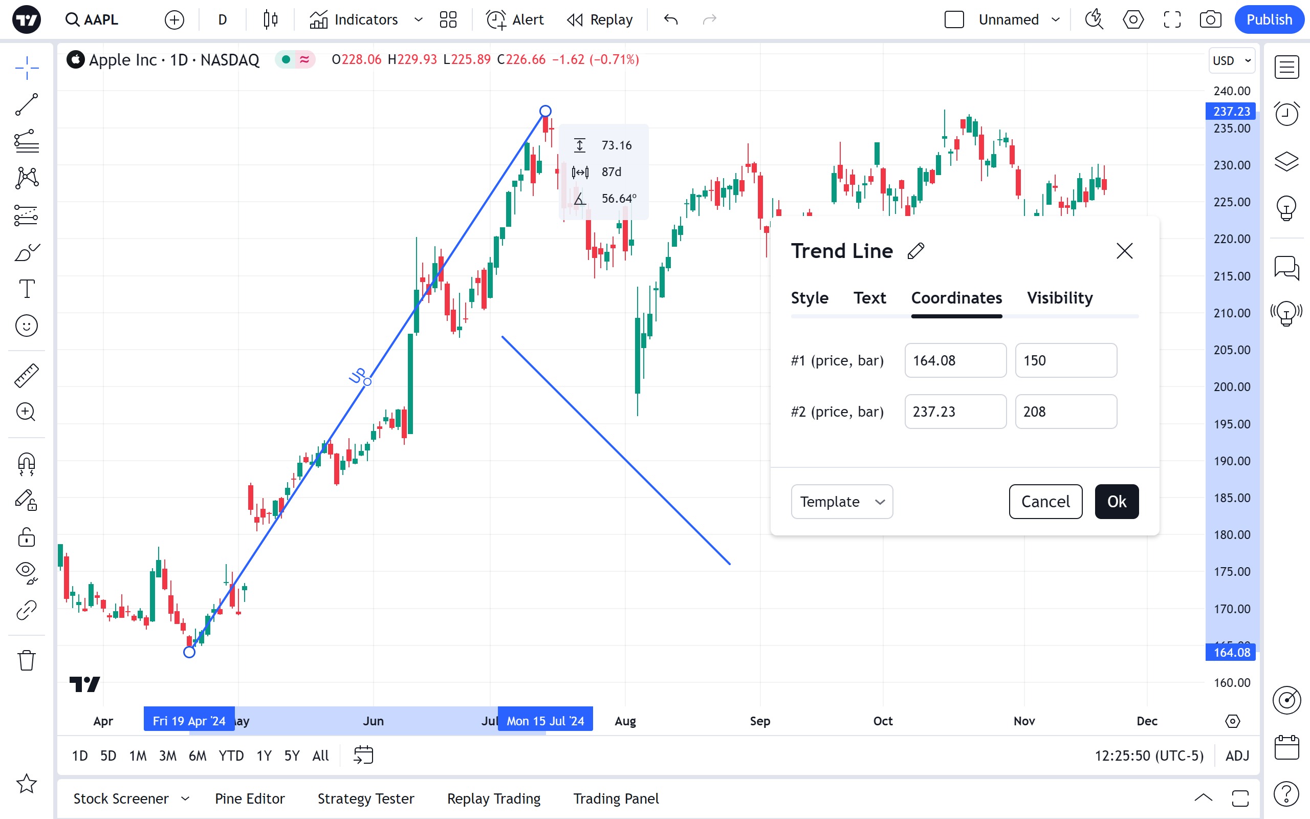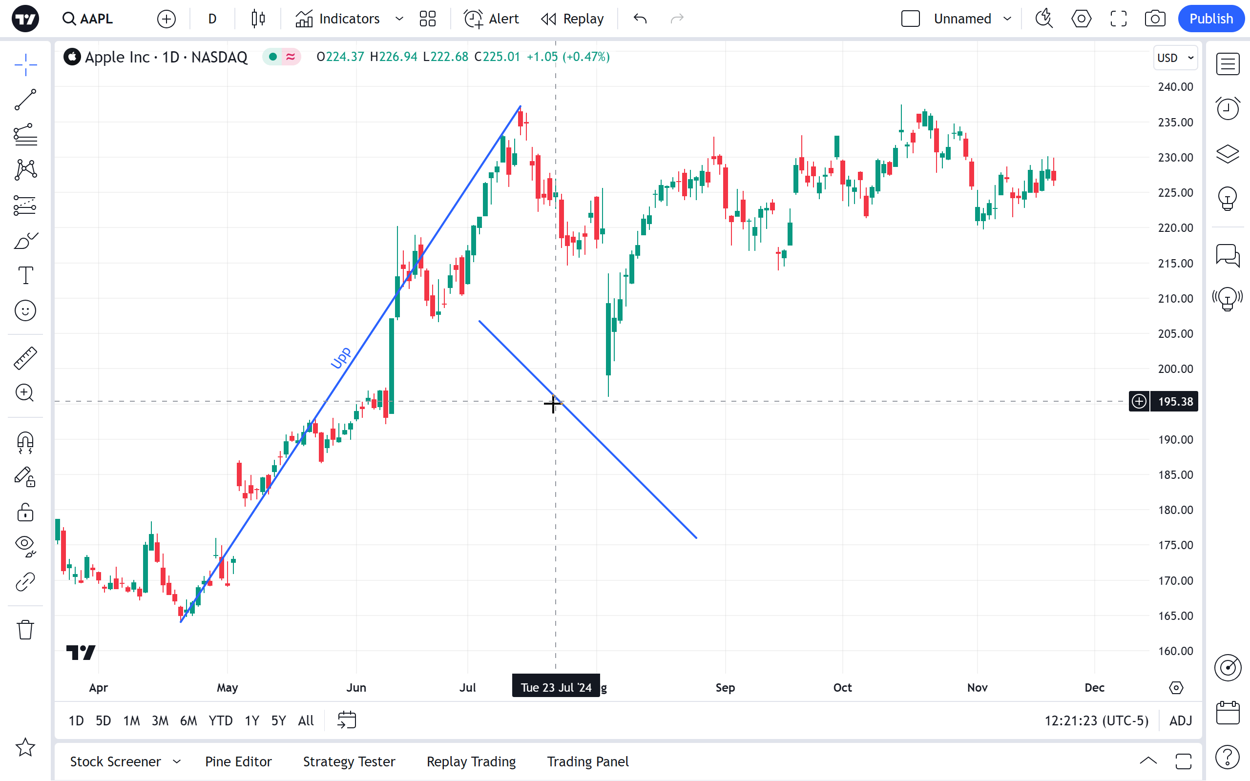 趋势线绘图工具有几个有用的应用程序。它主要用于手动绘制说明市场趋势或相关指标的线。它也可以用作箭头(可以选择在一端或两端放置箭头),用于指定兴趣点。要以45度角绘制趋势线,请在绘制时按住Shift键。