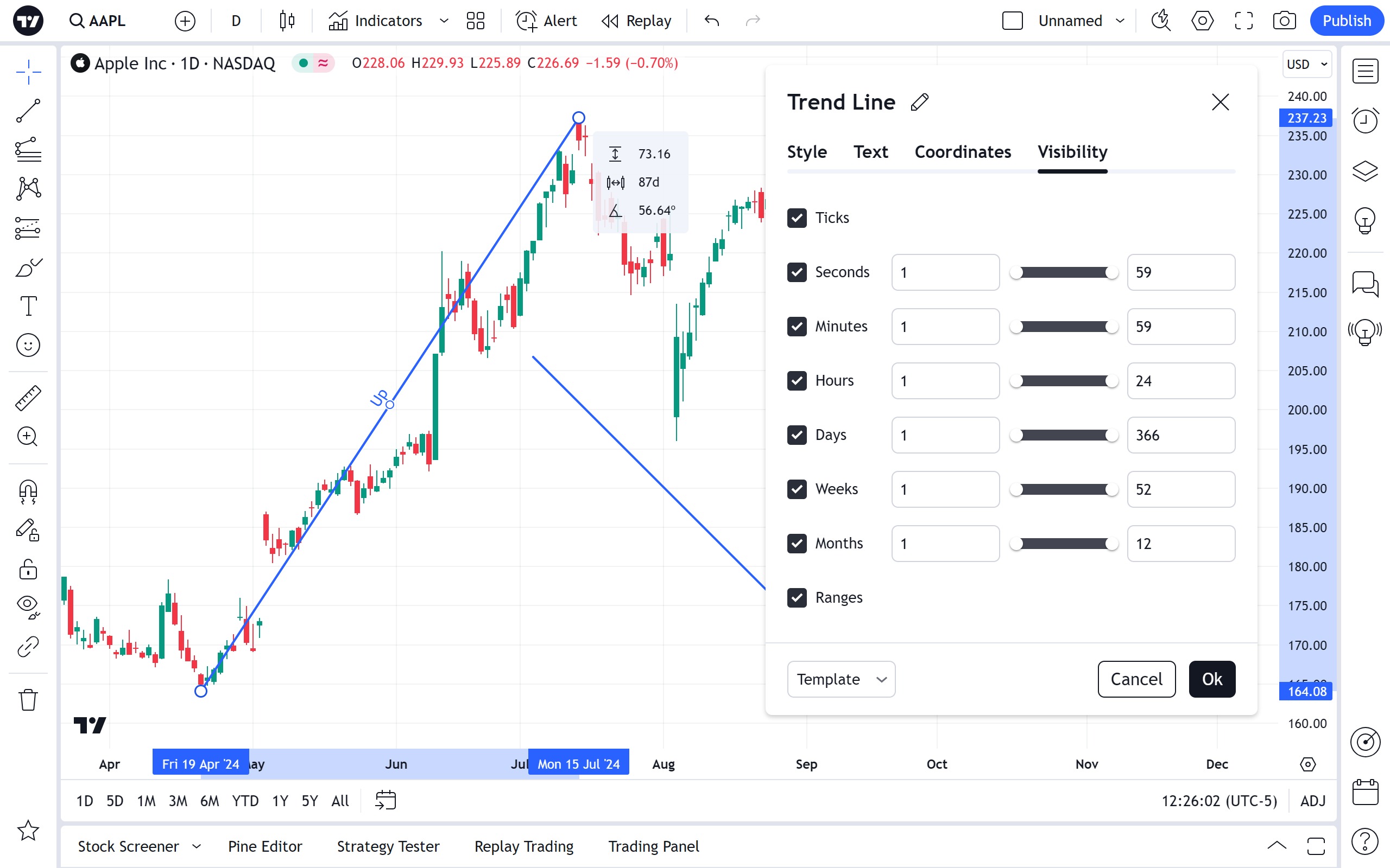 在可见范围属性对话框中,您可以在不同时间周期的图表上切换趋势线的显示: