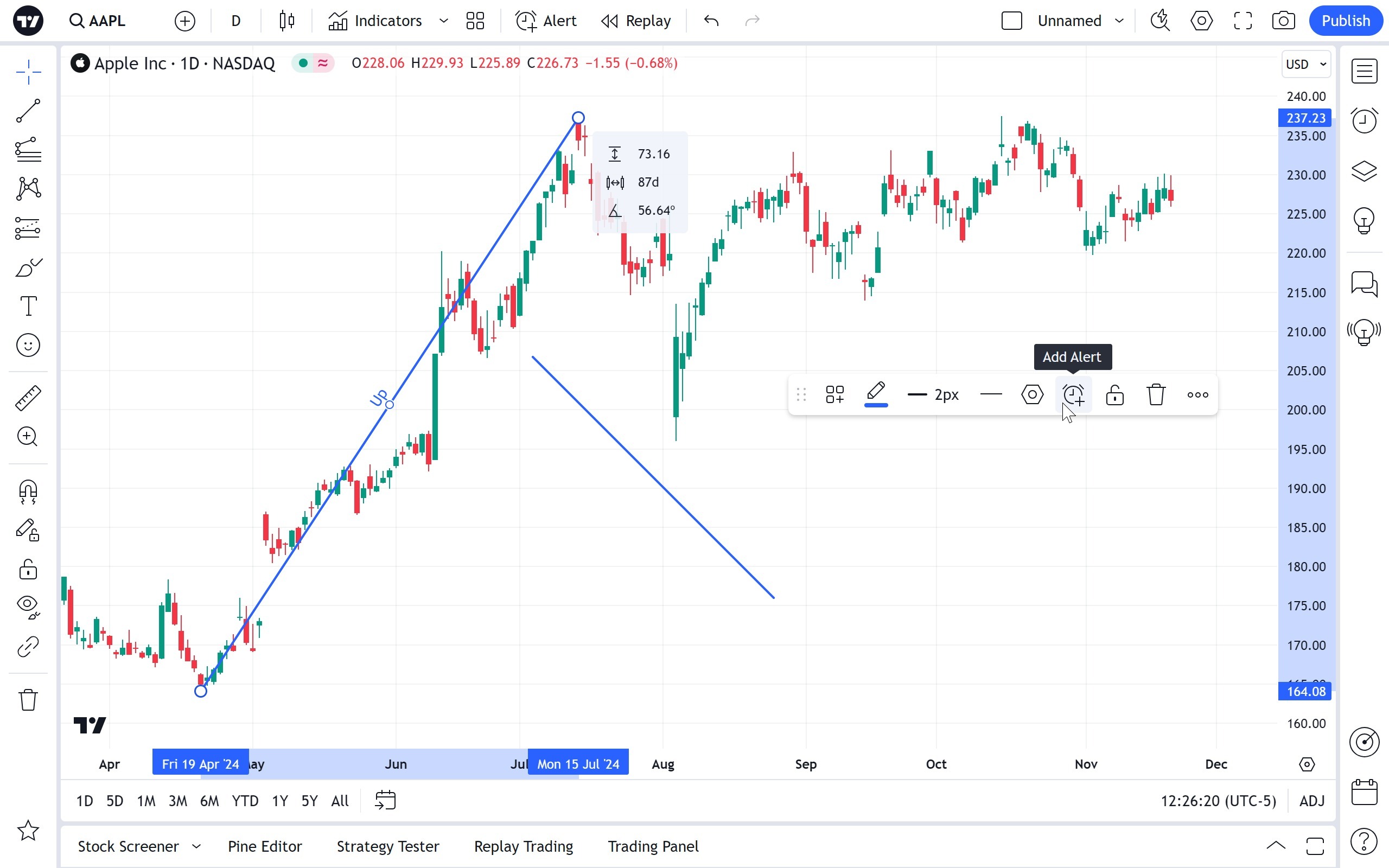 可以设置警报以获取有关图表上一系列穿过趋势线的通知。使用浮动绘图工具栏中的时钟图标或趋势线本身的右键菜单: