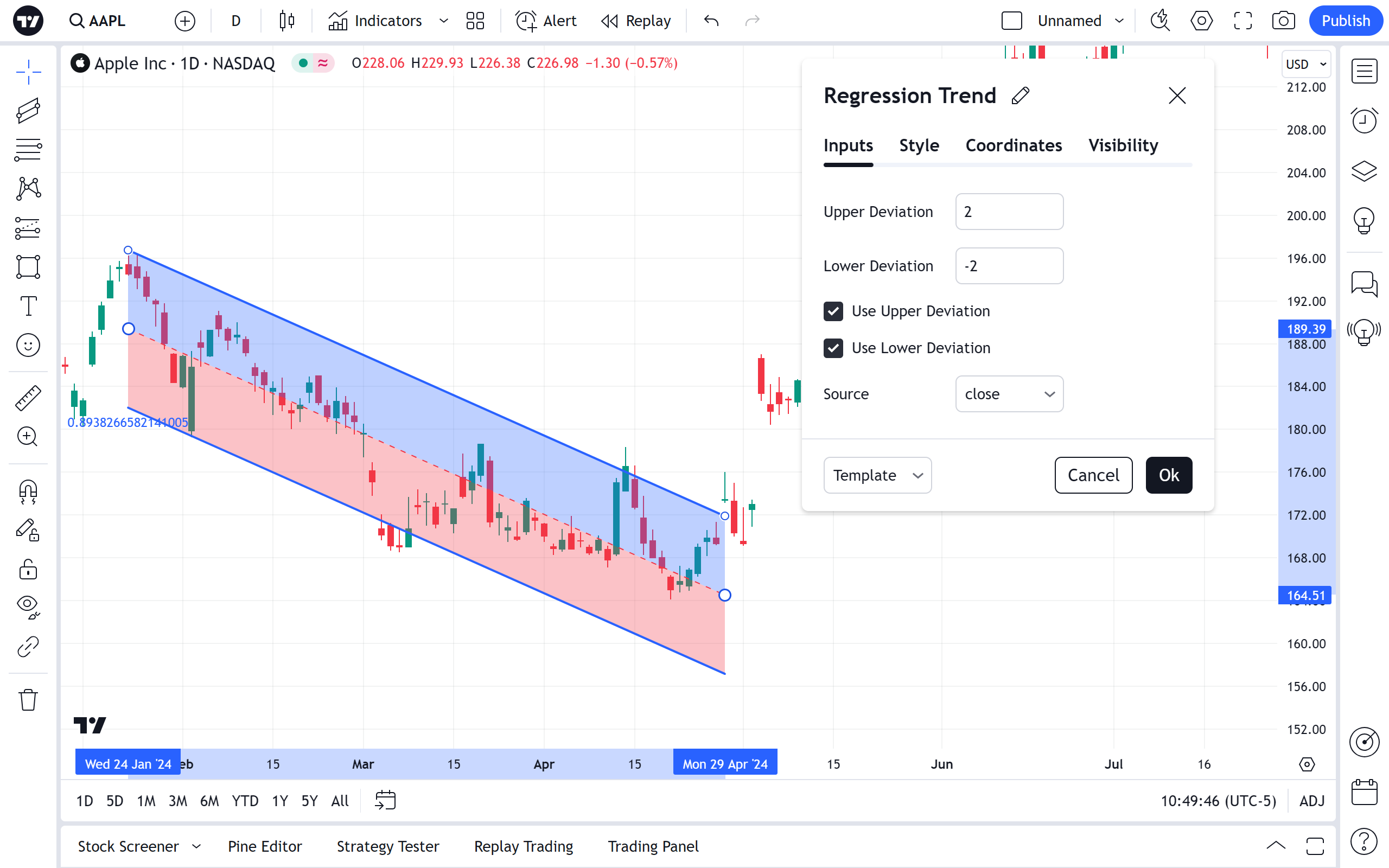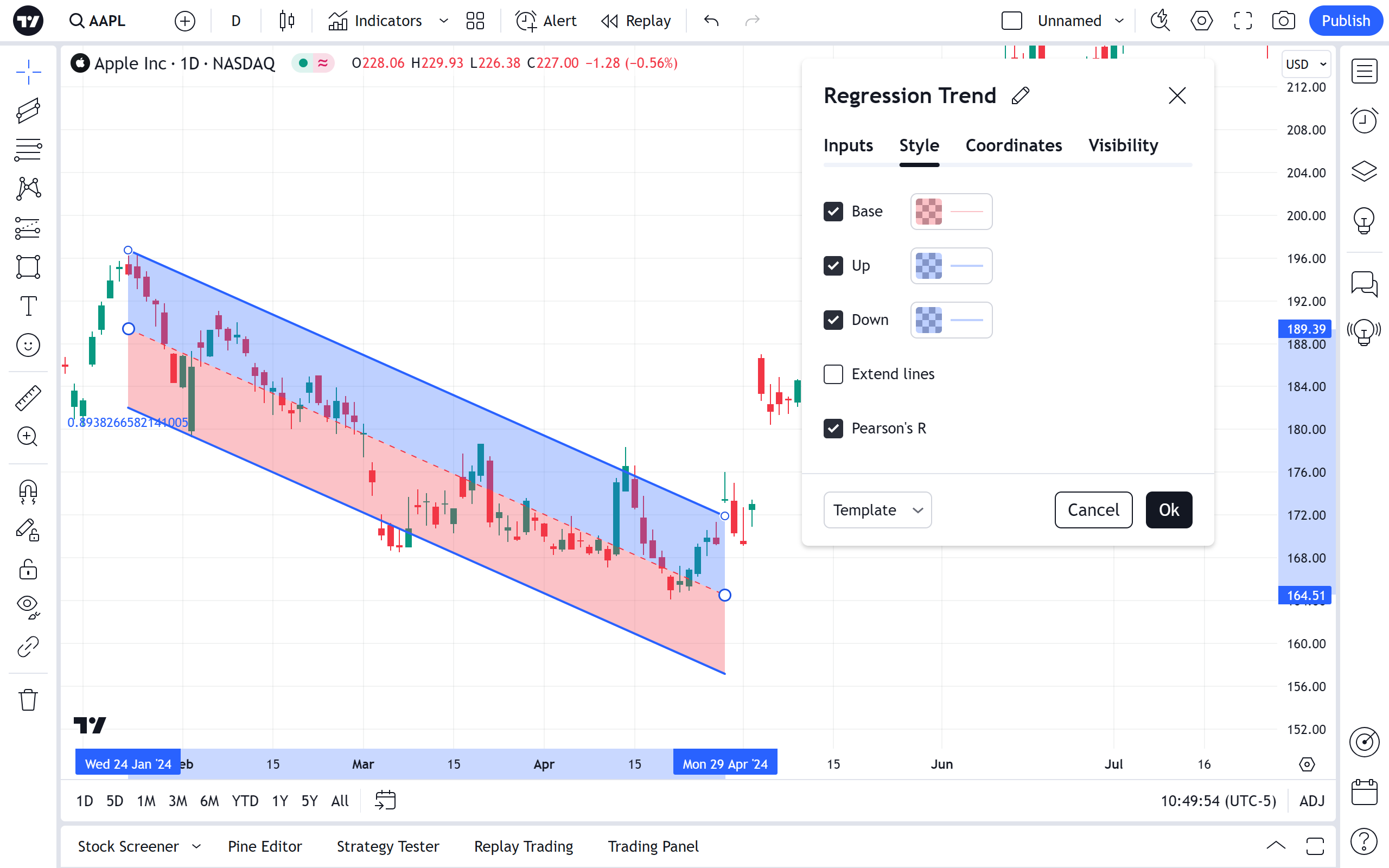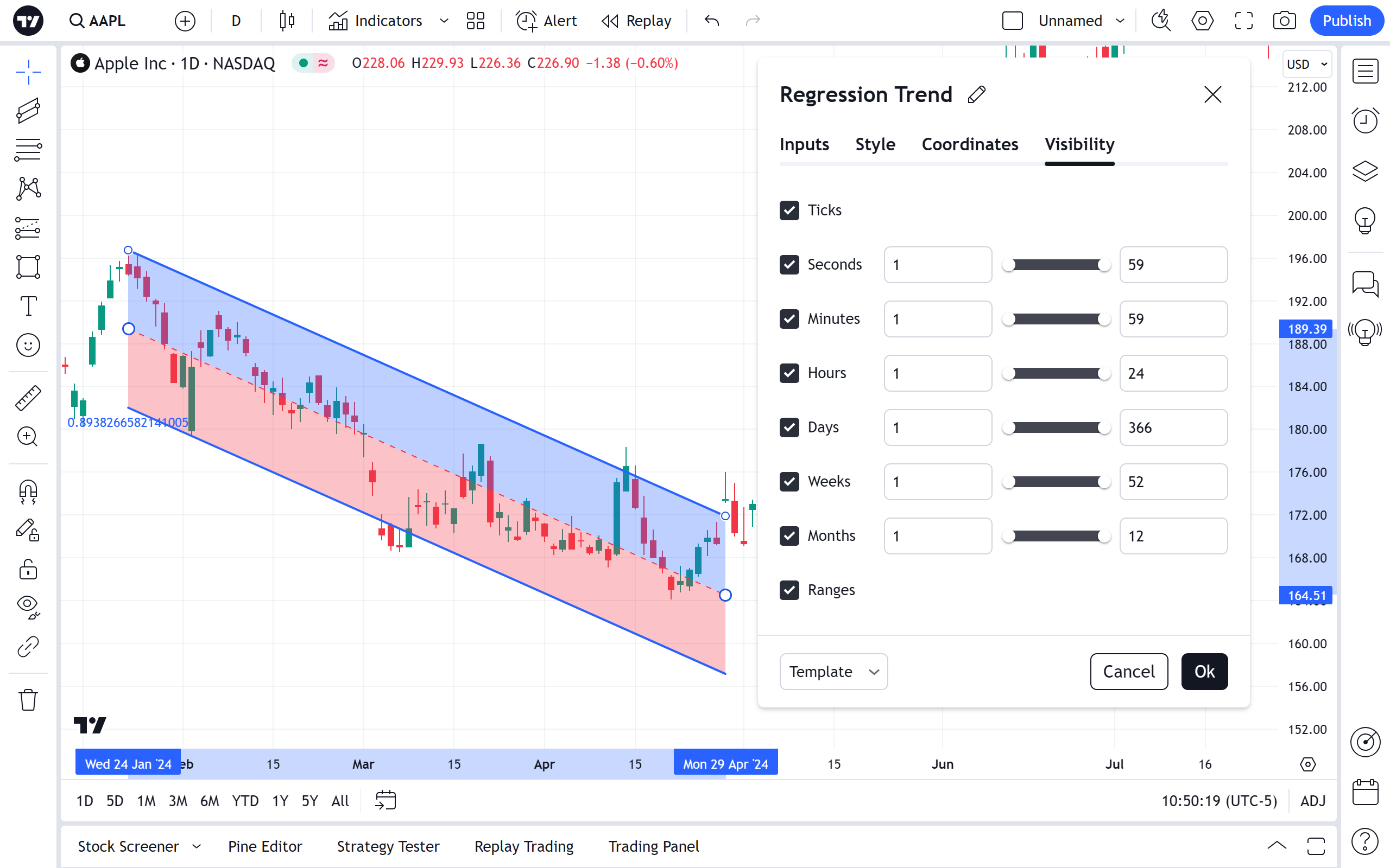 在可见性属性对话框中,您可以切换在不同时间周期的图表上显示的回归趋势: