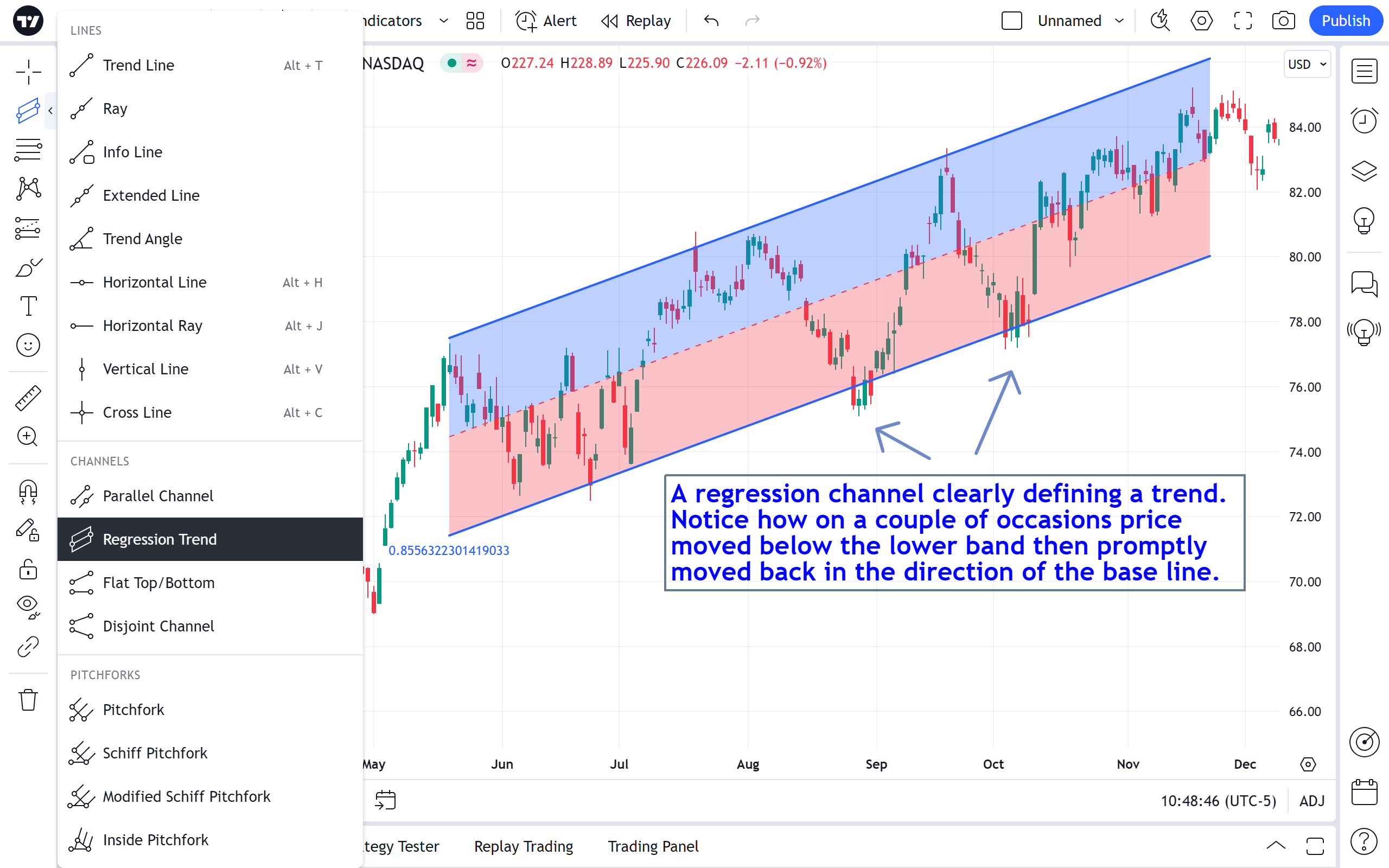 回归趋势的使用方式类似于平行通道。 主要区别在于,上带和下带设置了用户定义的距离基线的标准偏差数。 这是一个很好的工具,可用于确定价格何时异常远离其基线。