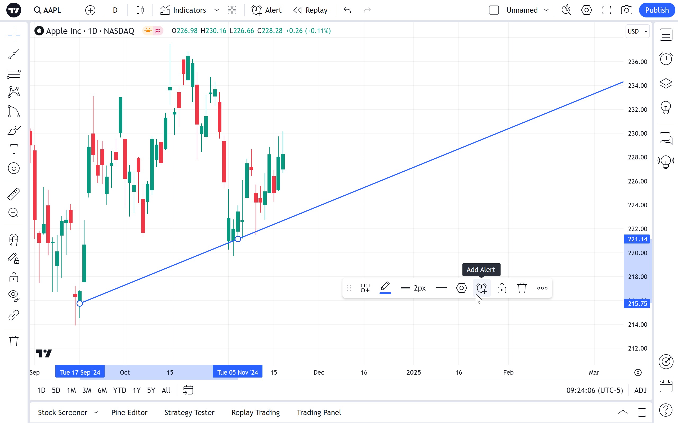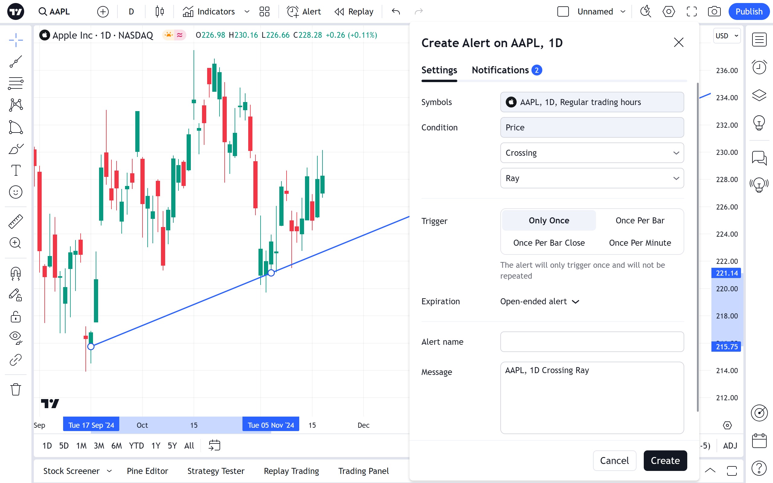 可以设置警报,当一系列数据穿过图表上的射线时收到通知。使用浮动绘图工具栏中的时钟图标或射线本身的右键单击菜单: