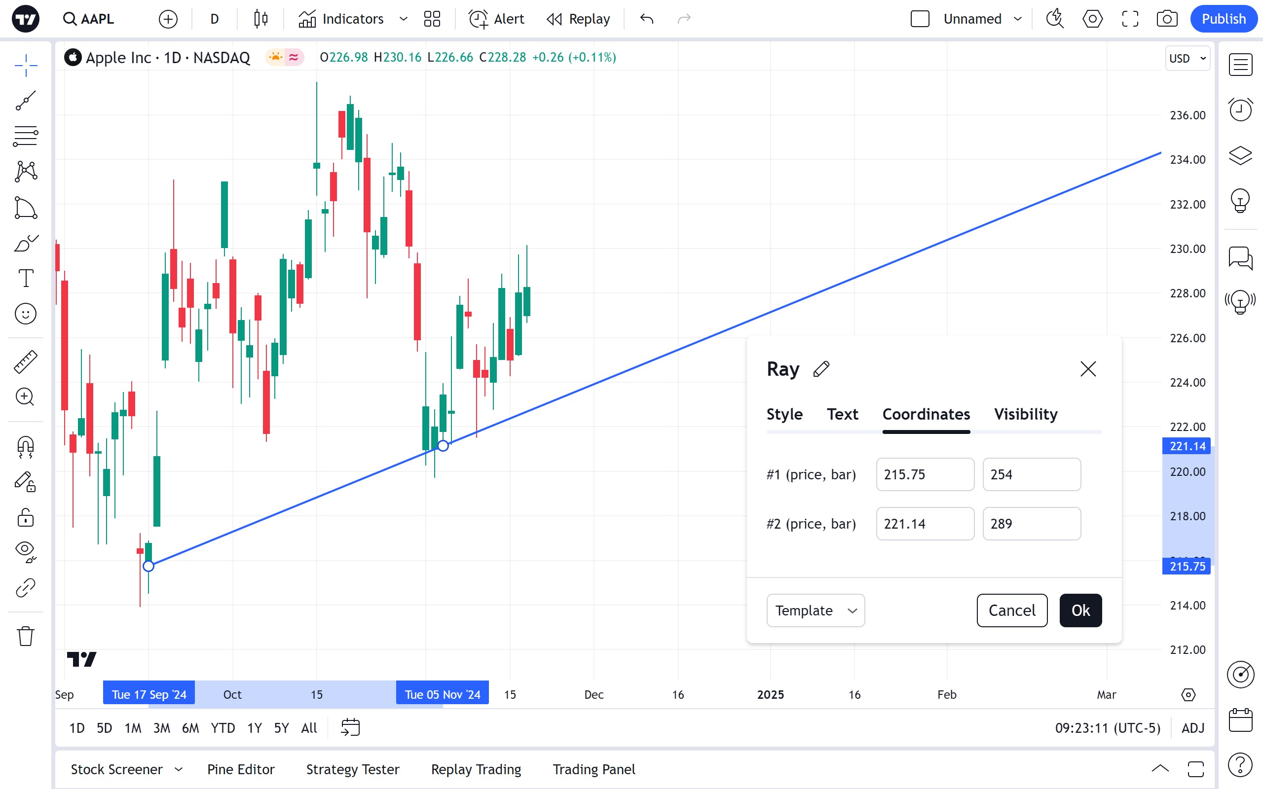 允许使用条形编号和价格精确放置射线的第二个点(价格 2)。
