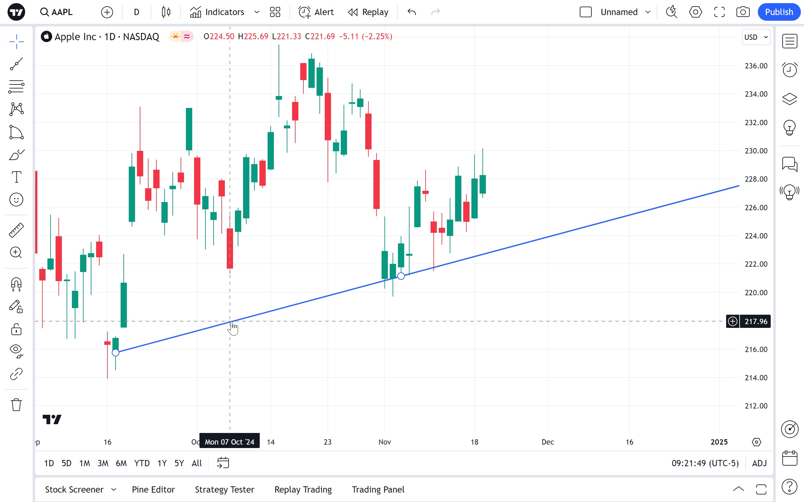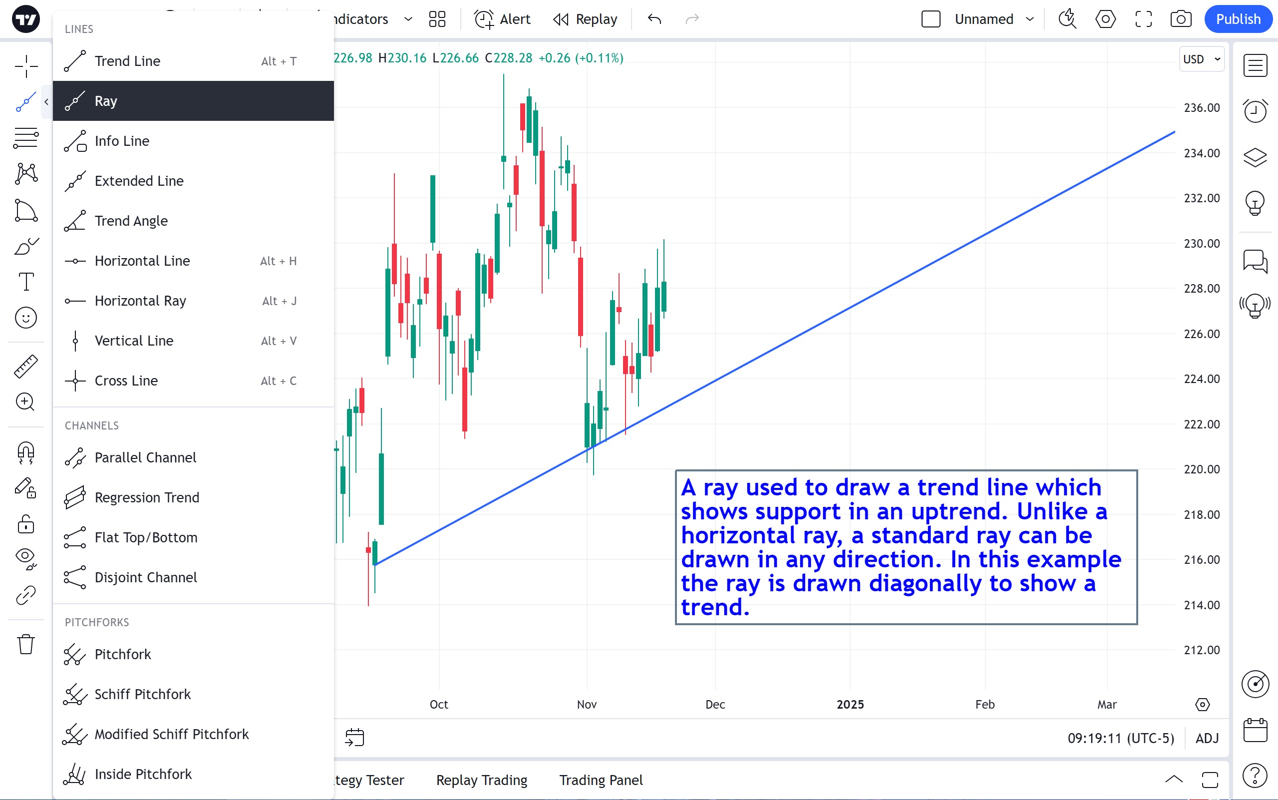 射线与水平射线类似,不同之处在于它可以朝任意方向定向。射线的第一个点定义原点,第二个点定义方向。要绘制射线,请将初始点放在图表上的任意位置,将第二个点放在所需方向。射线将无限延伸到该方向。