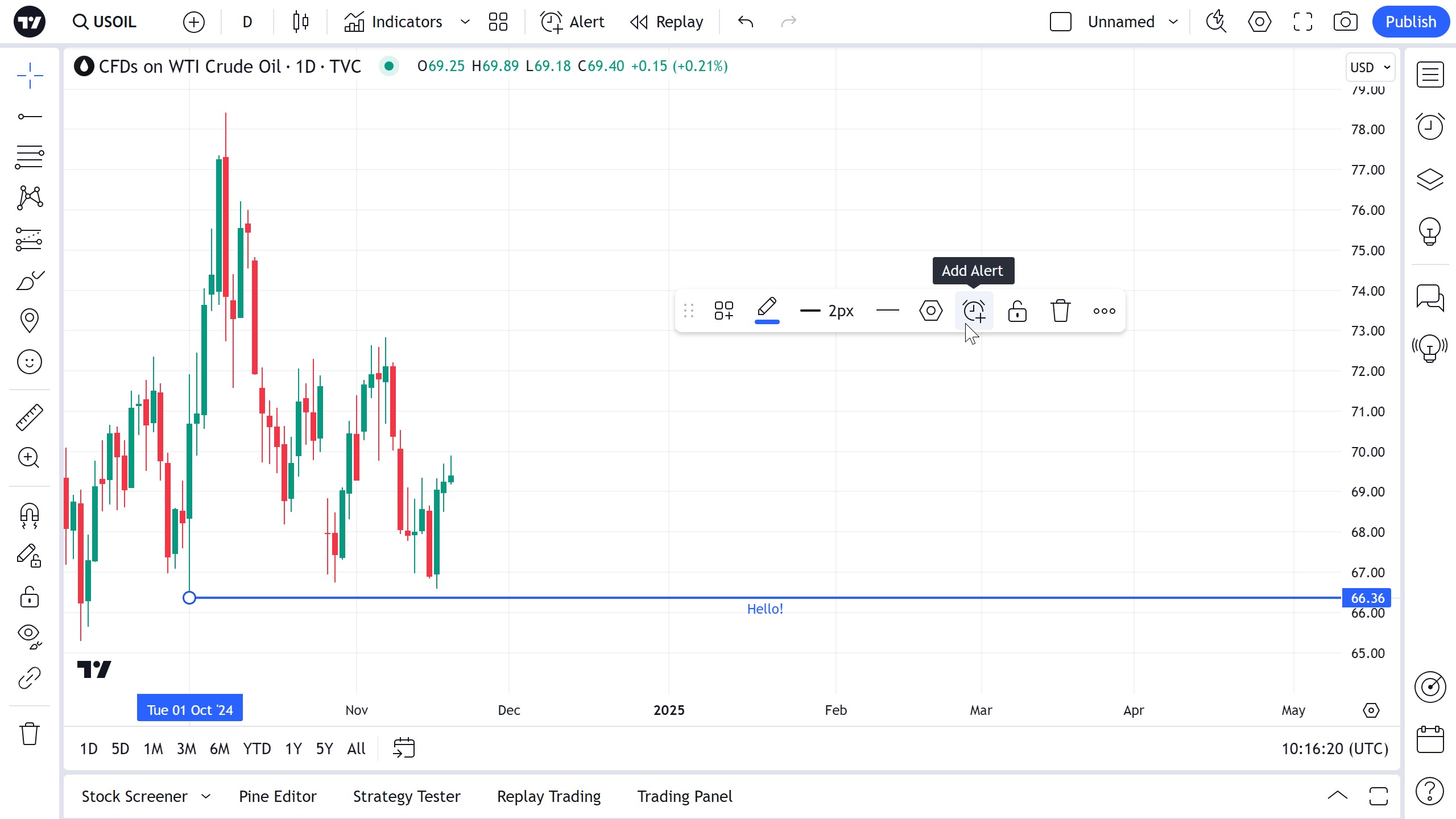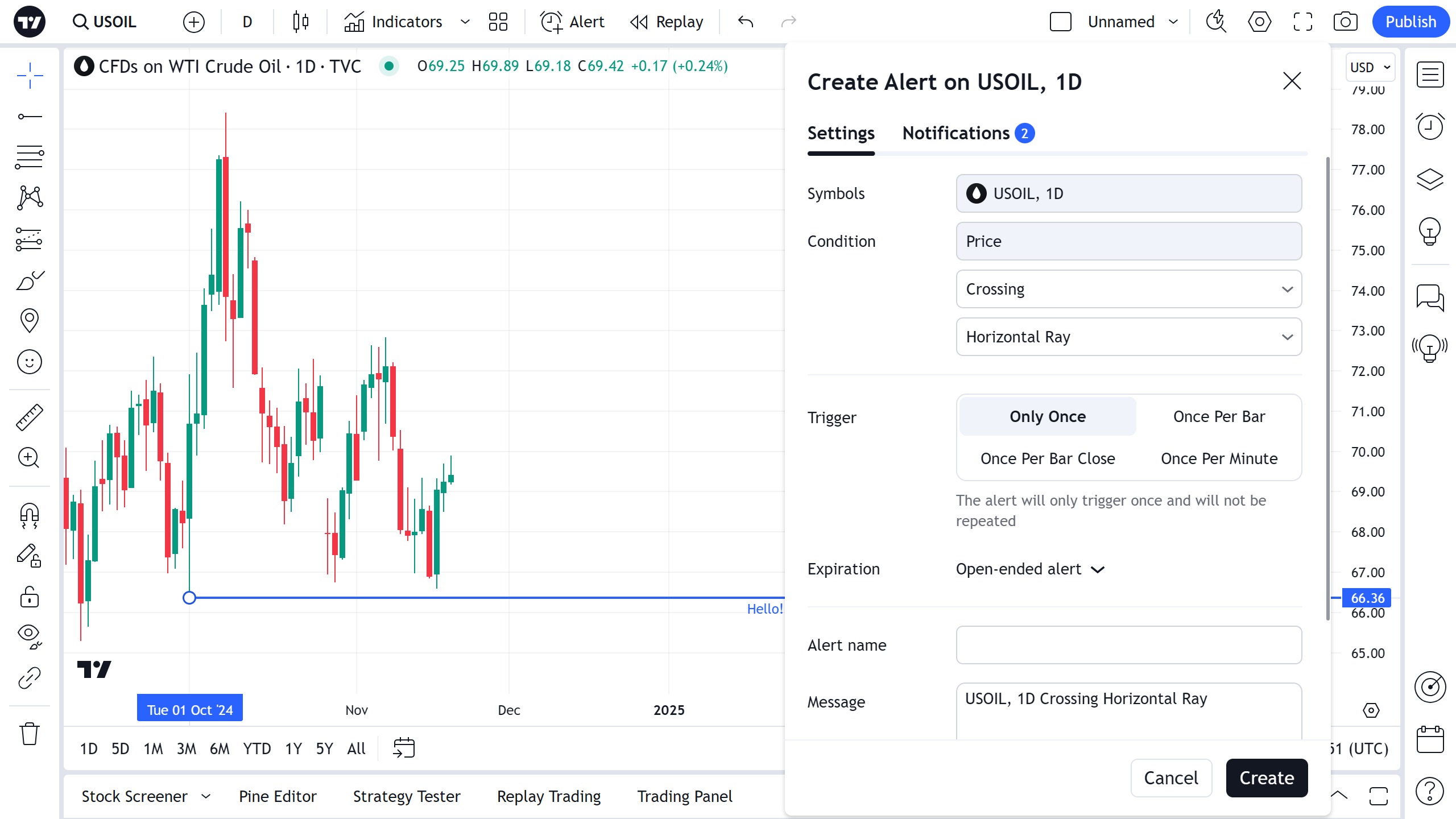 可以设置警报以获取有关图表上穿过水平射线系列的通知。使用浮动绘图工具栏中的时钟图标或水平射线本身的右键单击菜单: