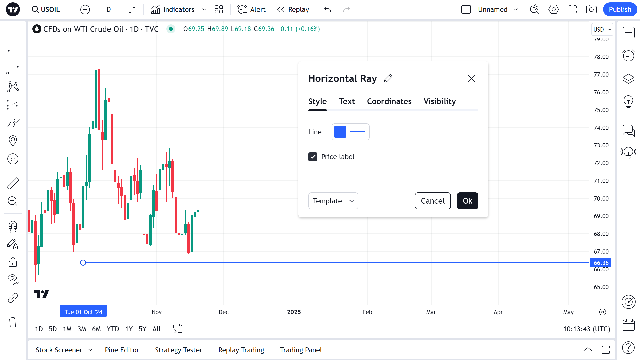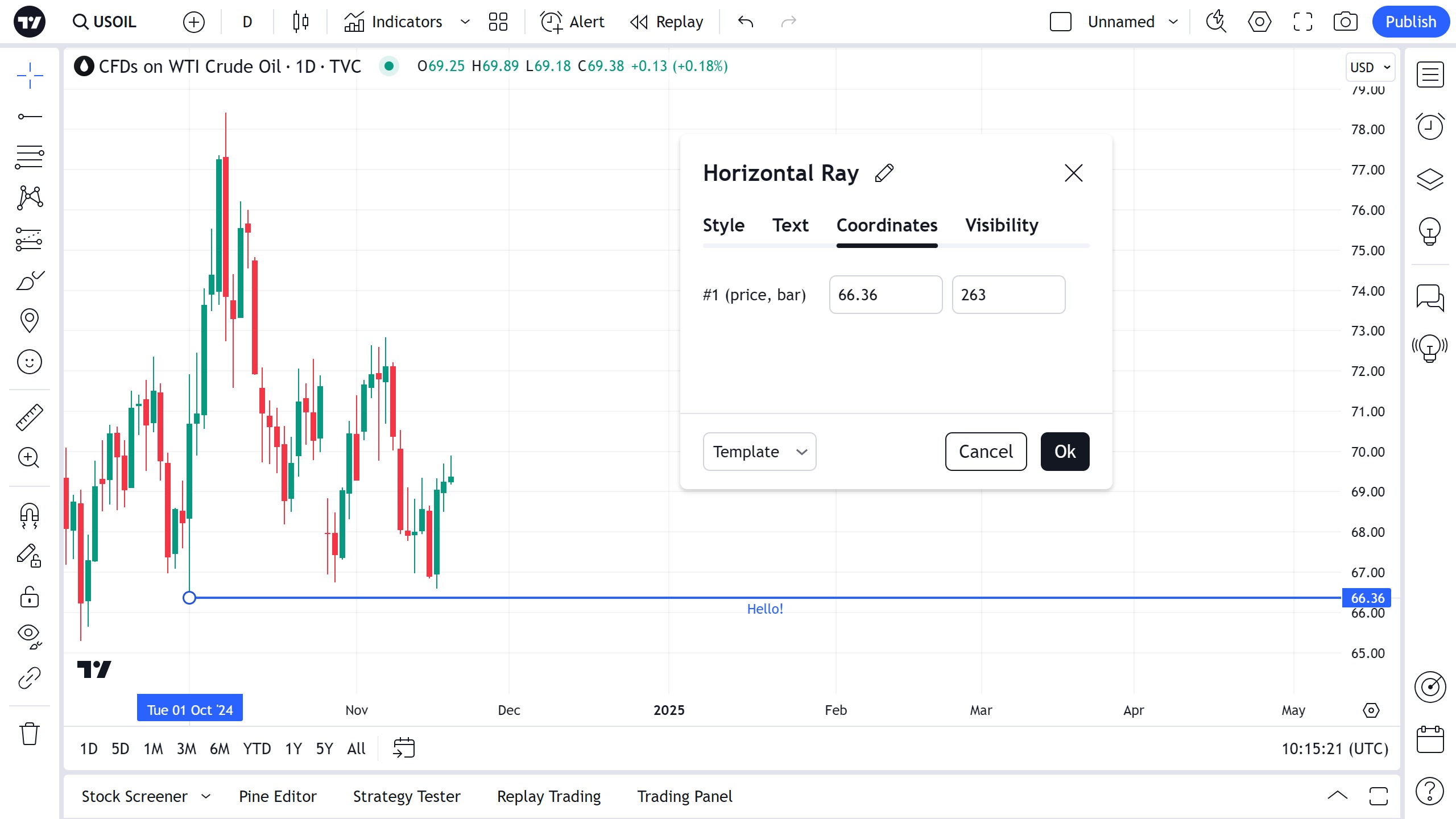 您可以直接在图表上编辑水平射线的文本 — 只需单击文本字段即可输入。