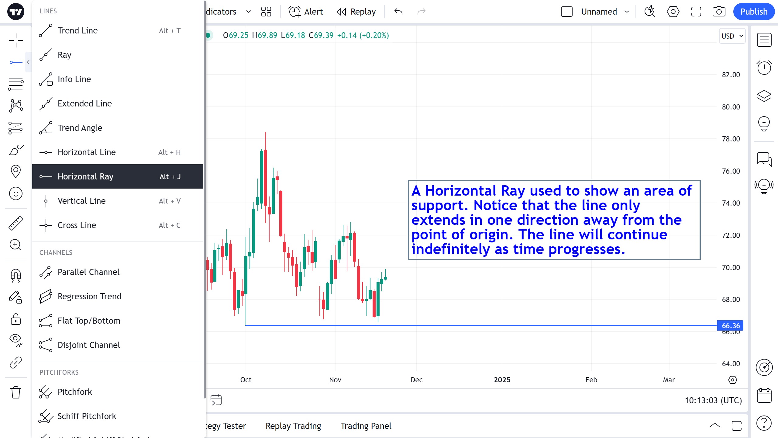 水平射线绘图工具与水平线或射线类似,只是它只在一个方向上从左到右延伸。 用户自行决定放置射线的起点,射线从左向右无限延伸。 要在任何方向绘制射线,请使用射线绘图。