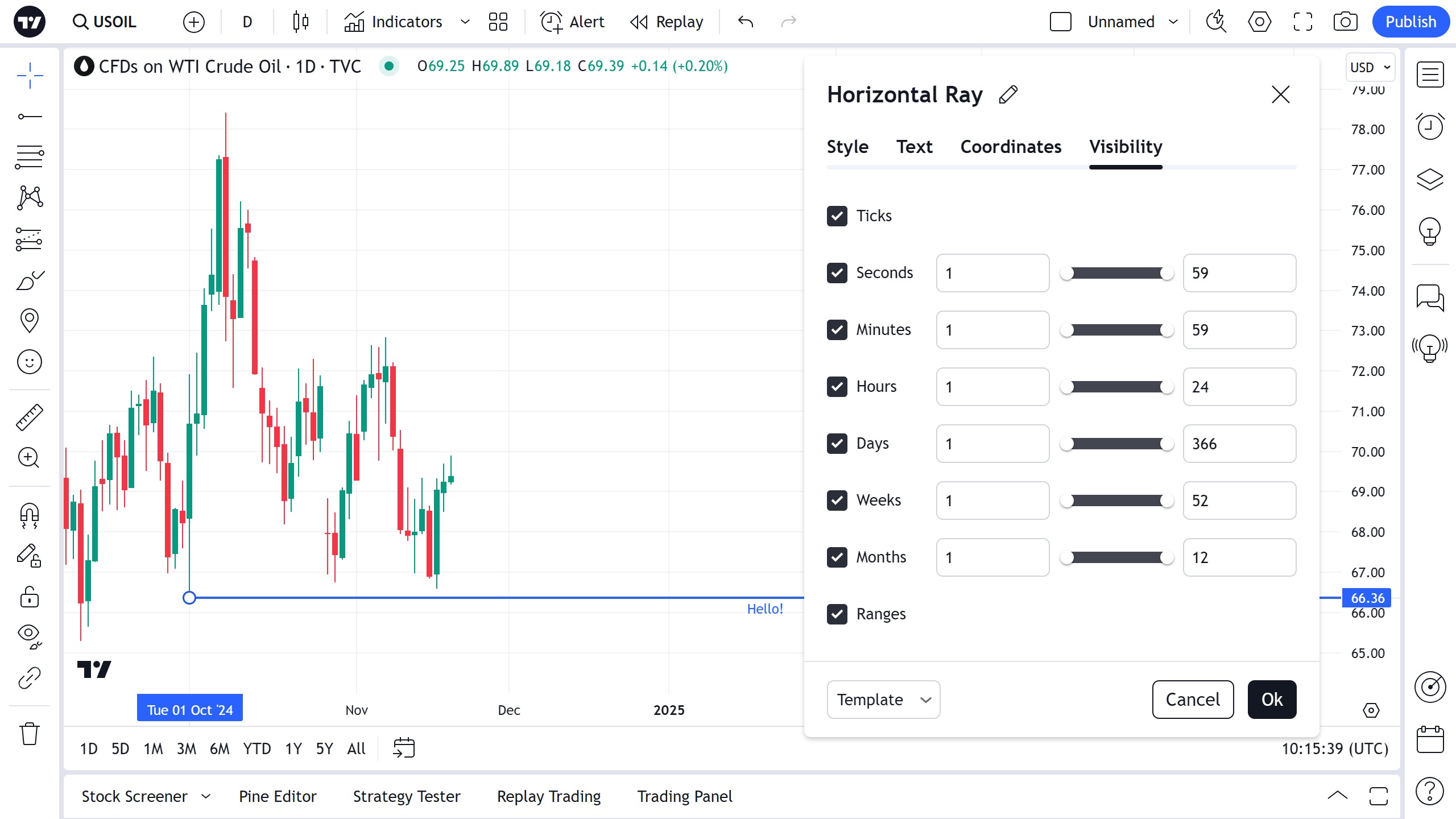 在可见性属性对话框中,您可以在不同时间射线的图表上切换水平射线的显示: