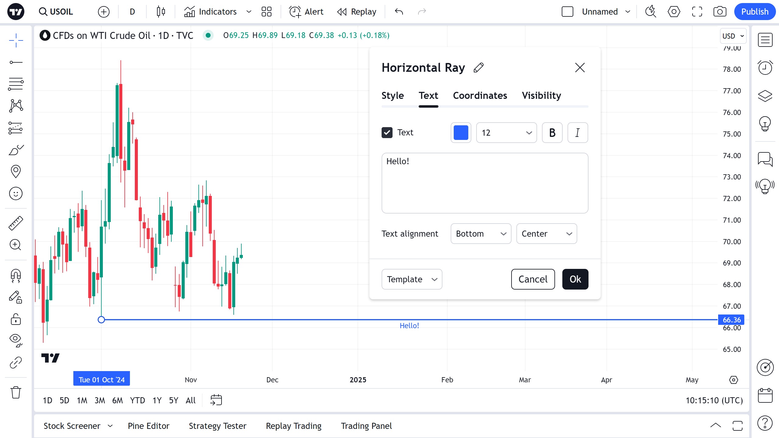 当“文本”复选框处于活动状态时,可以在文本框中输入显示在水平射线旁边的文本。可以在复选框旁边的下拉菜单中指定文本颜色和不透明度、字体大小、粗体和斜体属性。文本对齐下拉菜单允许设置沿水平射线的文本位置。