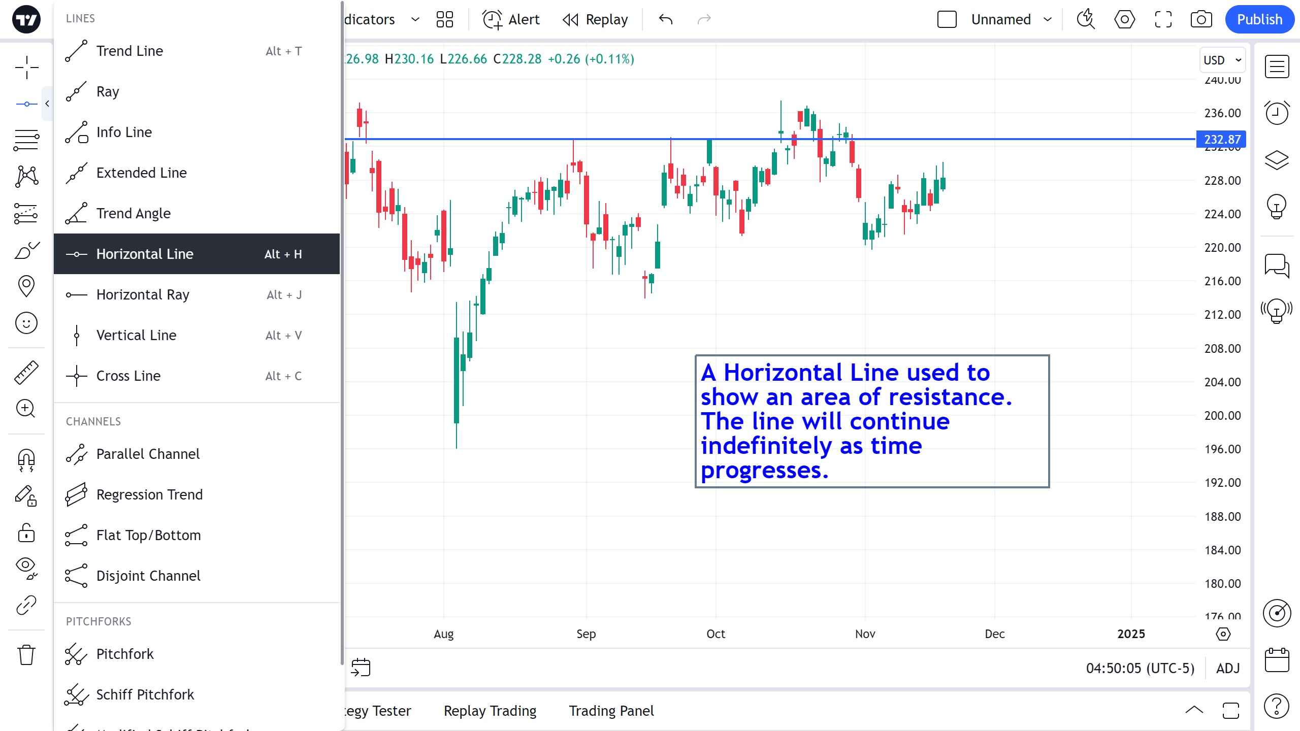水平线通常用于记录特定价格。 在标记支撑和阻力水平时,它们也非常有用。 与延长线(可以向任何方向绘制)非常相似,水平线会无限期地沿各自的方向延伸。