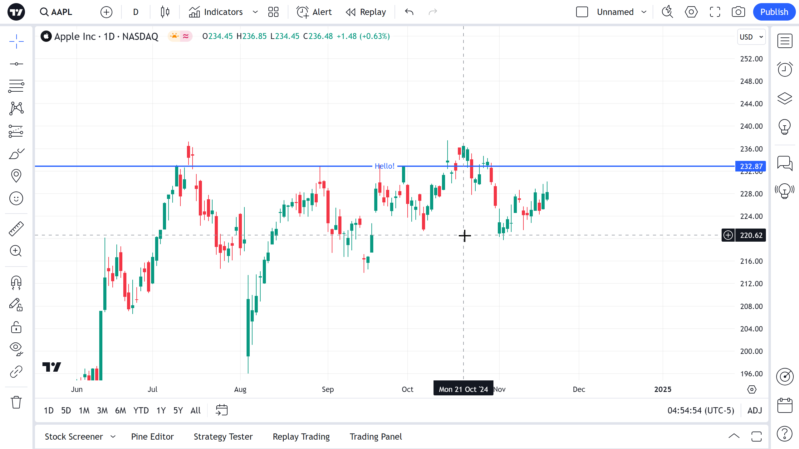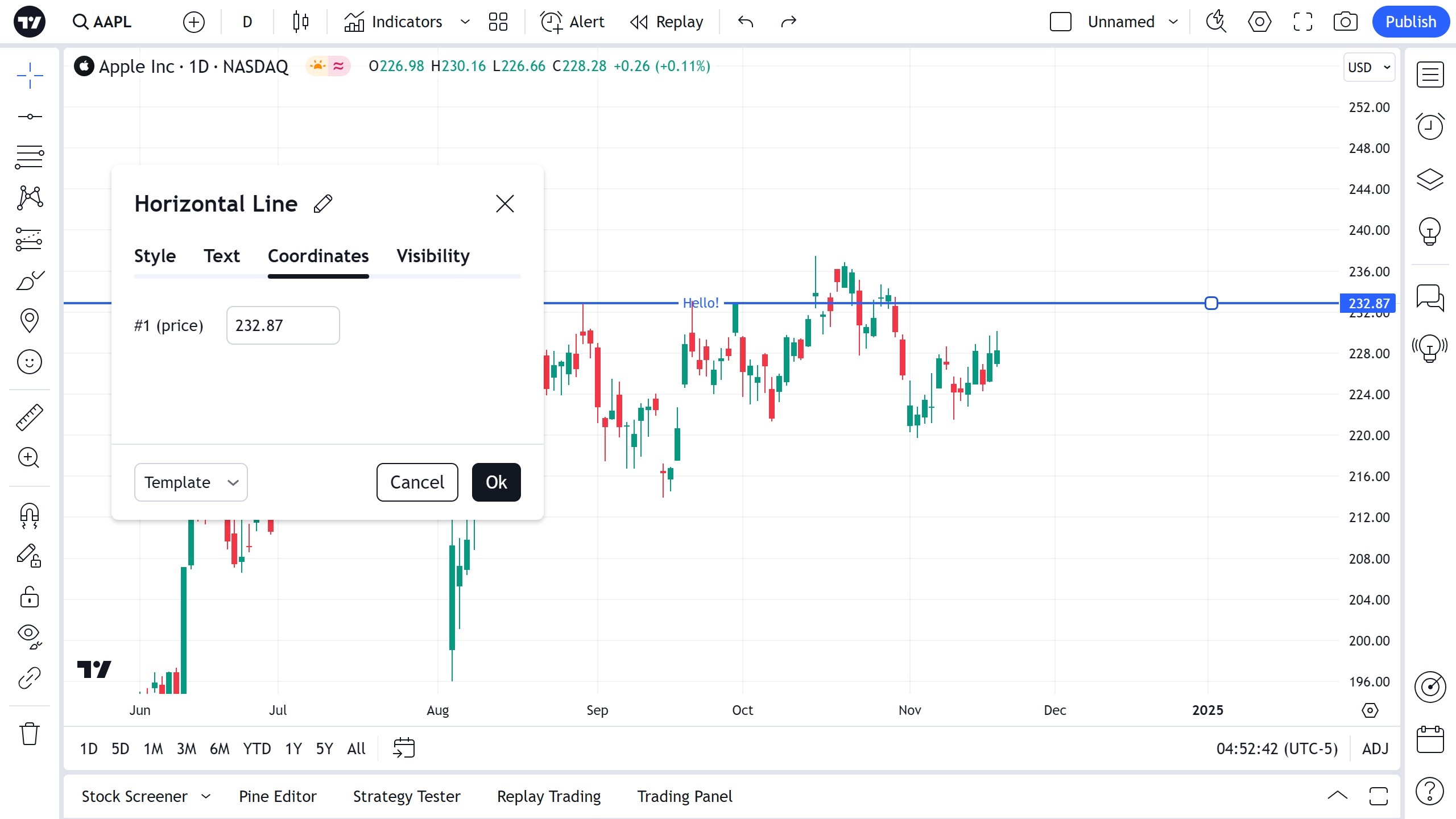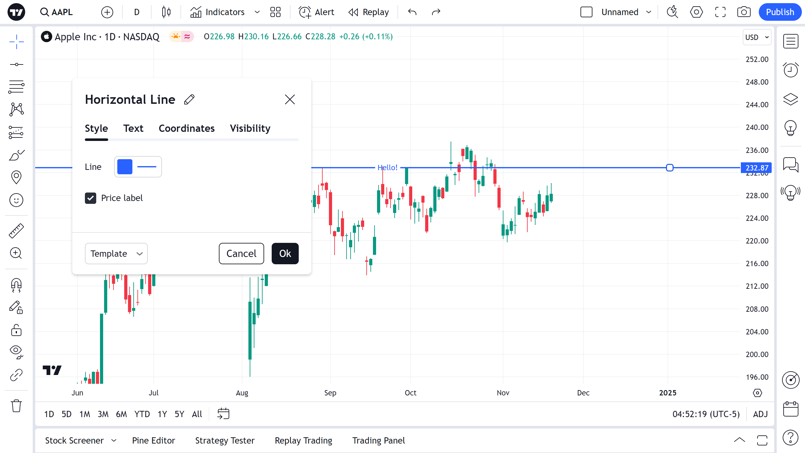 您可以直接在图表上编辑水平线的文本 — 只需单击文本字段即可输入。