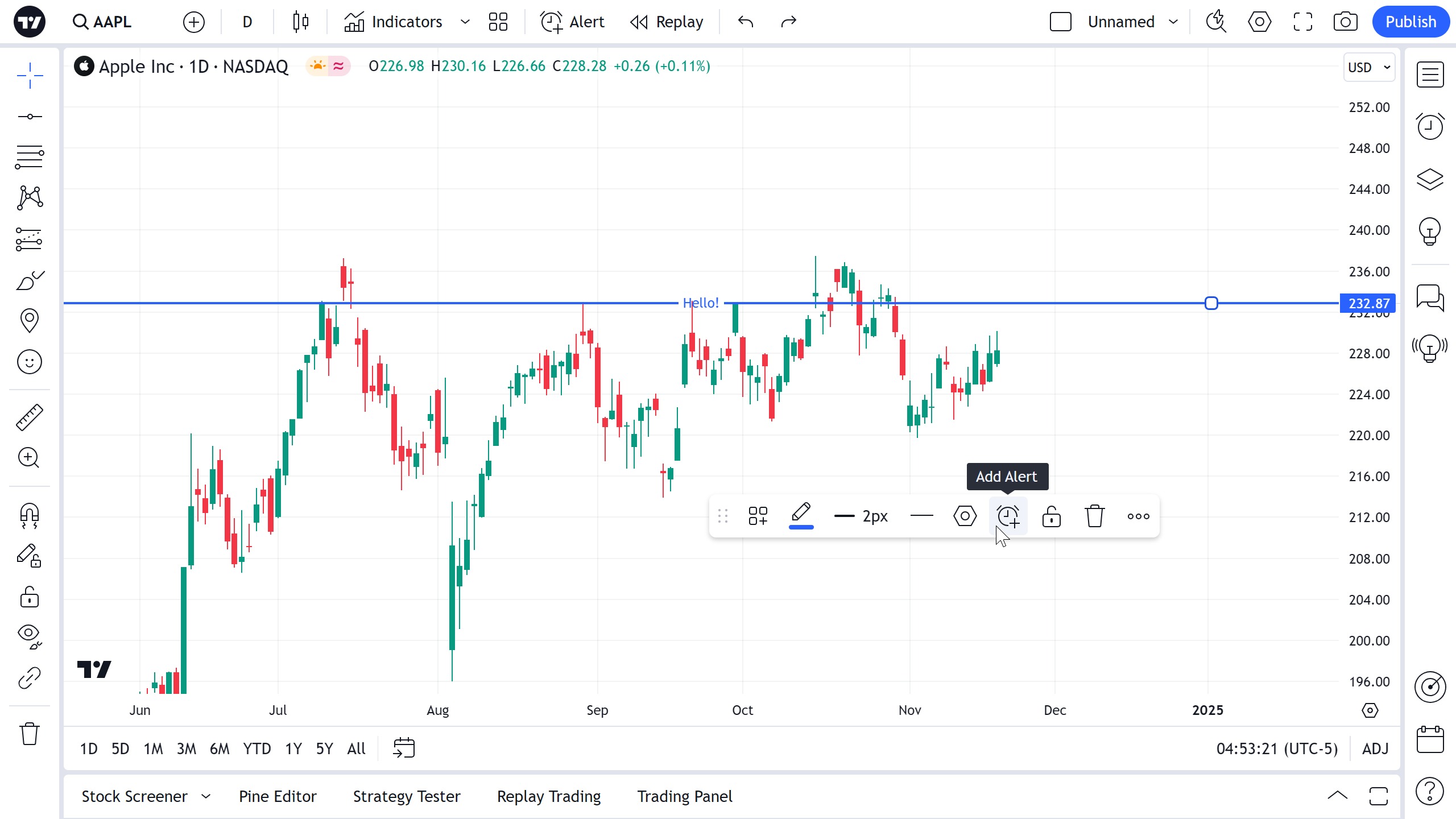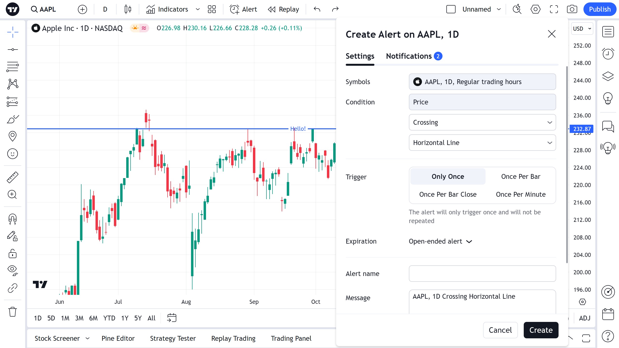 可以设置警报以获取有关图表上穿过水平射线的系列的通知。 使用浮动绘图工具栏中的时钟图标或水平线本身的右键单击菜单: