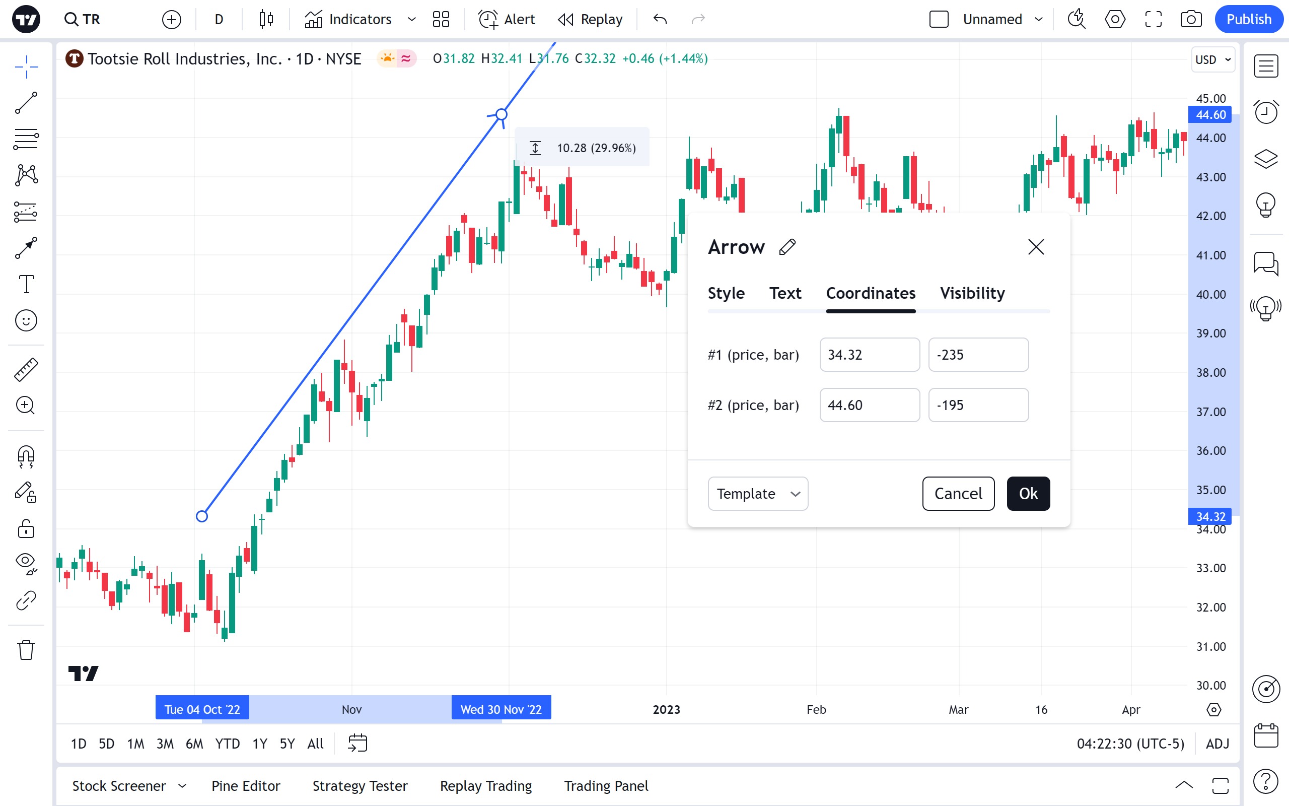 在坐标属性对话框中,您可以精确设置箭头端点在价格坐标(通过设置价格)和时间坐标(通过设置条形图编号)上的位置: