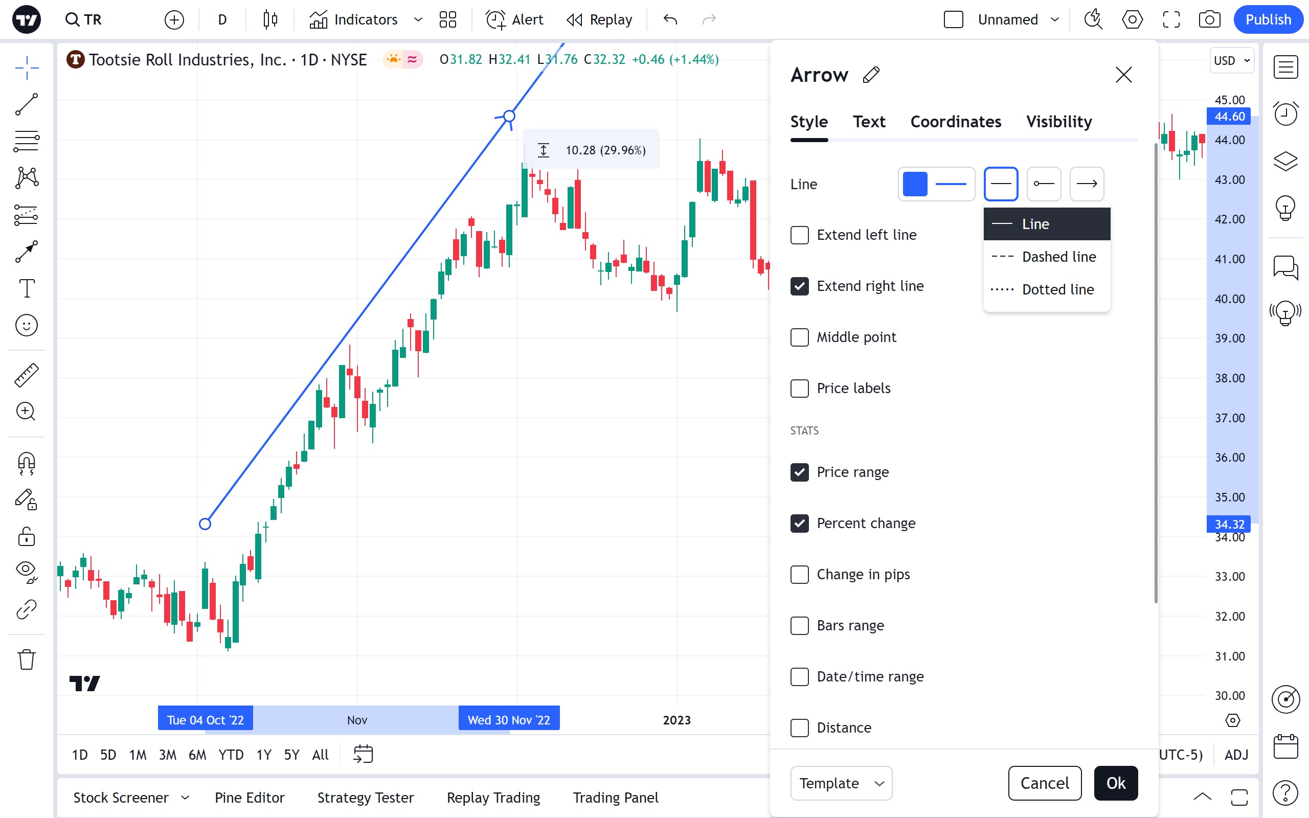 复选框价格范围、百分比变化、点数变化、条形范围、日期/时间范围、距离、角度允许在图表上的箭头线旁边显示带有相关信息的标签。