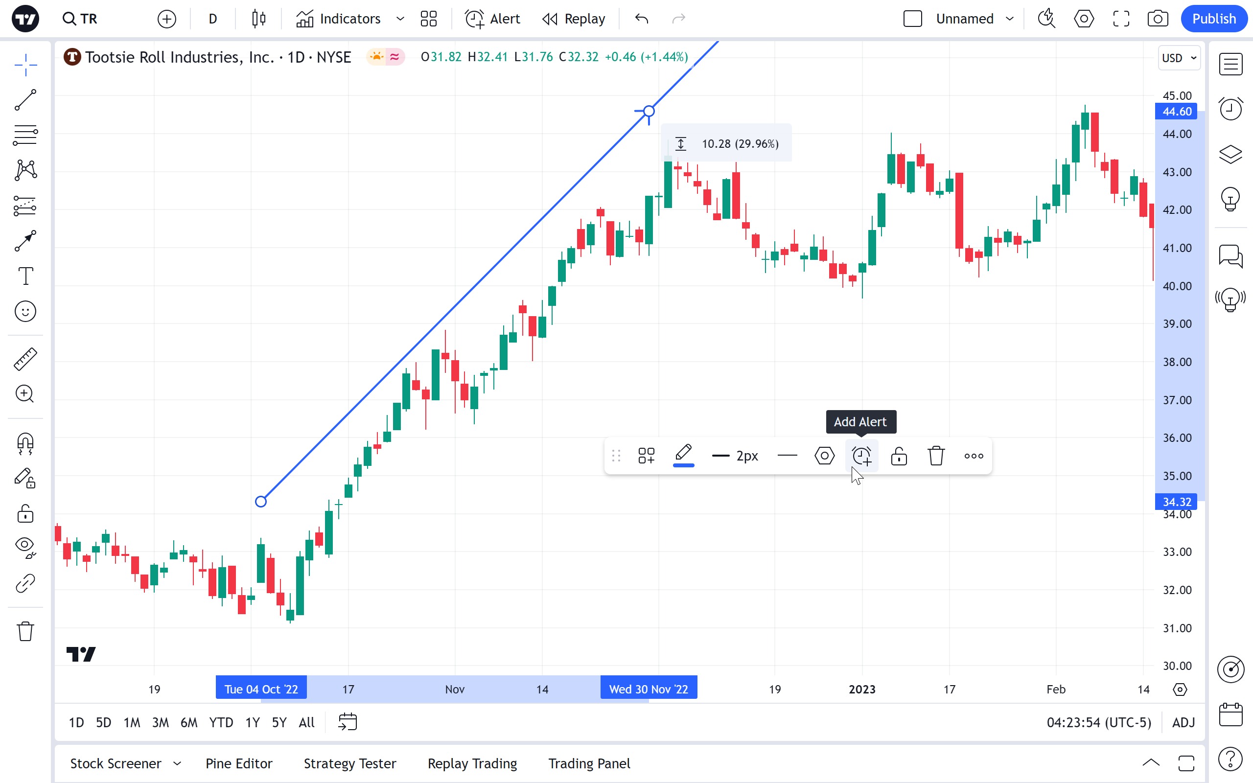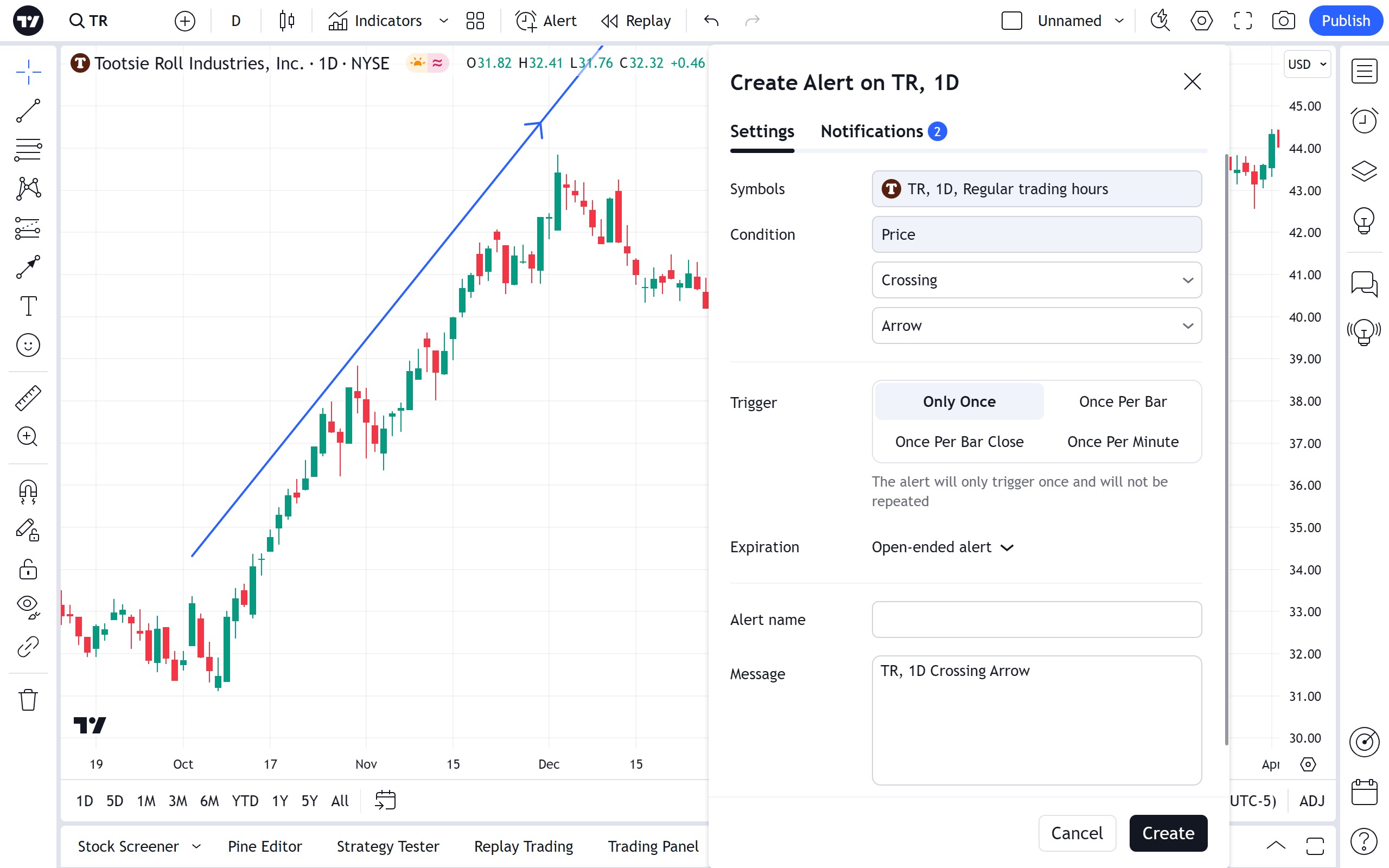 可以设置警报以获取有关图表上越过箭头的系列的通知。 在浮动绘图工具栏或箭头本身的右键菜单中使用时钟图标: